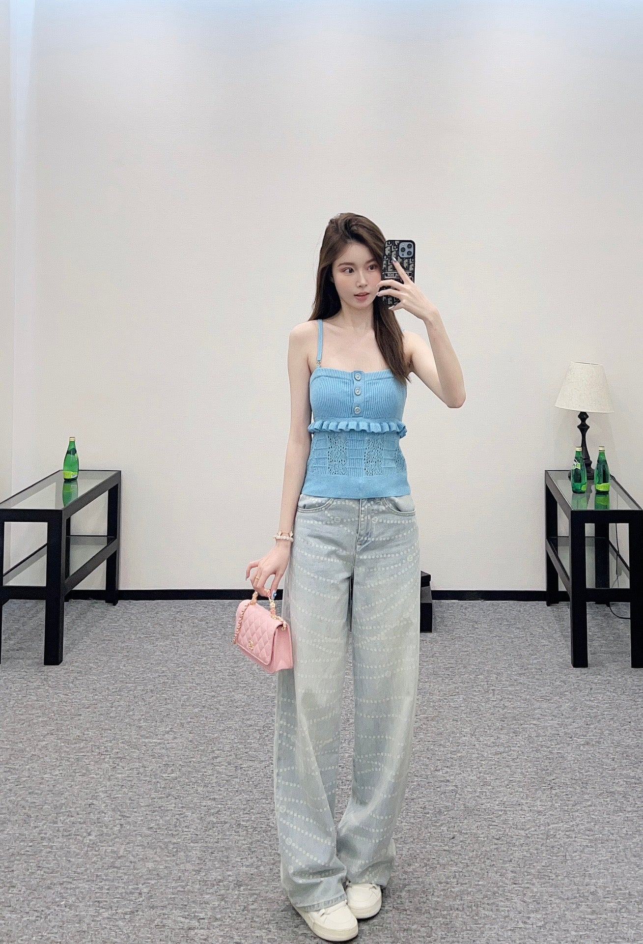Customized YB cashmere yarn weaving Delicate texture Breathable and comfortable Knitted sling cut Thin shoulder straps add a fashionable tone All solid color Use layered three-dimensional lace to divide the chest and abdomen The buttons on the chest are inlaid with diamonds Gorgeous and shining highlights Matching elastic fabric Fits the body shape and makes it look thinner The shoulder straps are decorated with double C letter logos to show the brand tone Black woven thread with fine glitter Versatile style does not pick age and skin color More relaxed and holiday feeling The upper body is suitable for a fashionable style of reducing age Customized surface and accessories Look for the version High version