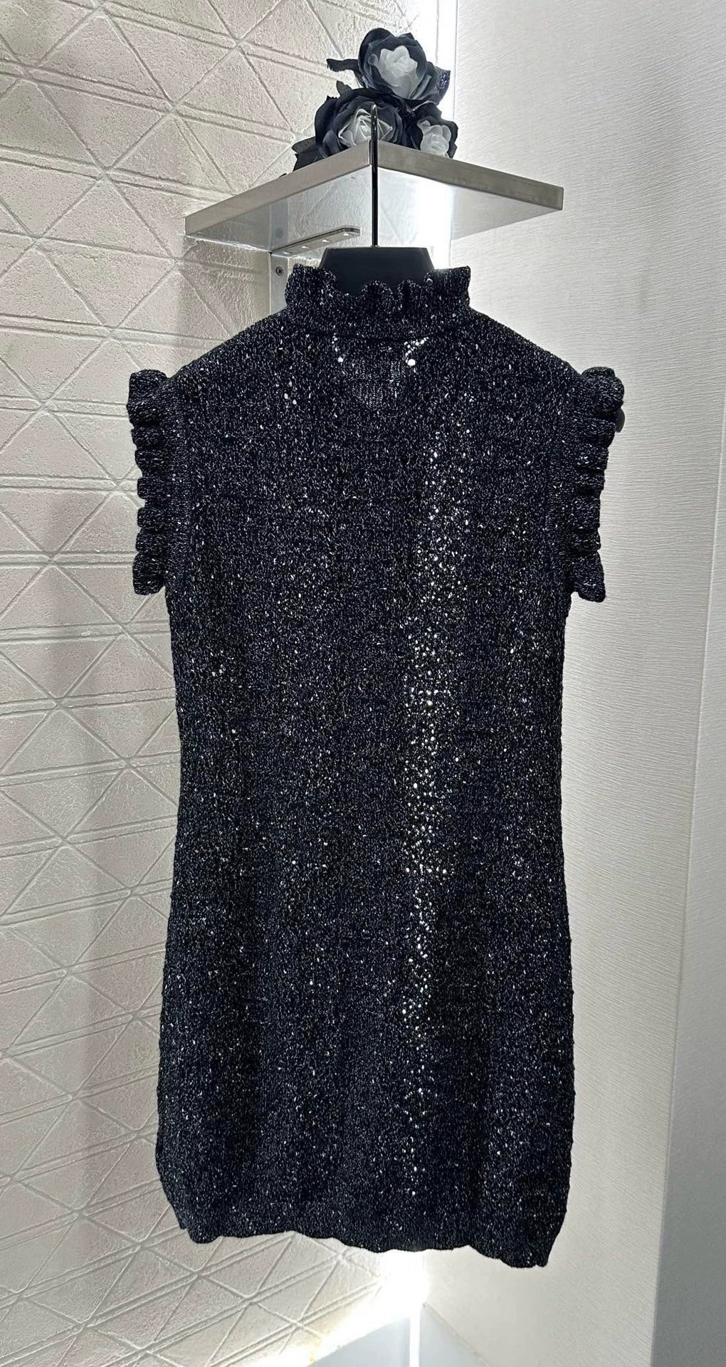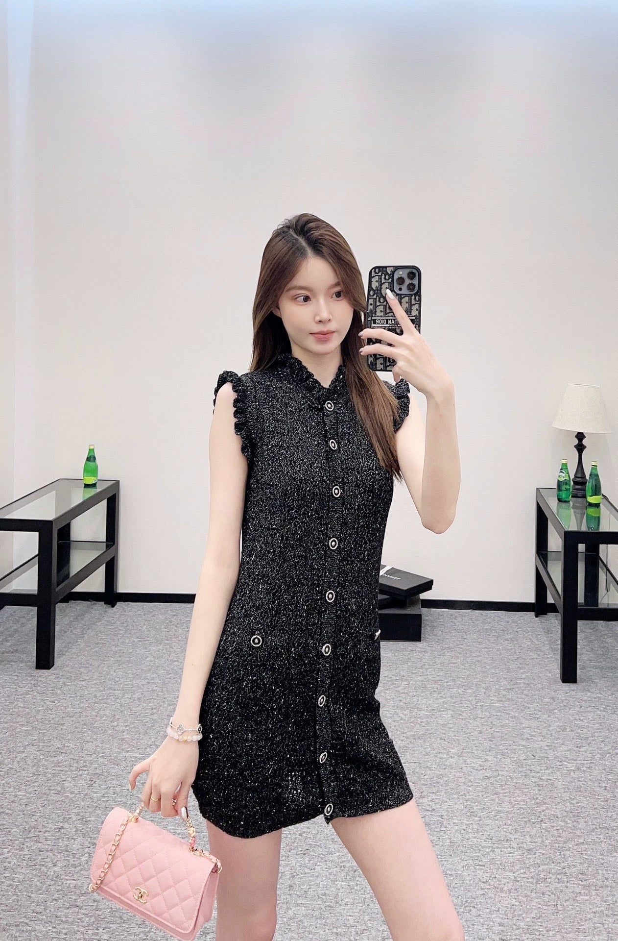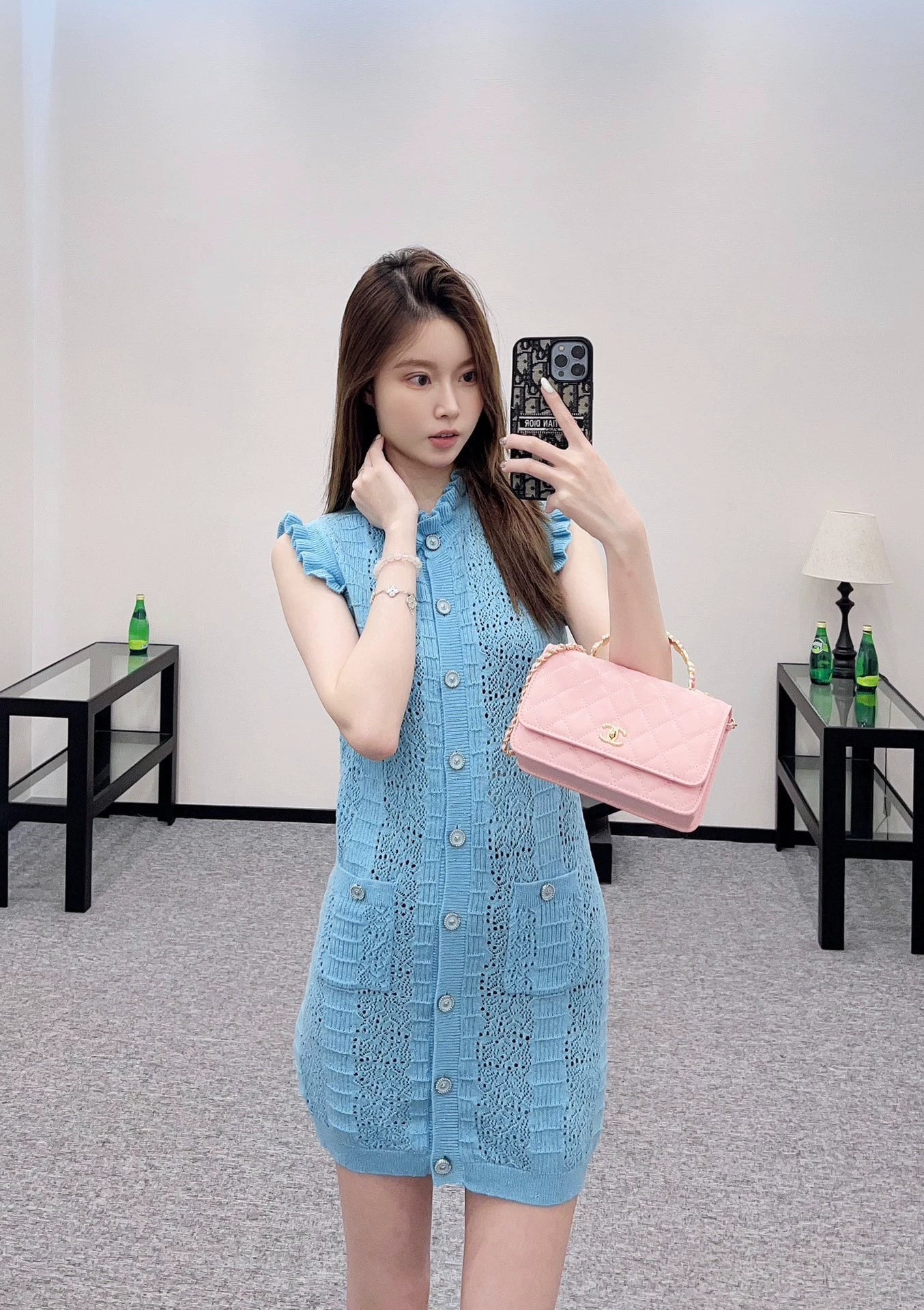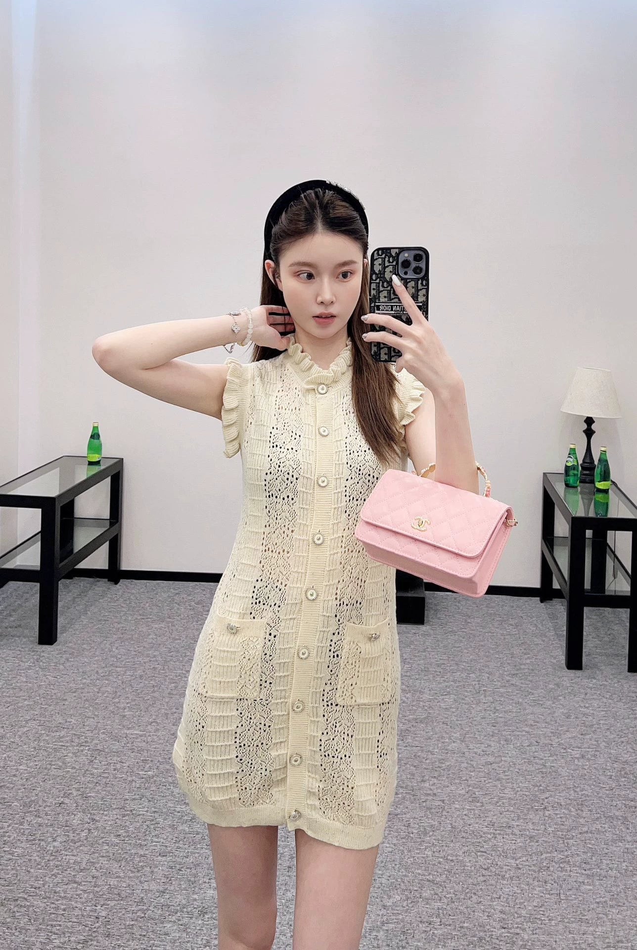 Woven from custom YB cashmere wool yarn, this is delicate, soft, and stretchy. This exquisite lace-collared vest skirt features a collar and cuffs outlined with 3D quilted lace. The detailing is impeccable. The basic style is accented with a large, vertical cutout body. The signature Flying Swallow round buckle logo is embellished with gold and silver thread, creating a striking retro, elegant look. It's effortlessly relaxed and youthful, perfect for everyday wear. Custom fabrics and accessories are available. Look for the high-end version.