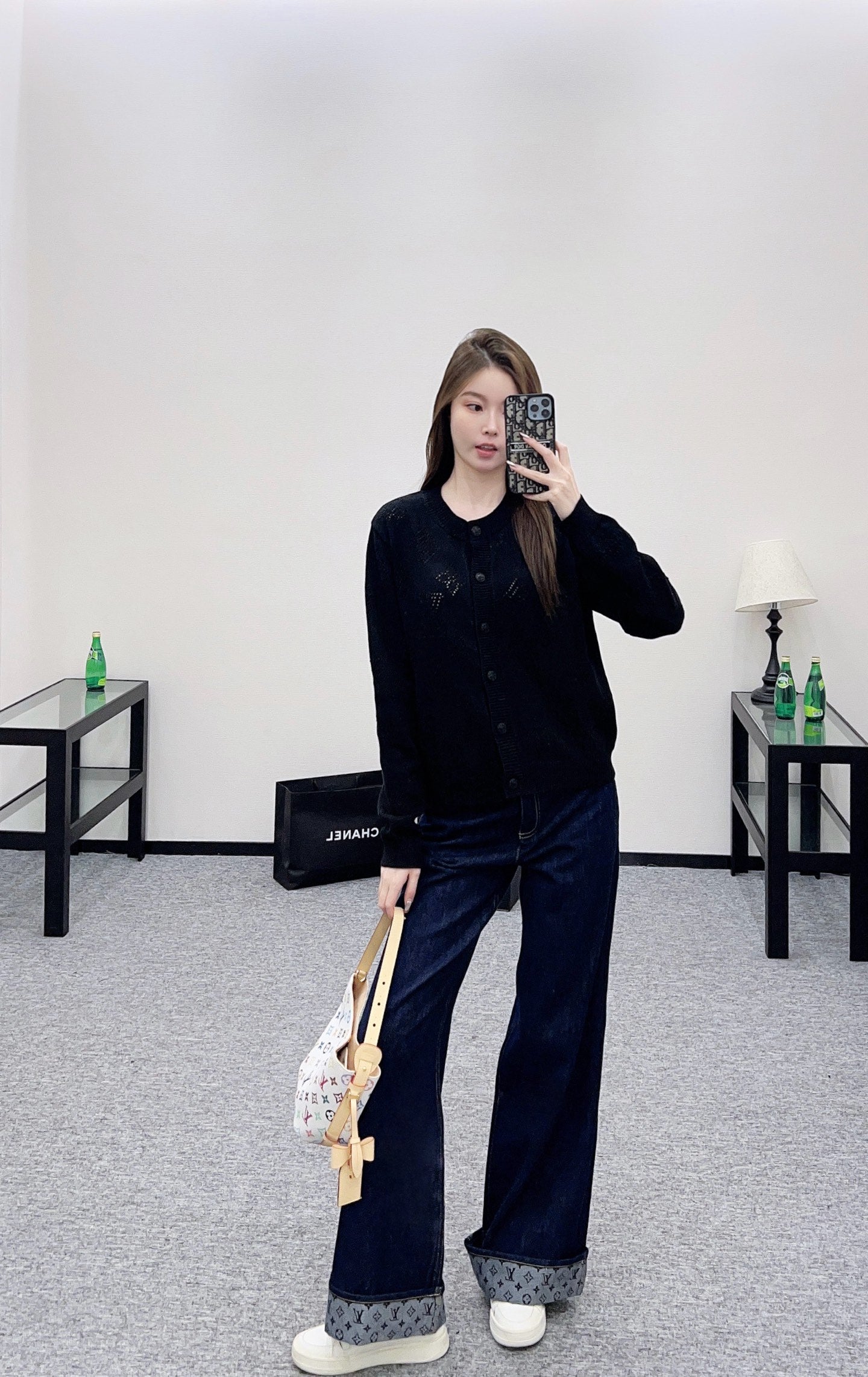 L 25 Openwork Knit Crew Neck Wool and Cashmere Cardigan