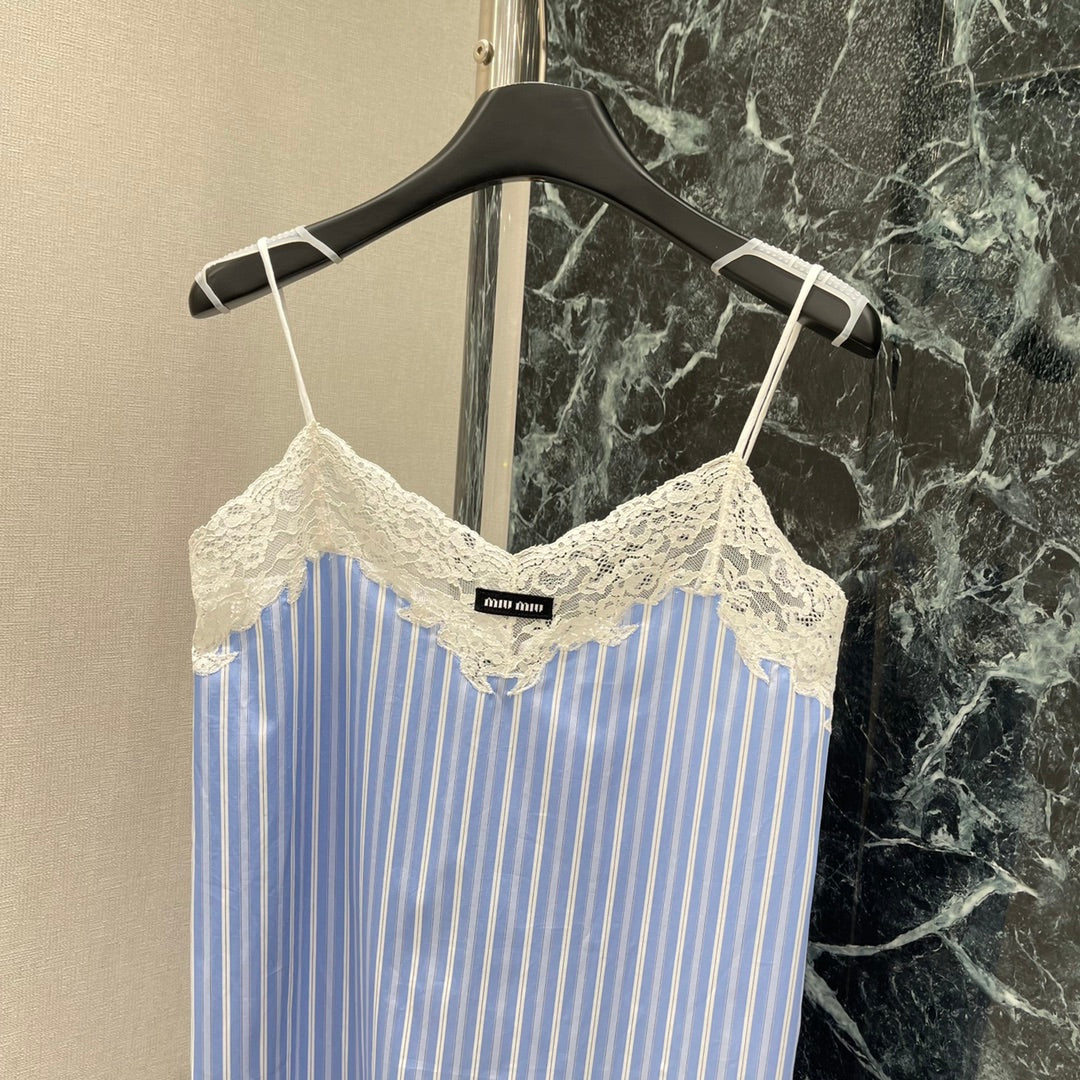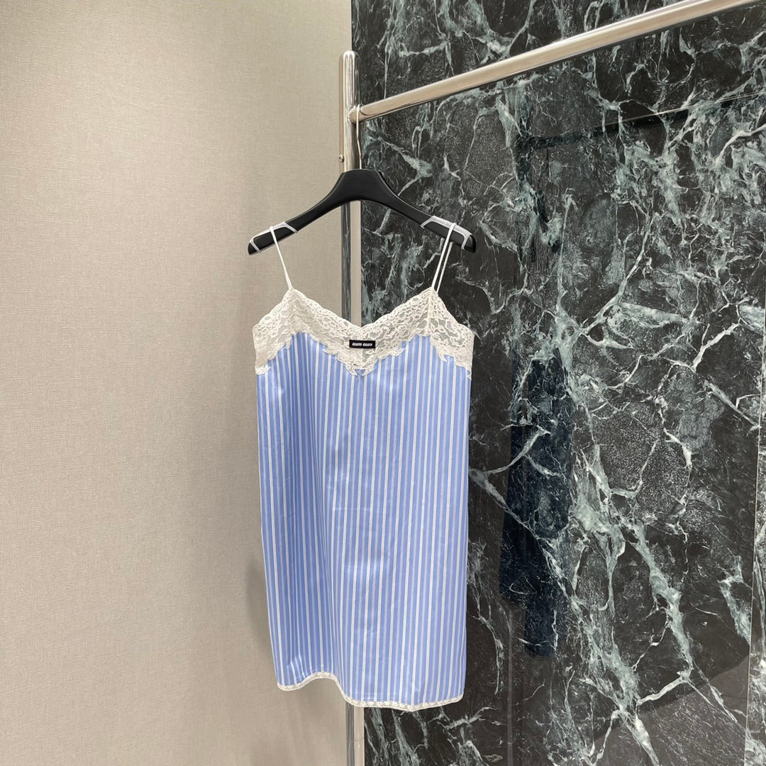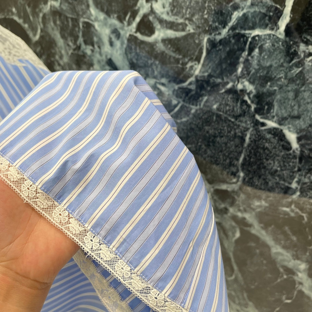 The whole body is interwoven with vertical blue and white stripes. It is loose and fashionable with a sense of literary youth and old money. The chest is decorated with clear water-soluble lace, which is sexy and charming. The letter logo on the chest highlights the taste. The upper body is elegant and lazy, full of holiday feeling. It can be worn at home or outside
