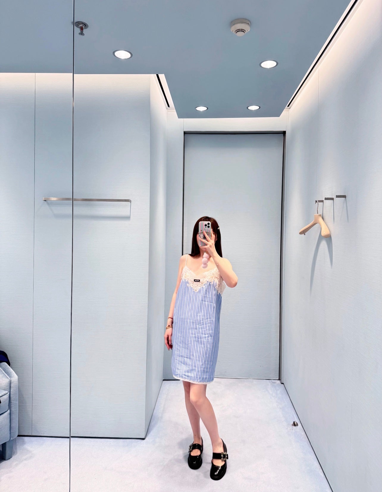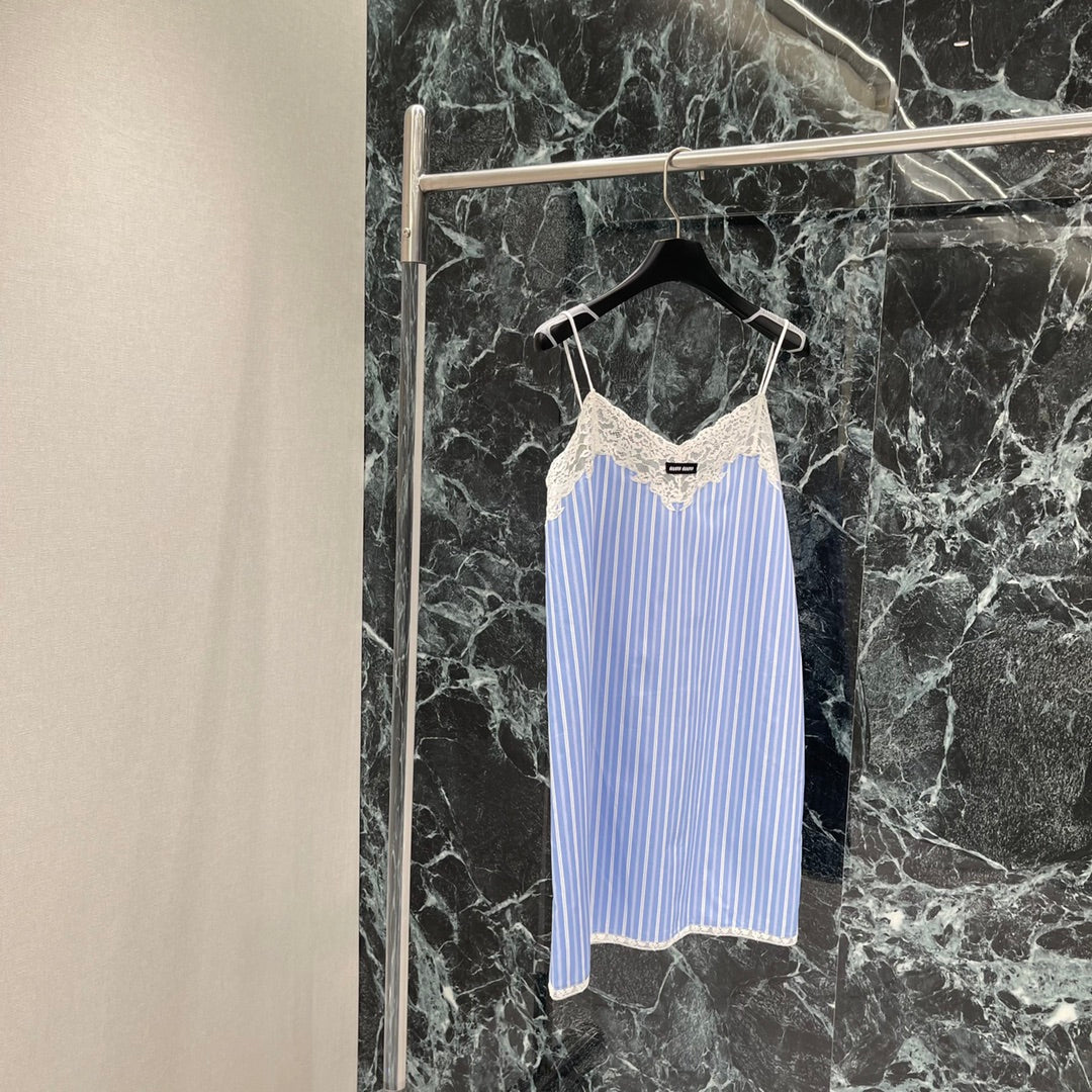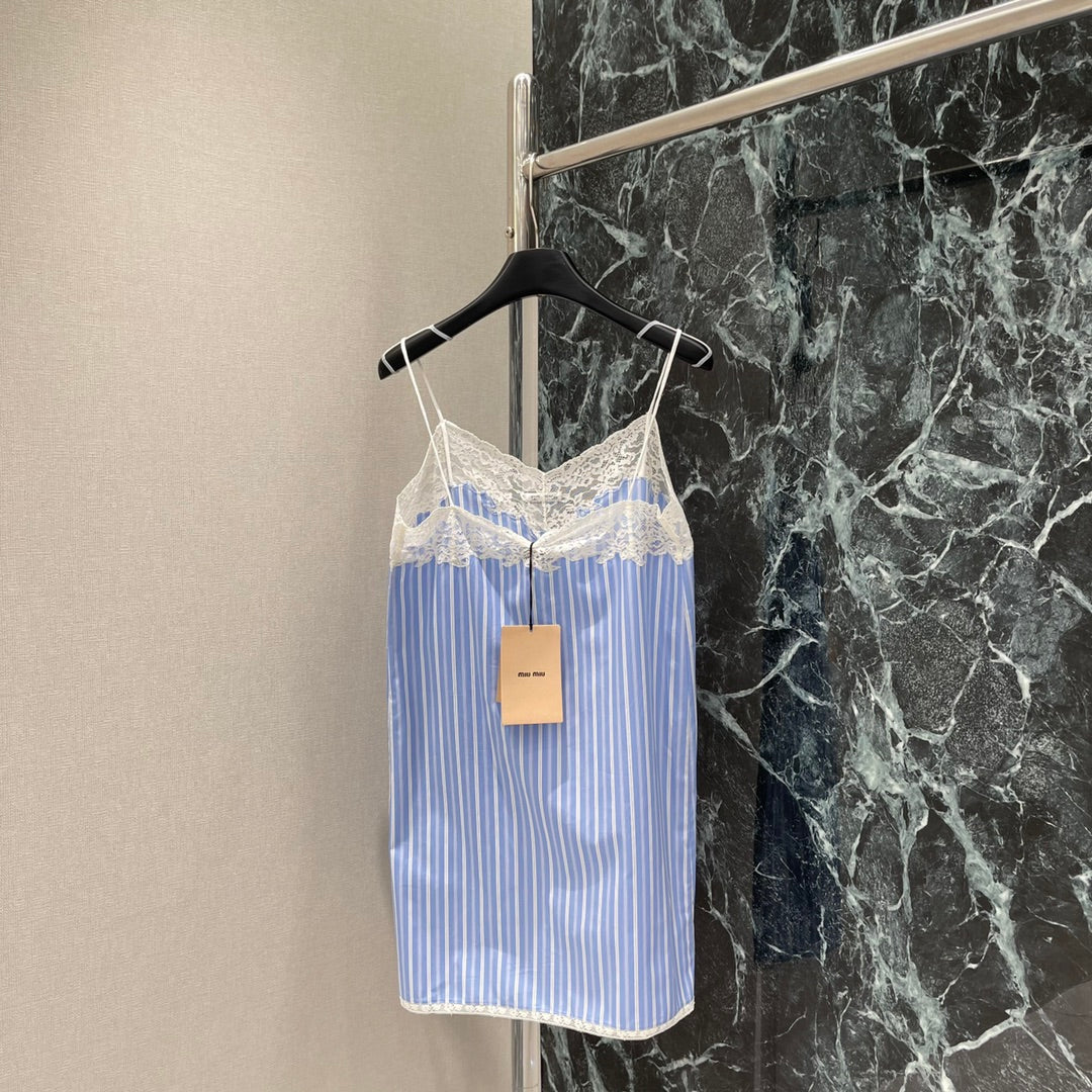 The whole body is interwoven with vertical blue and white stripes. It is loose and fashionable with a sense of literary youth and old money. The chest is decorated with clear water-soluble lace, which is sexy and charming. The letter logo on the chest highlights the taste. The upper body is elegant and lazy, full of holiday feeling. It can be worn at home or outside