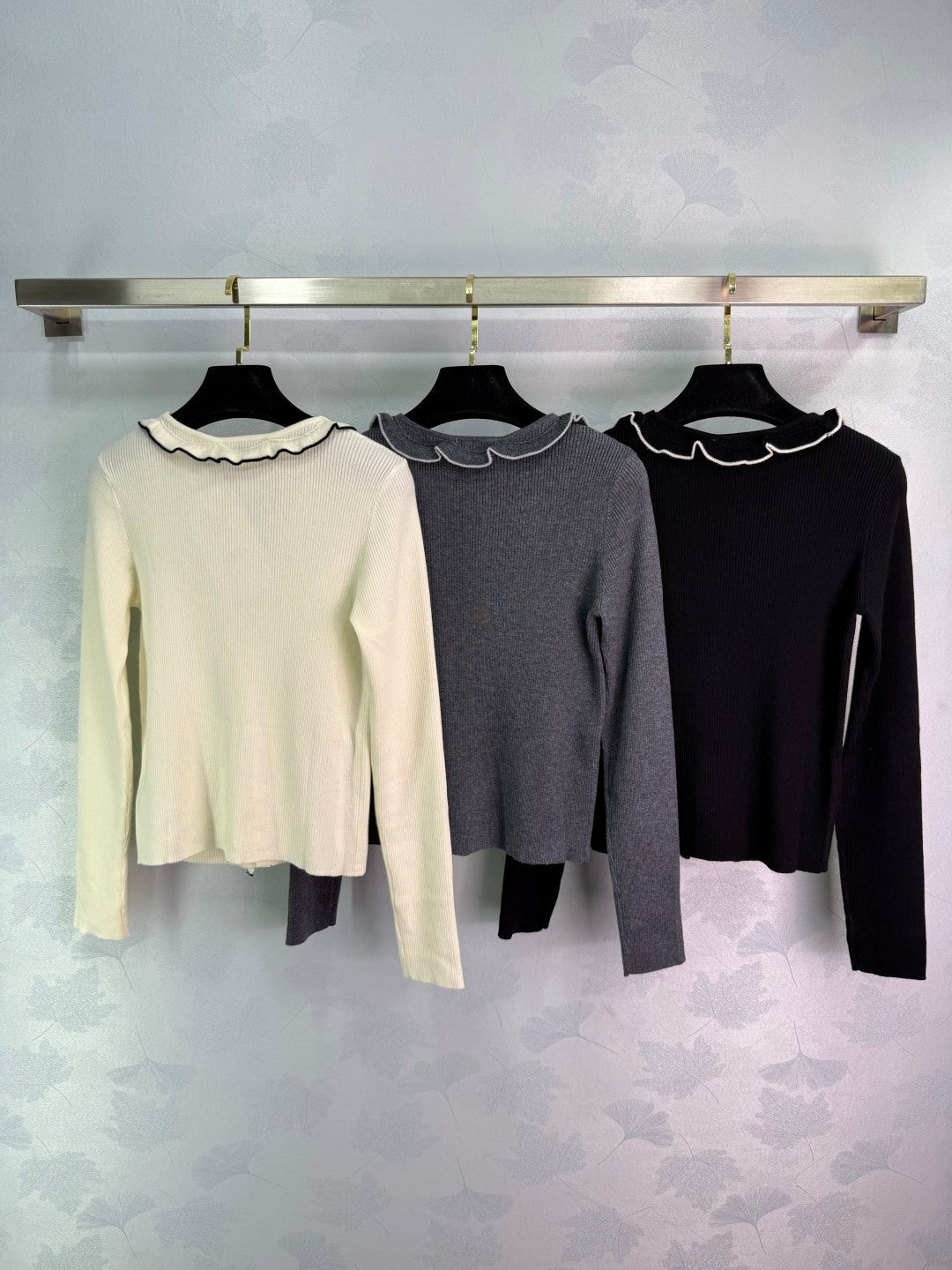 Maßgeschneidertes YB-Wollgarn, weich und hautfreundlich, bequem und stilvoll. Blumen-Cardigan-Stil. Der Ausschnitt ist genau richtig, um die Haut freizulegen, wodurch das Verhältnis von Kopf zu Schulter schlanker wirkt. Der Kragen ist mit Spitze versehen und bis zur Vorderseite verlängert. Die Falten sind zu einer Blütenform verflochten. Reichhaltige Details. Das Bienen-CD-Buchstabenlogo ist an der Taille verziert. Elastische, schmale Passform. Es sieht schlank und elegant aus.