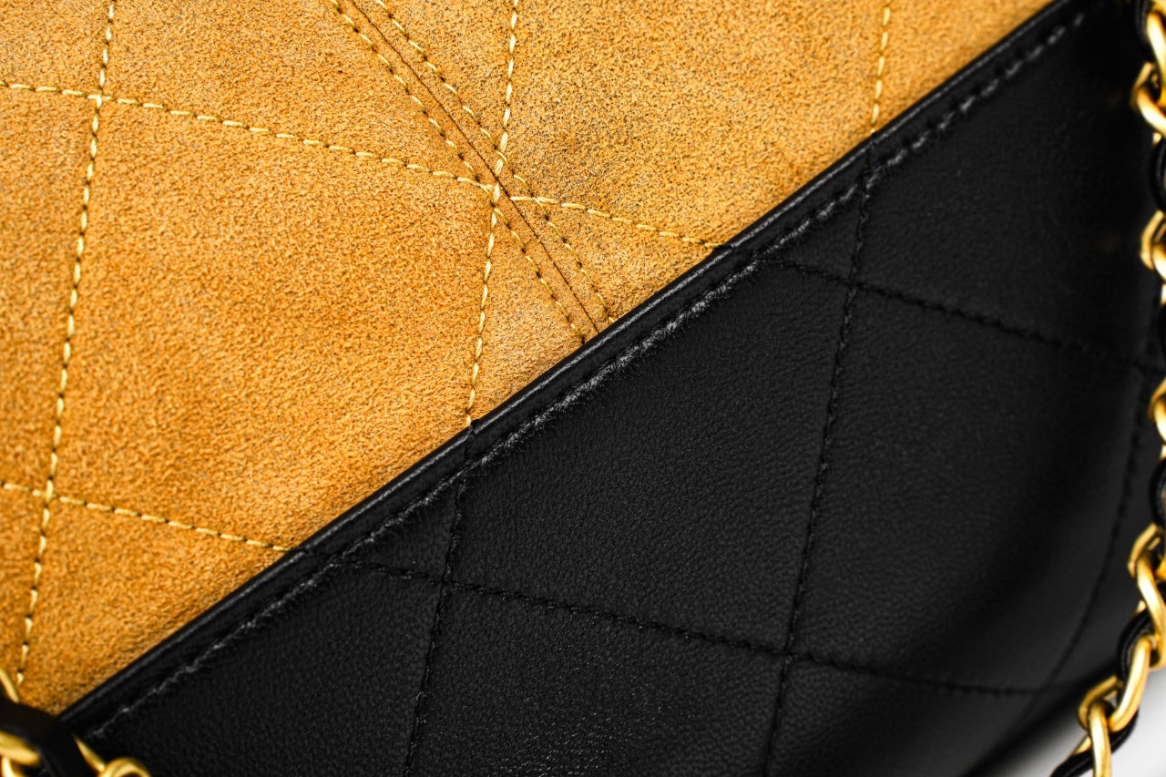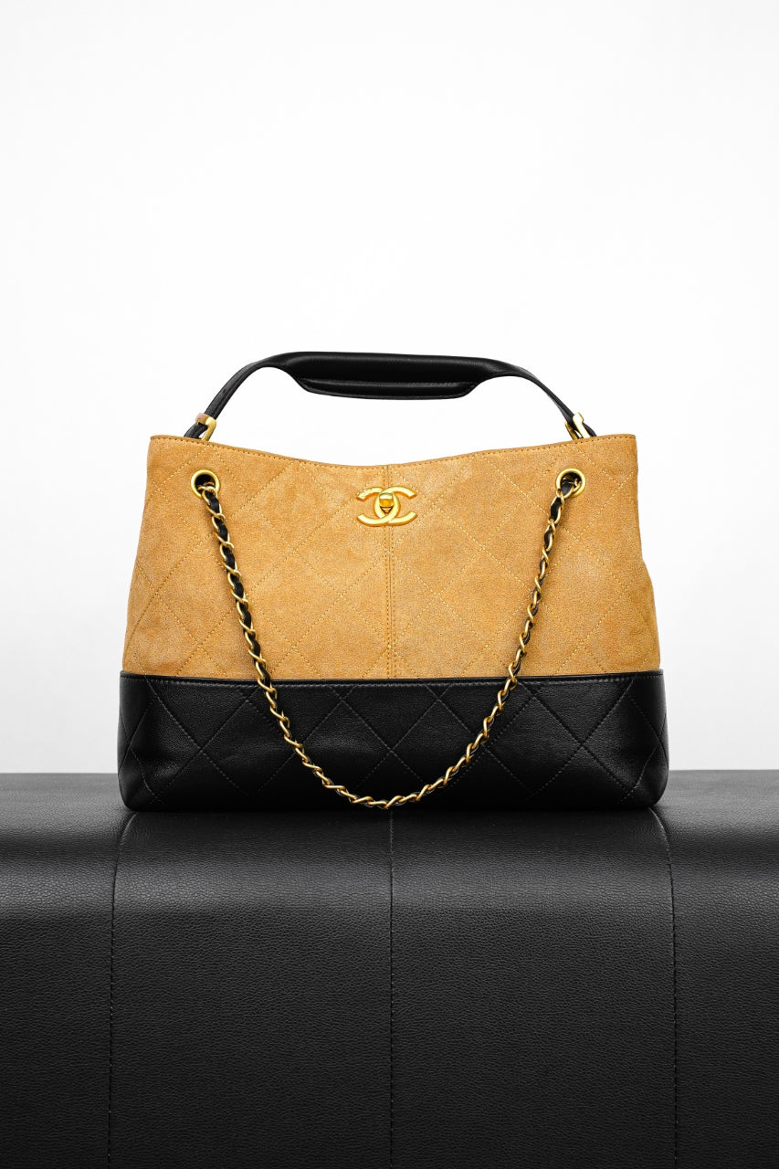 Diese Tasche aus einer Kombination aus beigem Ziegenveloursleder und glänzendem schwarzem Lammleder bietet einen markanten Kontrast zwischen matten und glänzenden Texturen. Sie bewahrt klassische Eleganz und verleiht ihr gleichzeitig einen modernen, dekonstruierten Stil. Der sanfte Beigeton gleicht die Härte des Schwarz aus und eignet sich daher für den legeren Weg zur Arbeit oder halbformelle Anlässe.
