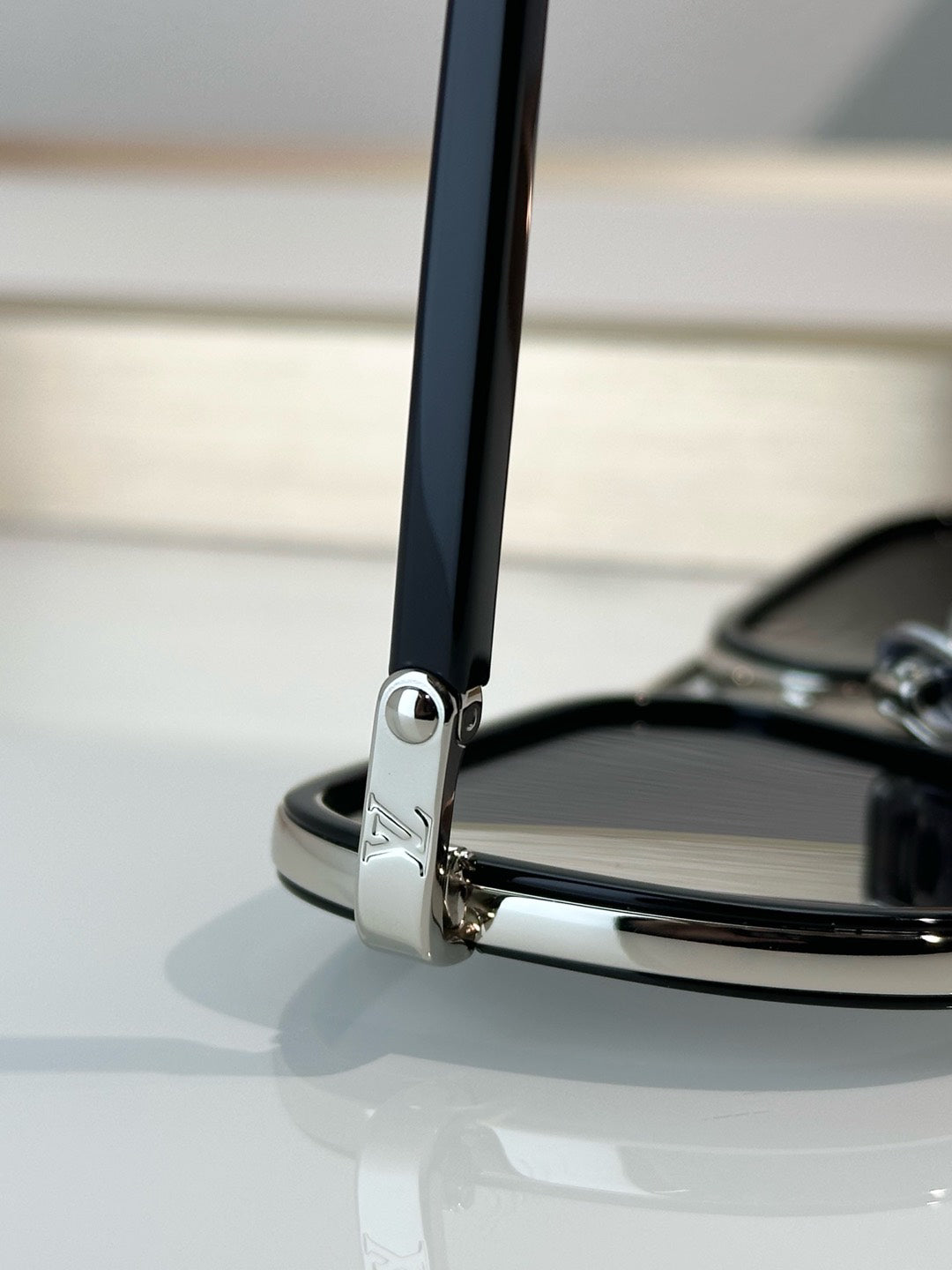 Frog Mirror ~ La finition argentée sur les verres et la monture en acétate ajoute une touche moderne à la silhouette classique, tandis que les initiales gravées sur la charnière sont le logo de la marque
