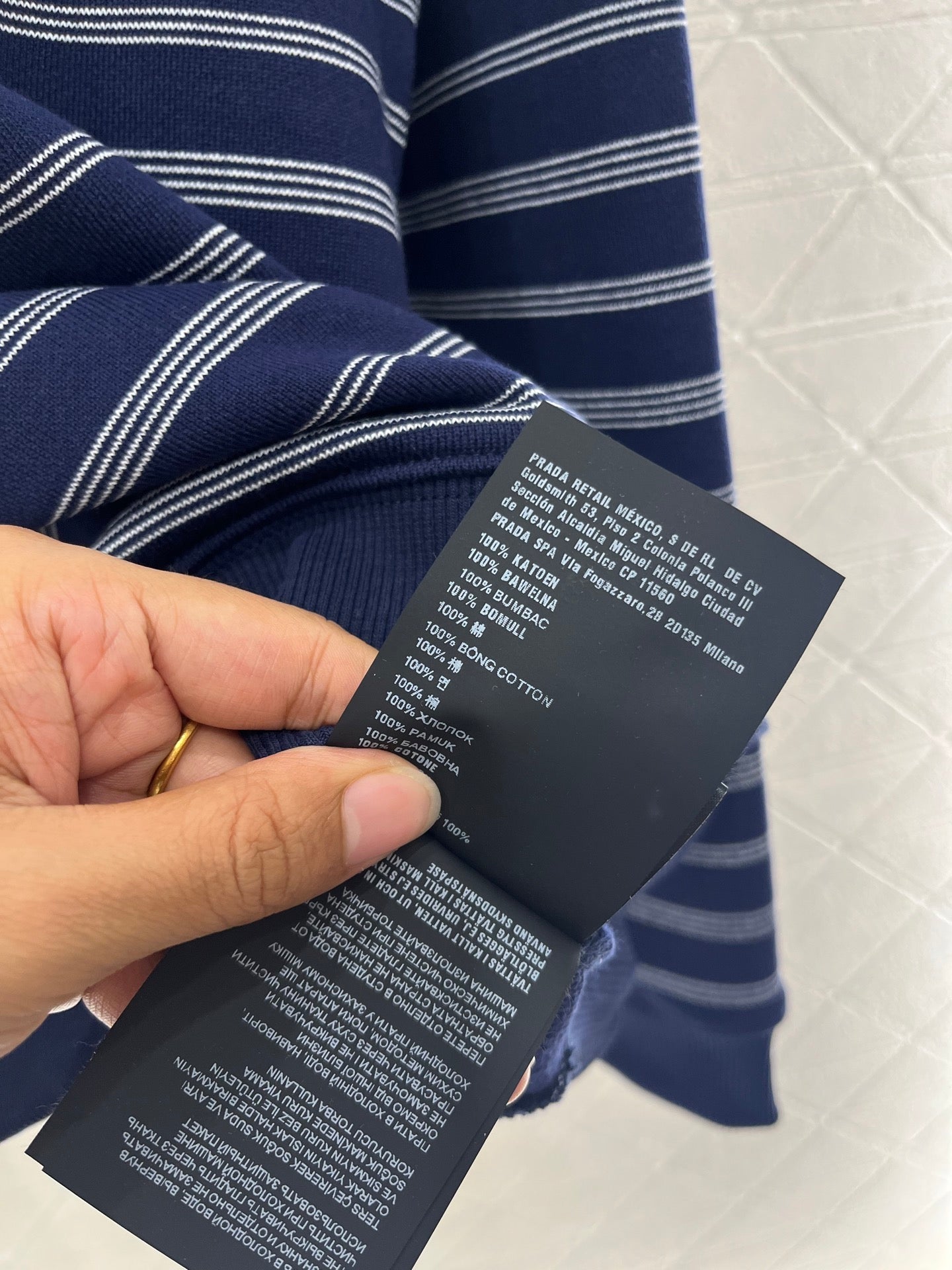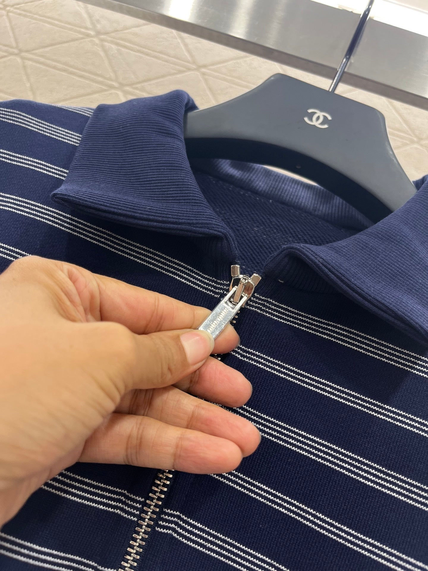 Customized YB original cotton material, elastic and comfortable, full of texture. Lapel polo long-sleeved top cut, dropped shoulders and loose version. The upper body presents a casual and lazy style. The blue and white stripes are staggered in thickness. The zipper half-opens to increase the casual feeling of the outfit. It is fashionable to wear it alone or with an inner layer. The letter logo on the chest highlights the brand style. It is fashionable and stylish. Both men and women can control it.