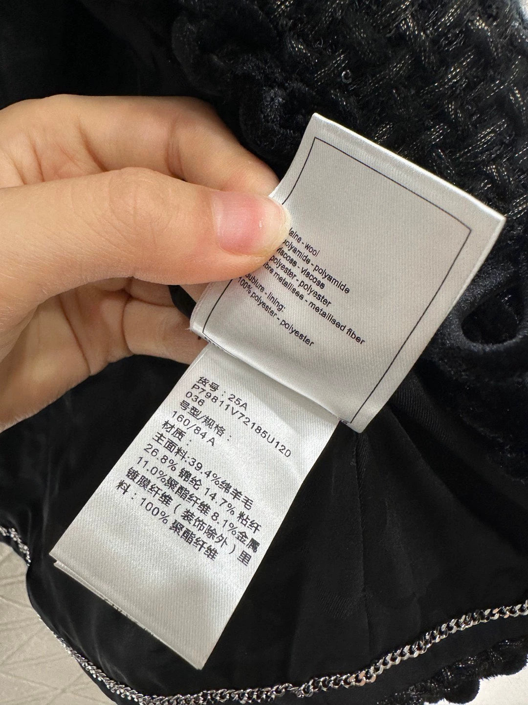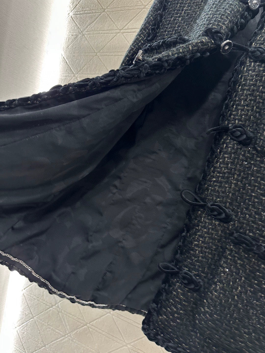 Black woven coat made from imported gold-threaded tweed fabric with a strong textured feel. Features a unique velvet-trimmed round neckline with a single-breasted button closure and four pockets. The relaxed fit flatters all body types. This timeless classic Coco black coat is a timeless choice—you can never go wrong with it. Even after a decade, it remains a timeless piece that looks great when worn. It exudes elegance and sophistication, with understated luxury and exceptional quality.