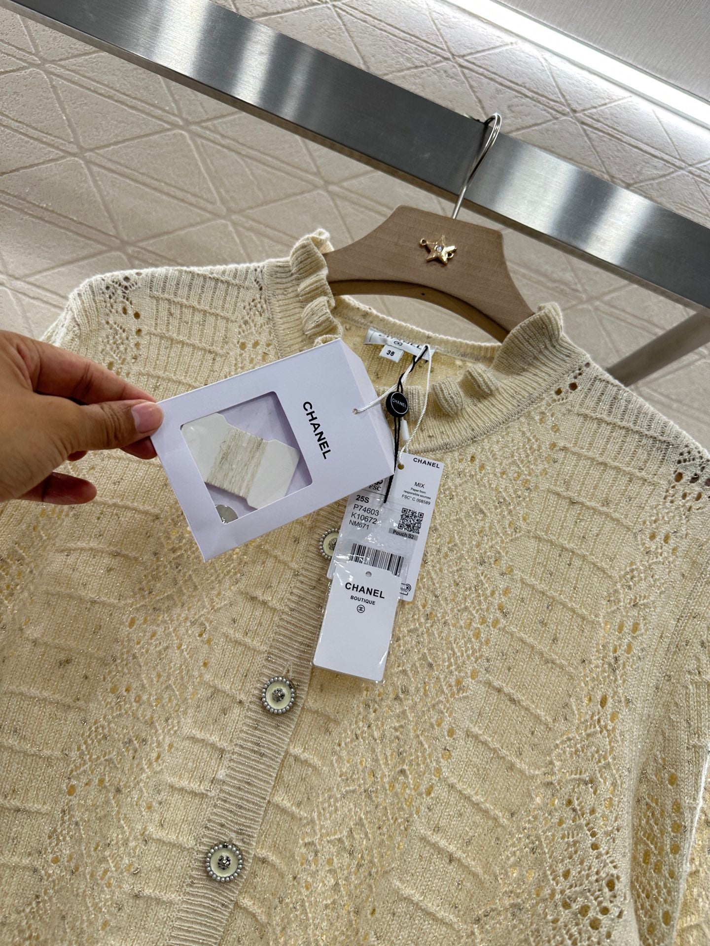 Customized YB cashmere yarn weaving High-quality and comfortable texture Knitted long-sleeved cardigan cut Vertical distribution throughout the body Crochet texture and hollow design interweave Cuffs and hem threaded edging wrapped More close-fitting and slimming The neckline is decorated with three-dimensional wood ear lace The front is engraved with round buttons Double C engraving highlights the taste Incorporate silver thread Wearing shows a relaxed tone Light luxury and fashionable temperament Can be worn alone or layered First choice for fashionable wear in all seasons Customized fabrics and accessories Look for the version High version