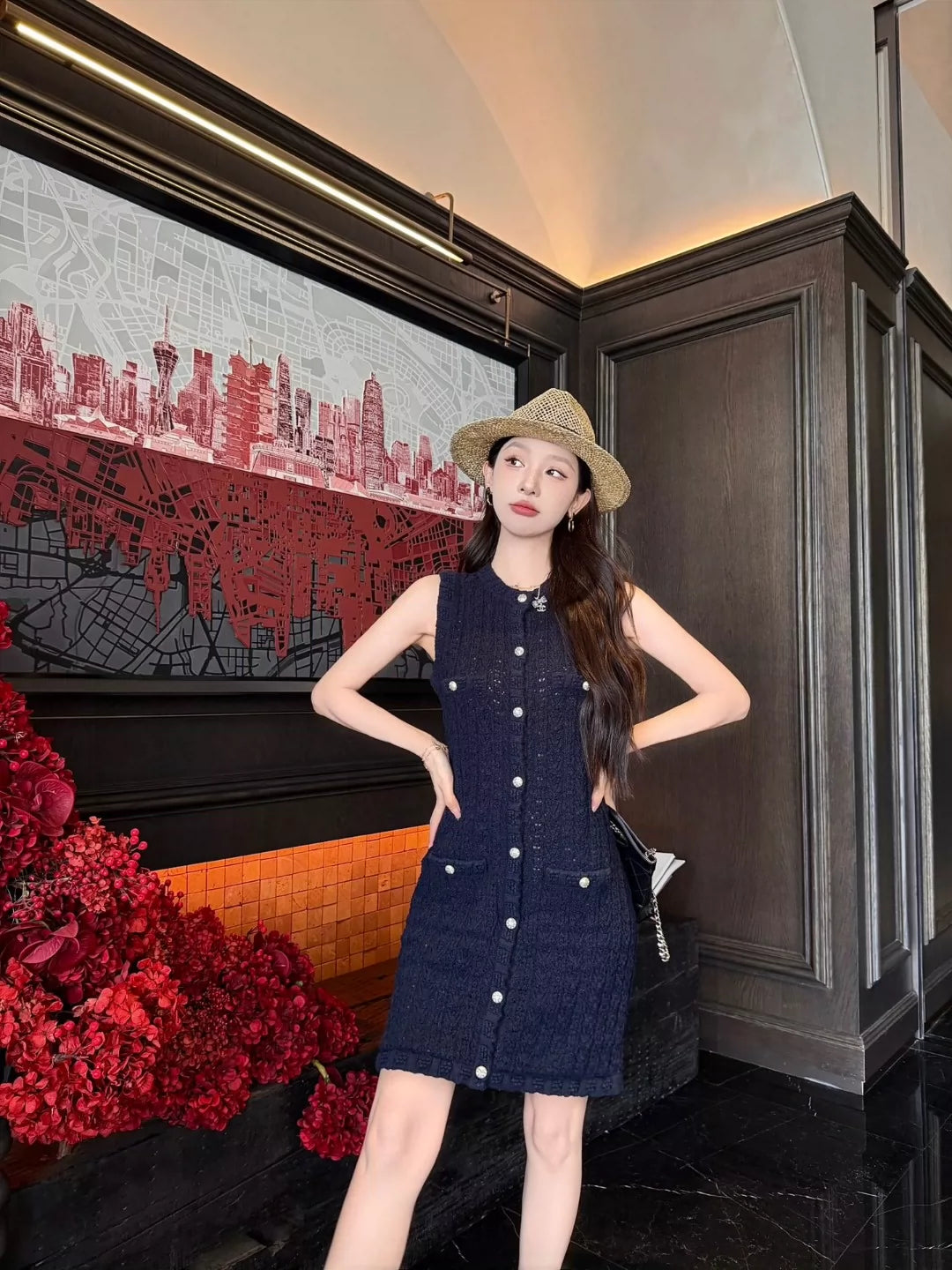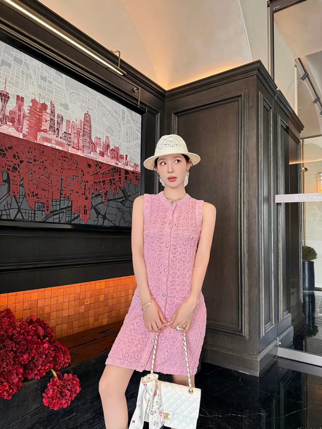 C 25 new hollow single-breasted round neck sleeveless knit dress (white pink navy)