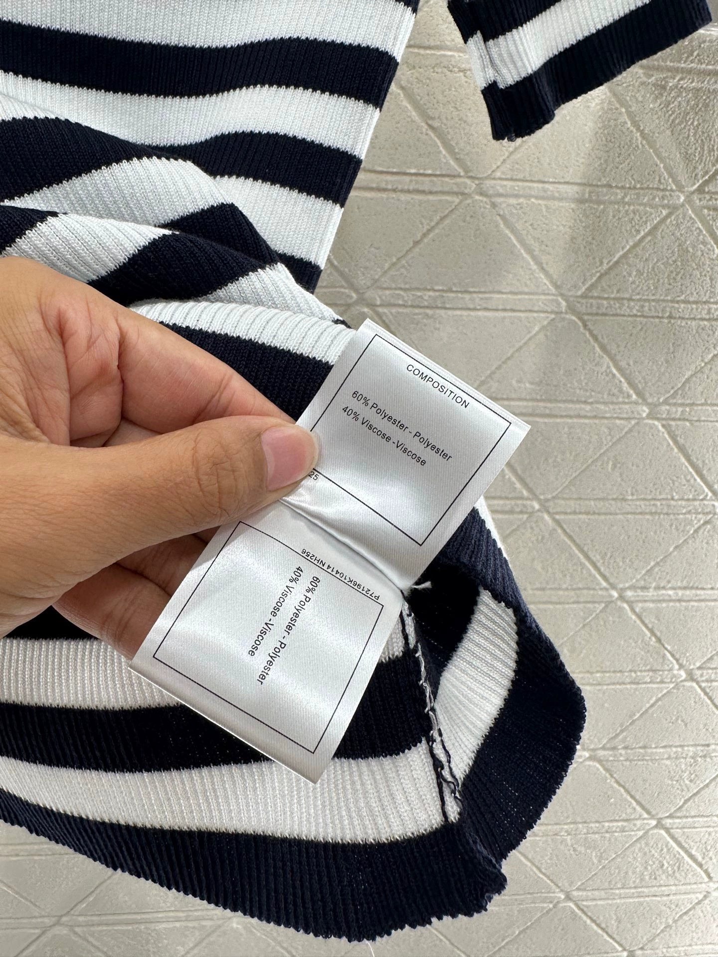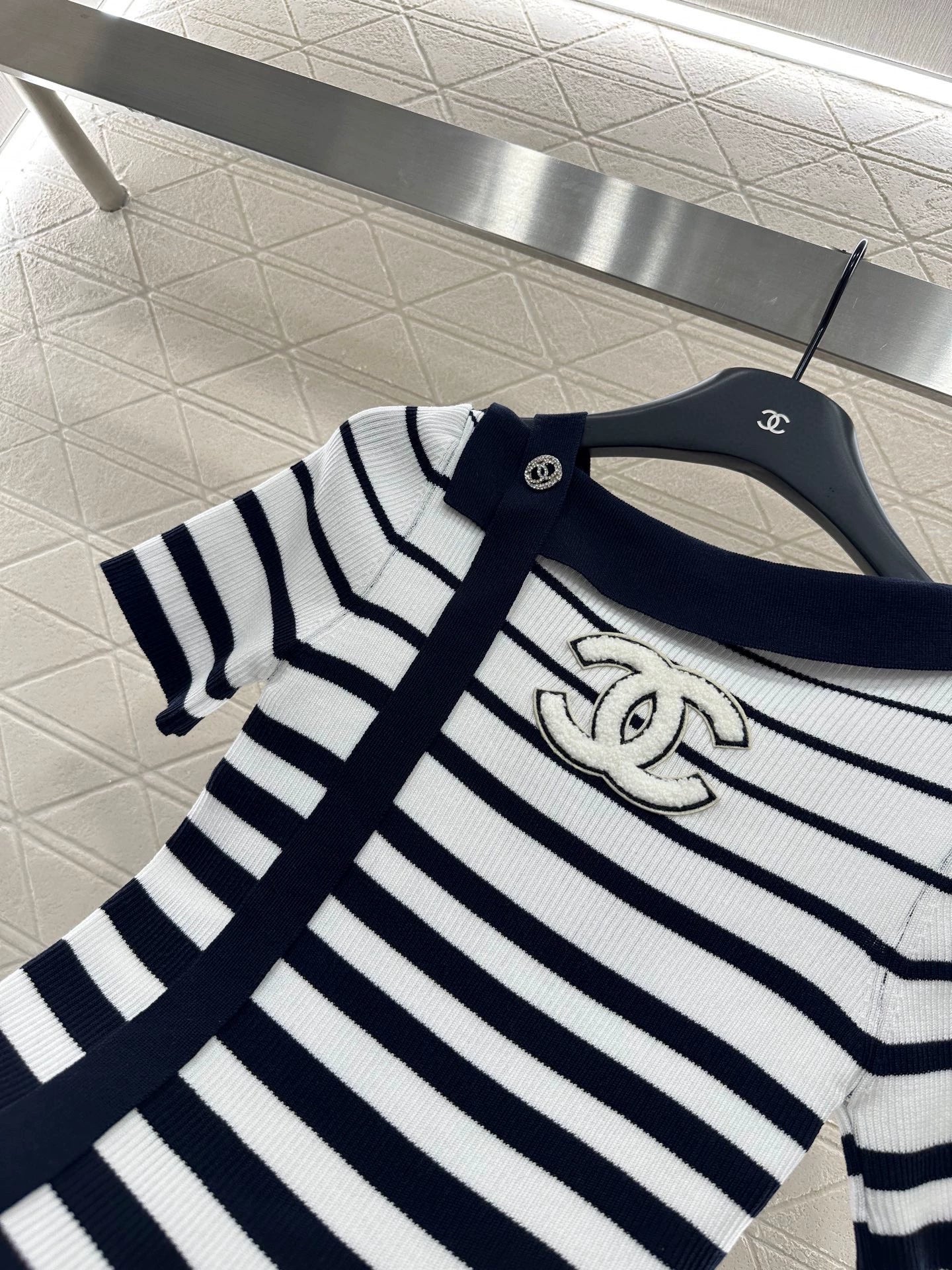 Customized YB imported yarn weaving, comfortable and soft, full of elasticity, off-shoulder knitted short sleeves, the neckline is cut obliquely, decorated with threaded folded collar edges and thin ribbons, elegant and charming, elastic and tight fit, more concealing and slimming, black and white stripes + three-dimensional plush double C logo, more high street fashion atmosphere, ready-made clothes use dense weaving technology, delicate patterns add a sense of refinement to simple wear, easily show the playful girl style, slim version