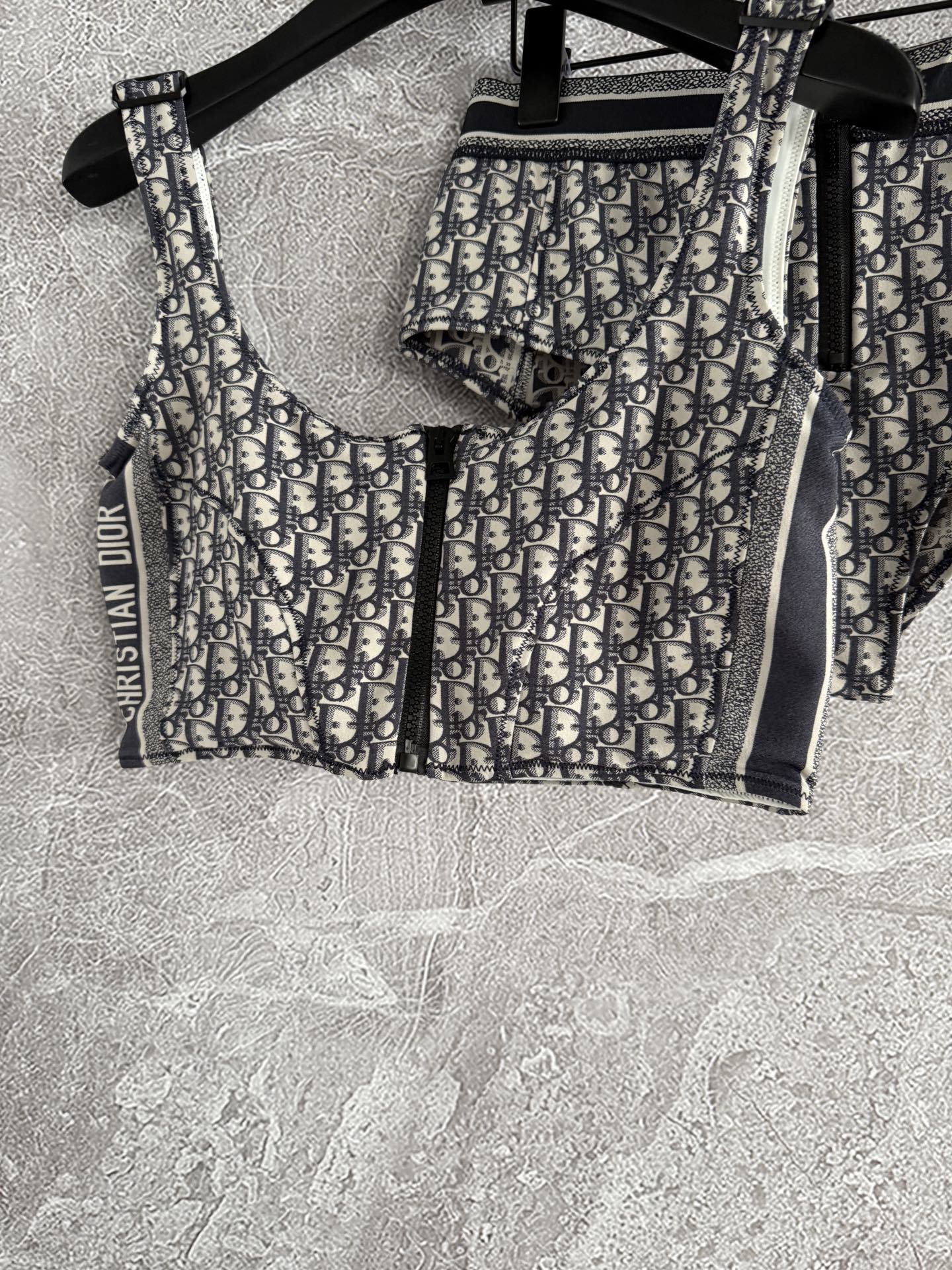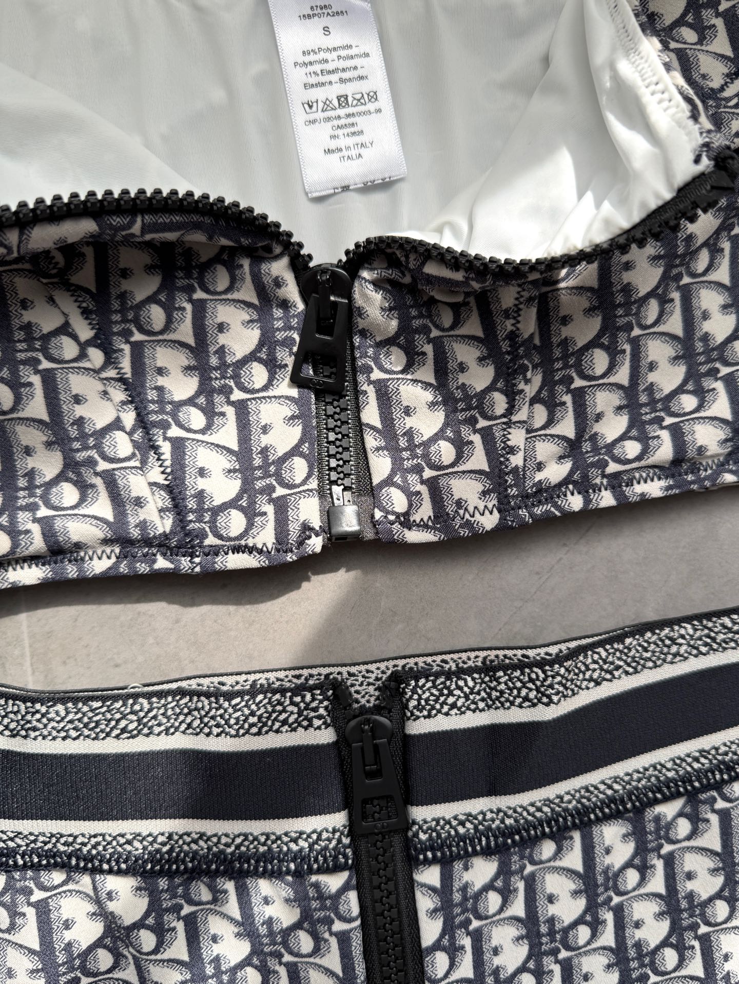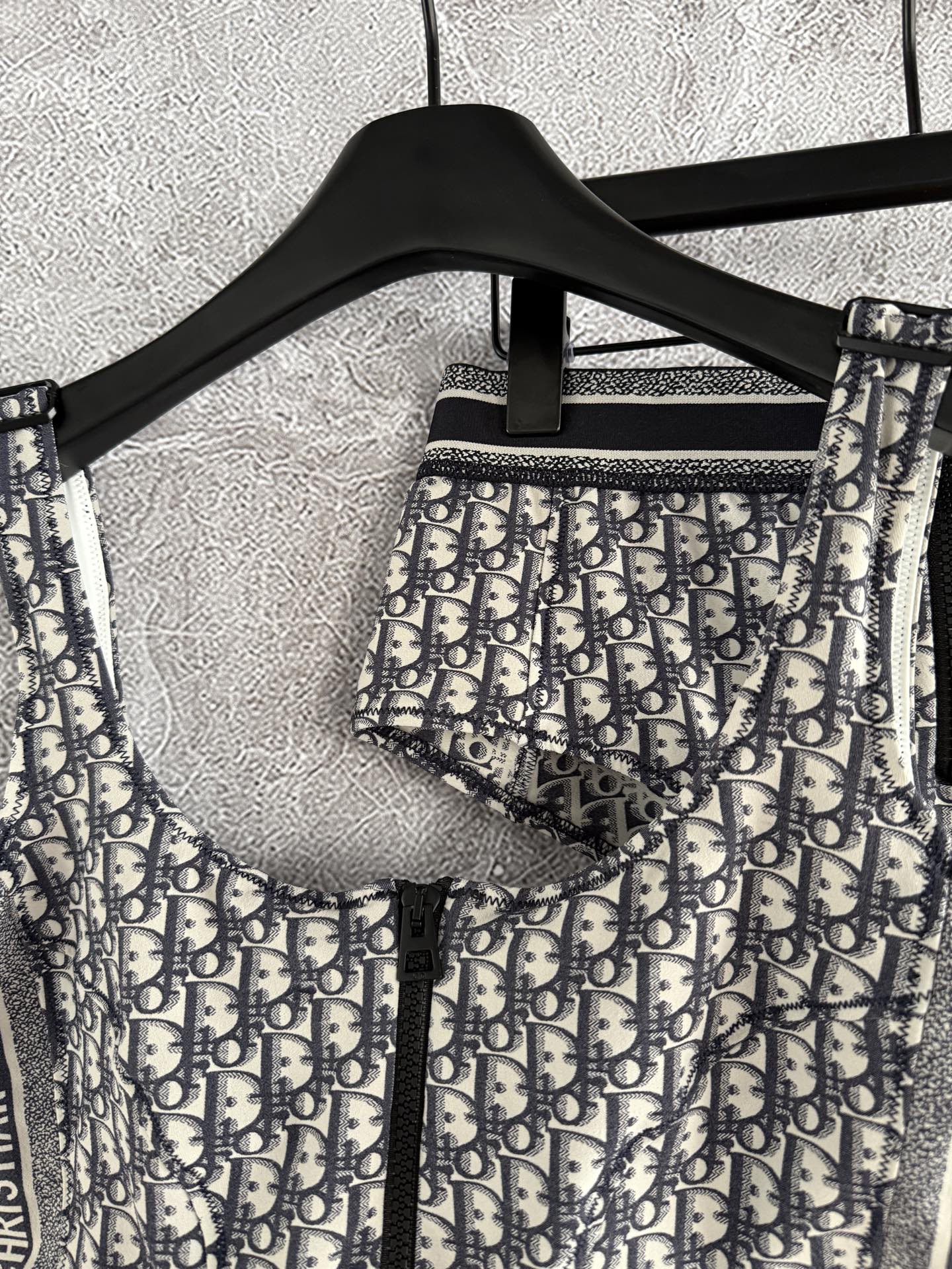 Made from a technical fabric in a fixed weave with a logo embellished on the side in one piece for contrast, top and bottom zipper closure, high-waisted pants designed with a classic signature elastic webbing on the back, and a self-contained ambient collection that makes for effortless styling whether it's as an undershirt or a swimsuit.