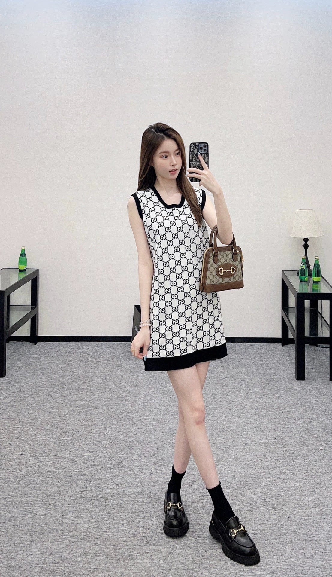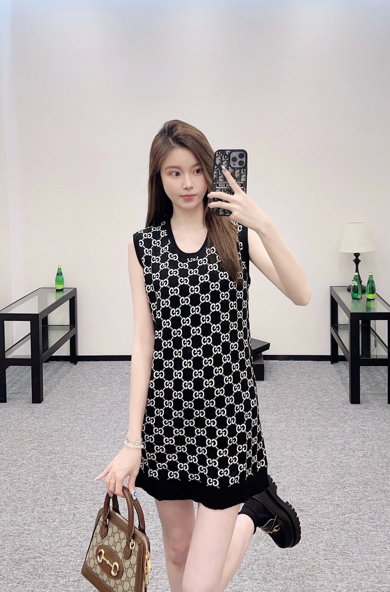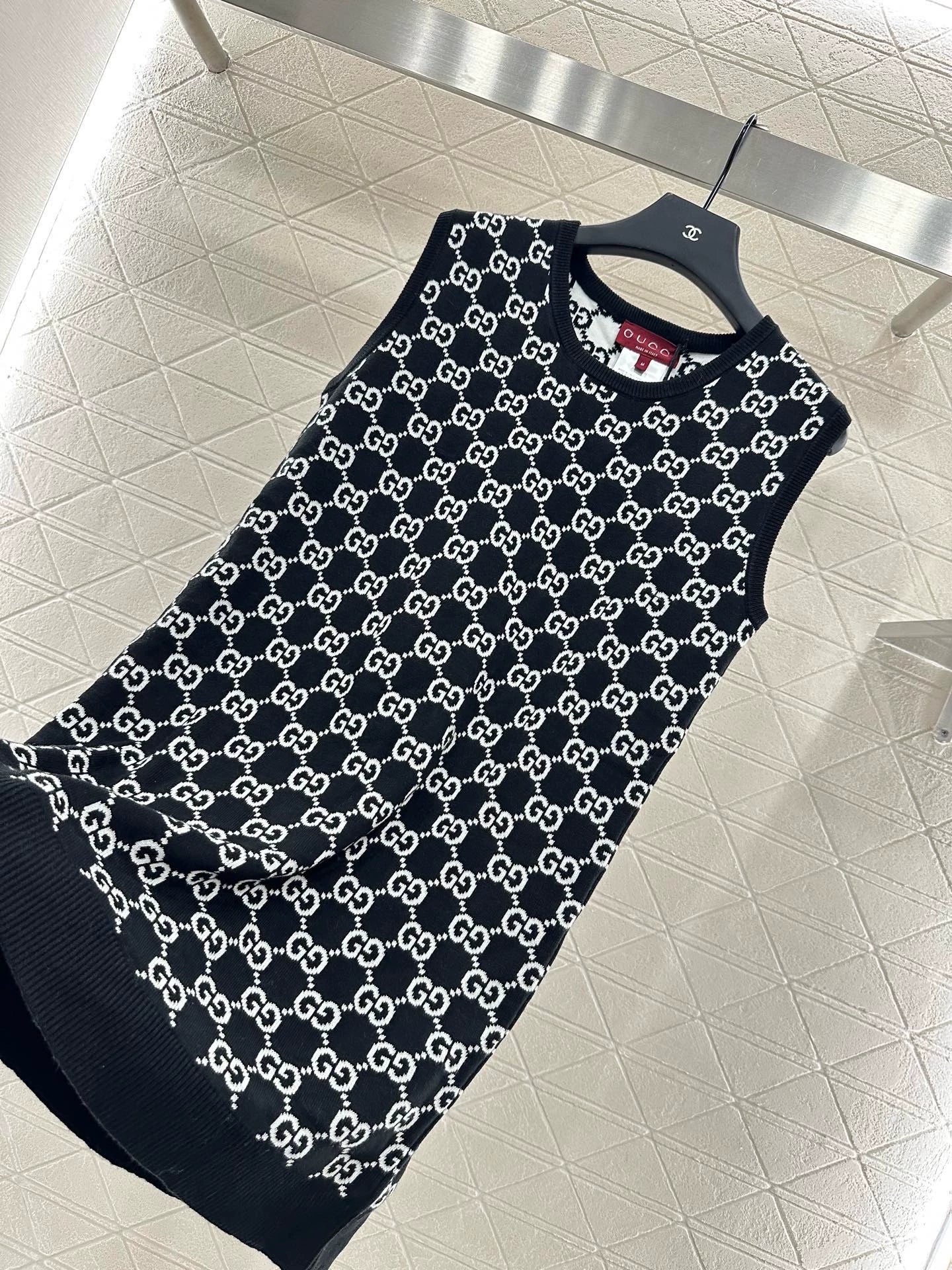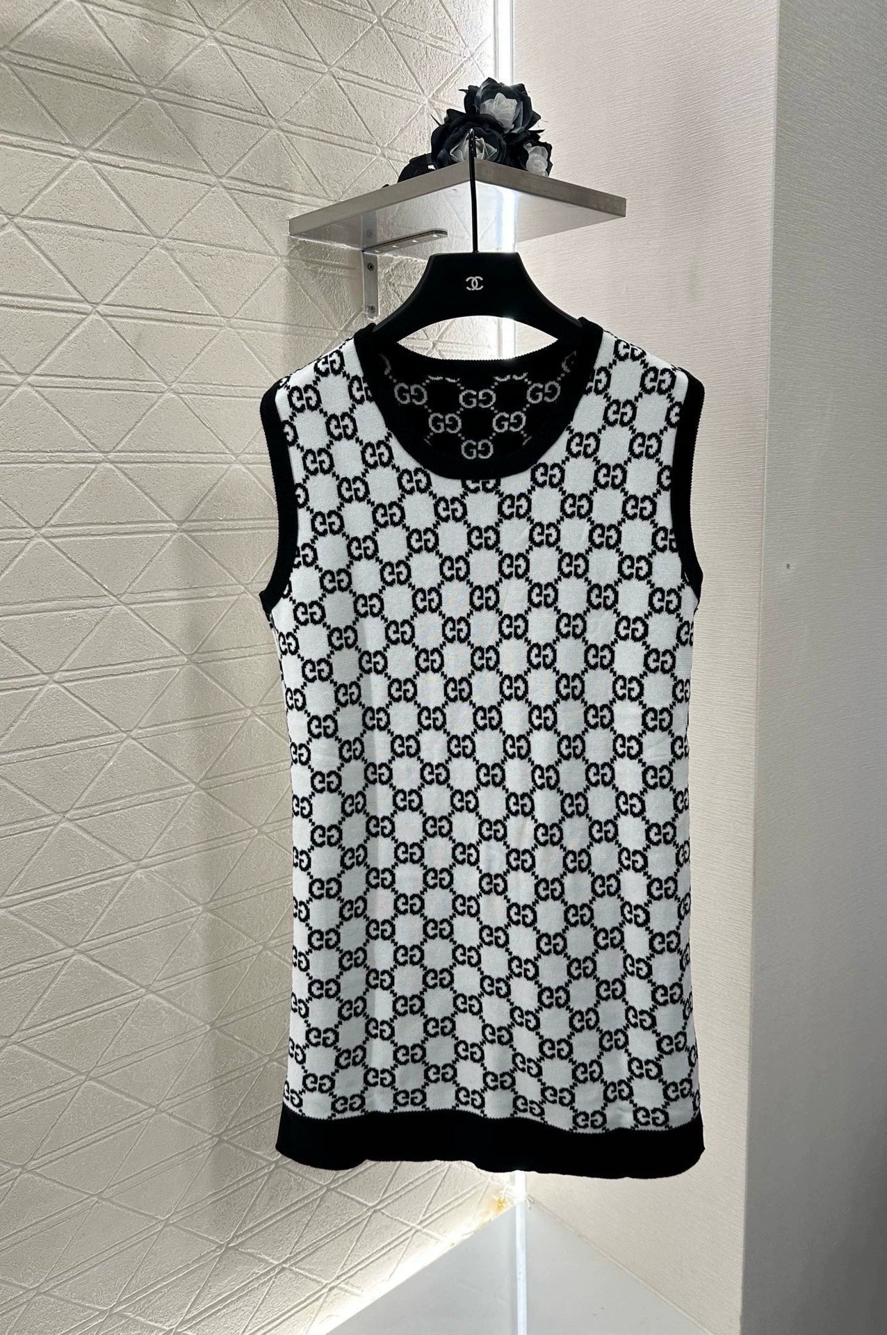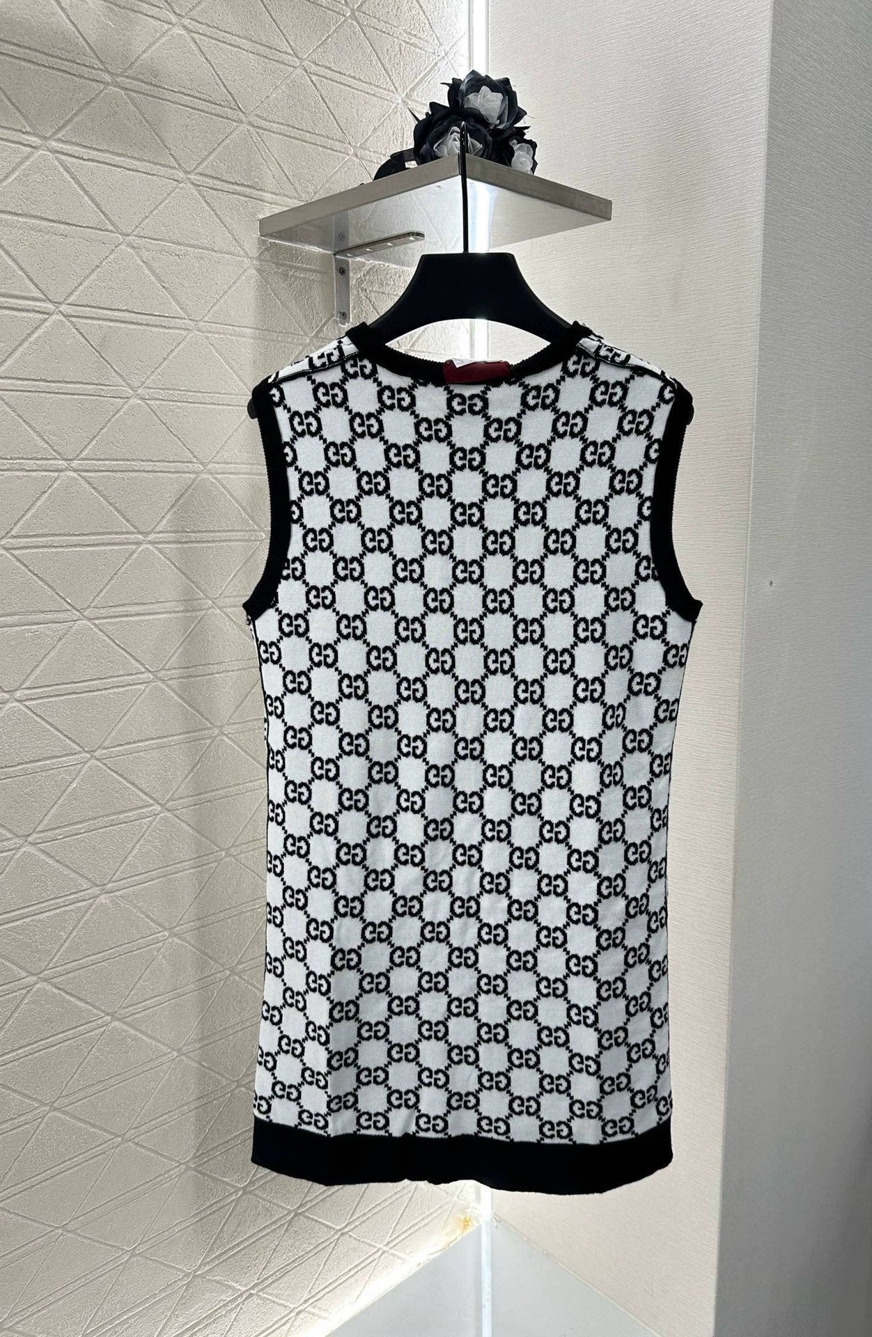 Crafted from custom YB wool yarn for premium quality and comfort, this round-neck knitted vest dress features a rounded neckline. The garment is narrowed with ribbed hems, maintaining a consistent design tone. The overall silhouette is refined and crisp. Double G jacquard accents throughout create a stylish pop of color. Reversible color inside and out allows for two-way wear, creating the brand's unique, stylish style. Regular fit is flattering and creates a relaxed, slimming look. Custom fabrics and trims are available. Look for the latest version.