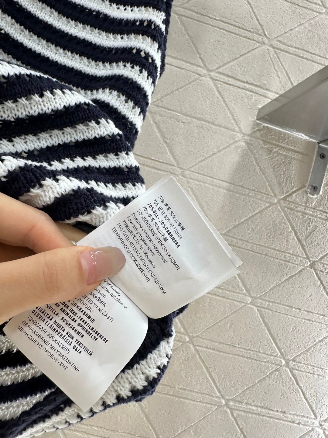 Wool yarn knit Soft and skin-friendly Comfortable and stylish Striped undershirt cut Neckline shows off the skin to beautify the proportion of the head and shoulders more slimming Through the body of the two-color stripes collide to form a sense of layering Neckline cuffs wrapped threads and echoed with the hemline with the monogrammed embroidered logo decoration on the chest Retro style strong shape Slimming and highlighting the figure Stretchy and full of sweet and fashionable