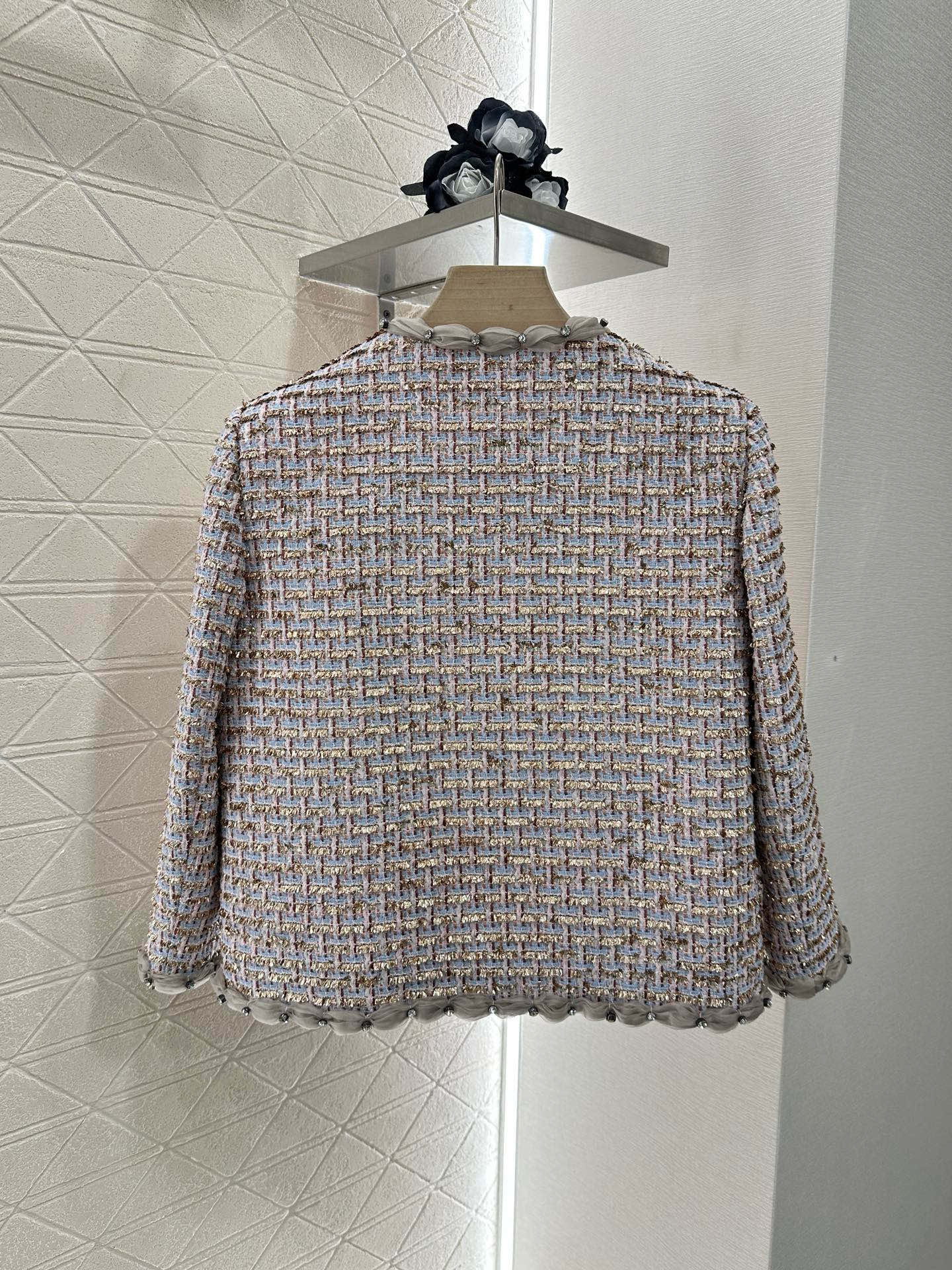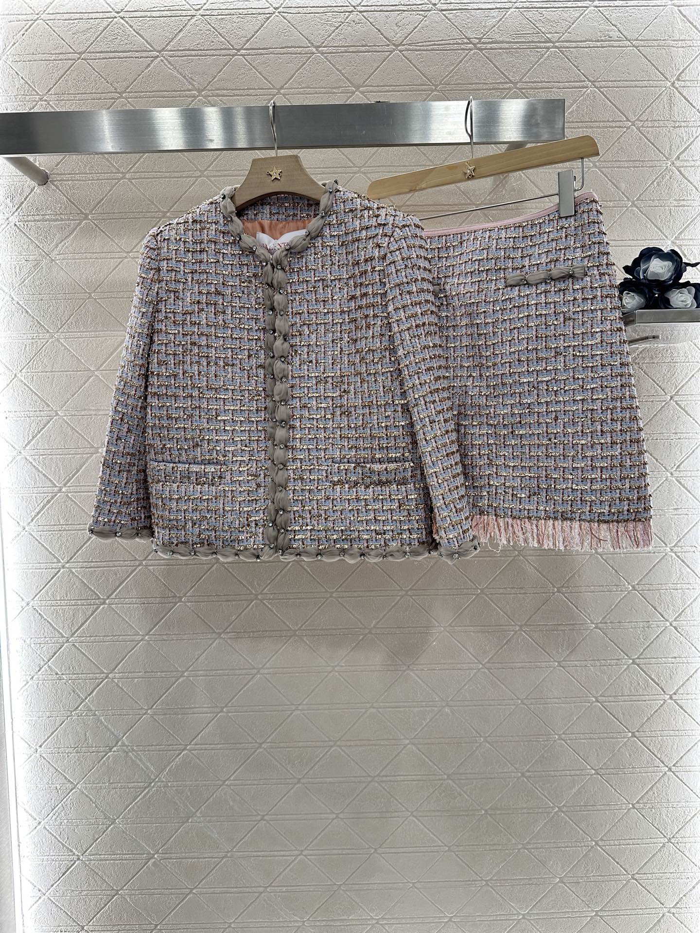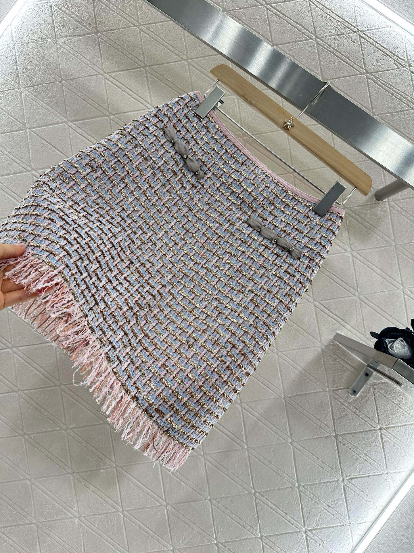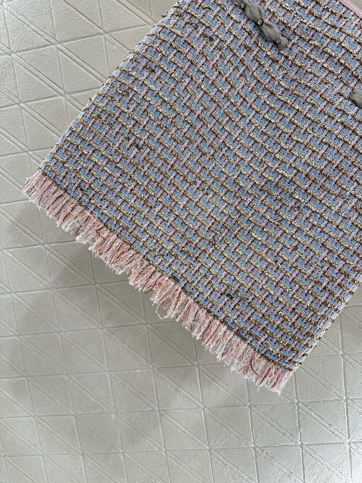 Customized YB imported woolen material, high-quality texture, full of appearance, round neck dress jacket version, straight shoulder pad design fits the human body, showing a slim and upright figure, the front collar extends to the hem and cuffs, the details are highlighted with three-dimensional twisted edges, and the plaid pattern is interwoven with delicate yarn rules to cover the whole body, showing the style of a celebrity. The straight skirt of the same series has echoed details, matched with light pink tassels on the skirt, perfectly interpreting the elegant feeling of a daughter, the set is noble and textured, intellectual and gentle, the only choice for attending formal occasions, silk jacquard lining, customized surface and accessories, identify the version, high version 𝑆𝑀𝐿