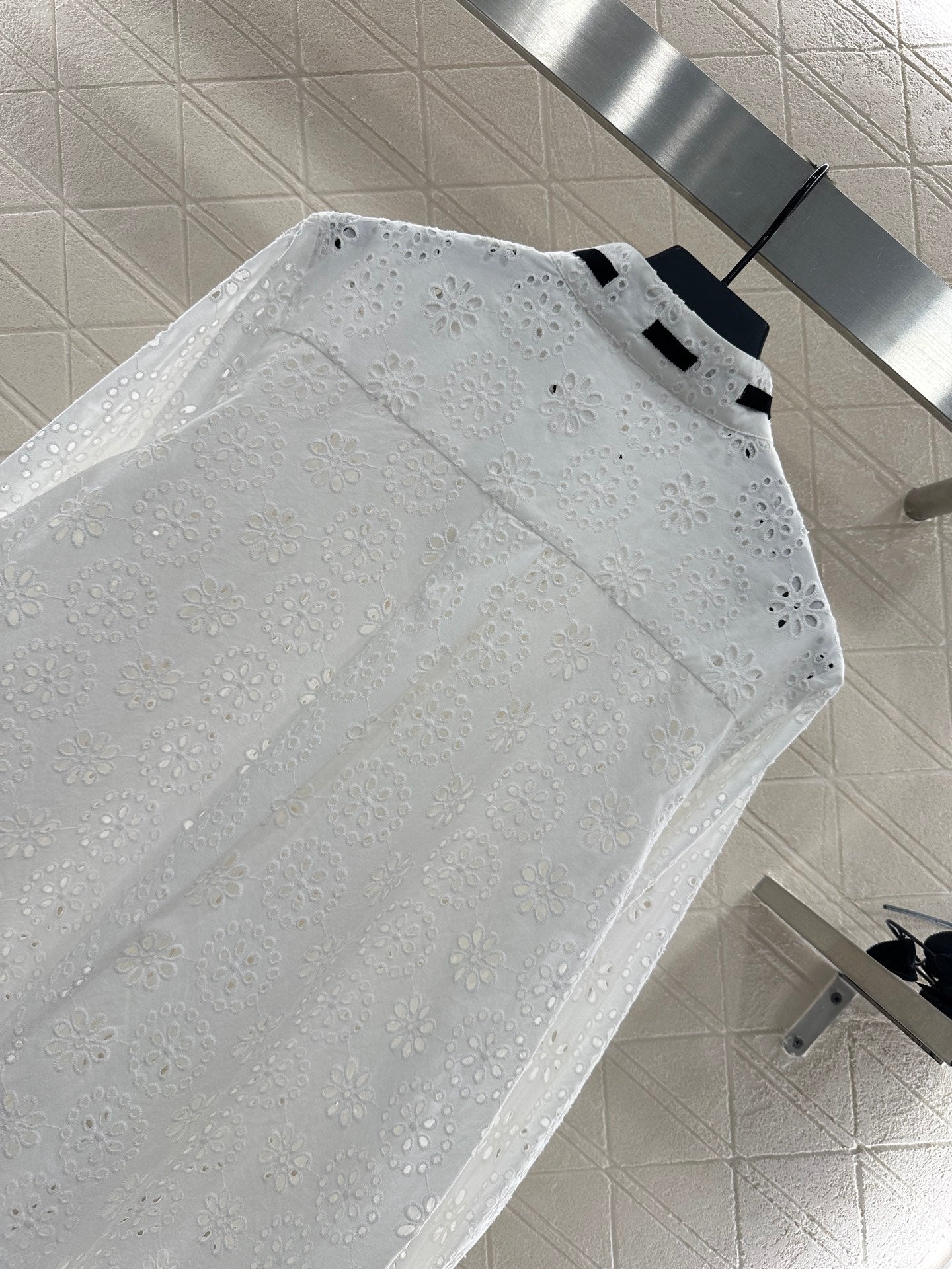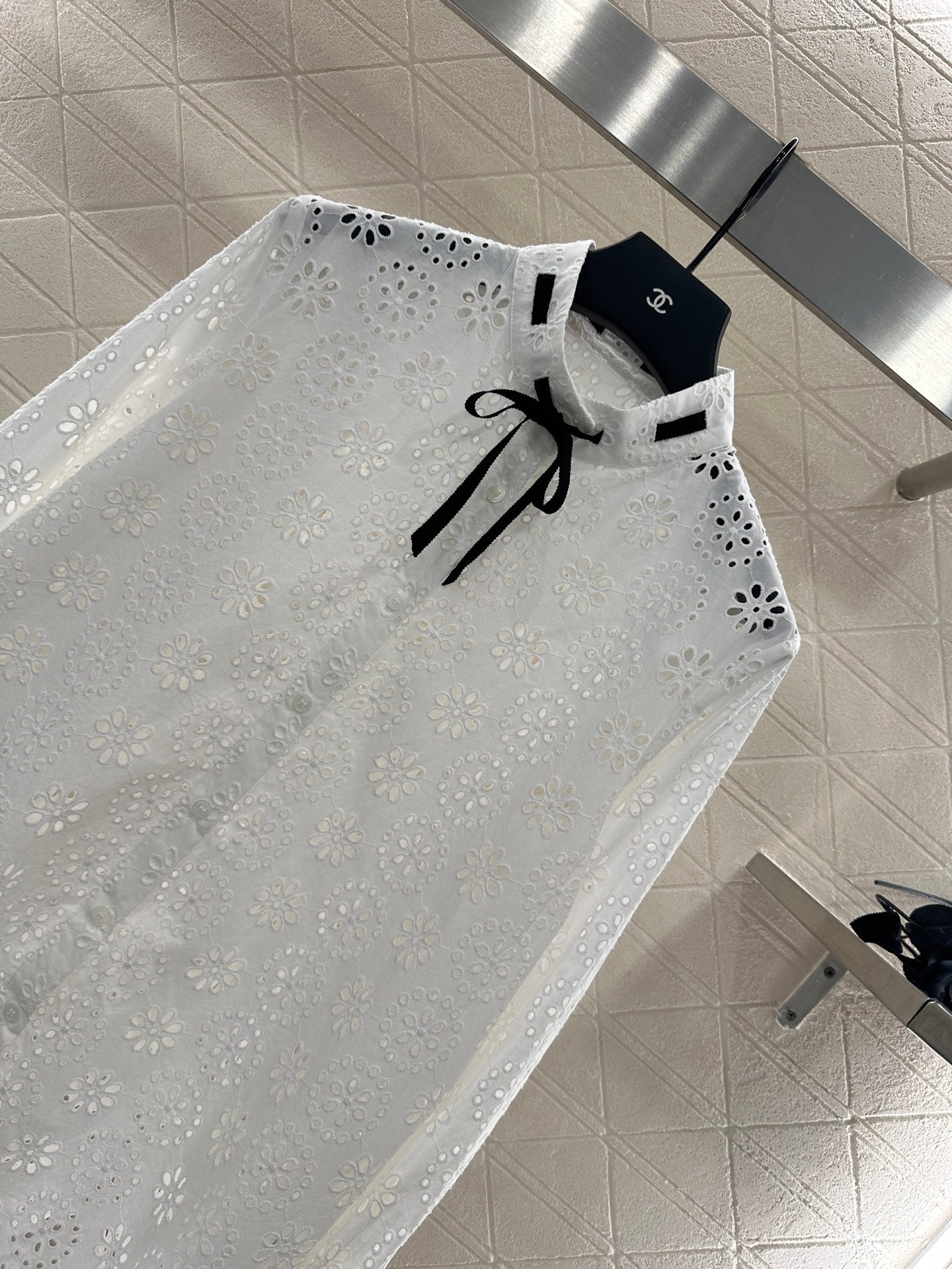 Customized YB twill cotton material, embroidery process, hollow flower decoration, lace-up stand-up collar shirt cut, hollow flower pattern all over, light and slightly transparent with delicate texture, suitable for summer wear, black ribbon is inserted and tied with a bow on the collar, black and white contrast is more eye-catching, wear out personality and exquisite, wear to show relaxed tone, light luxury and fashionable temperament, the first choice for fashionable wear in all seasons