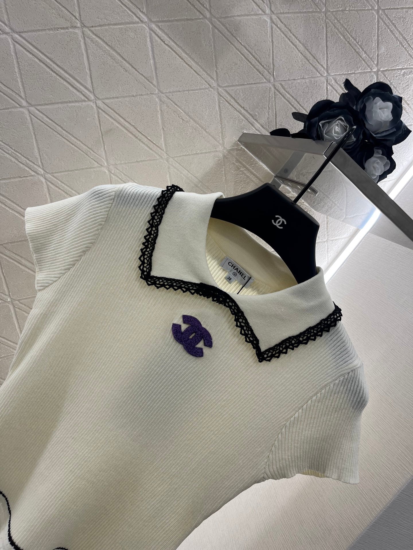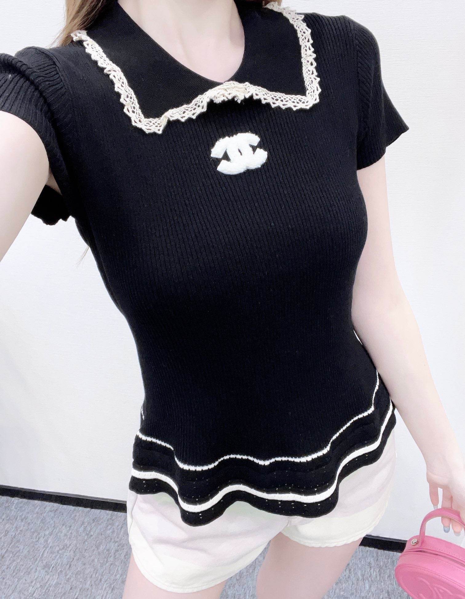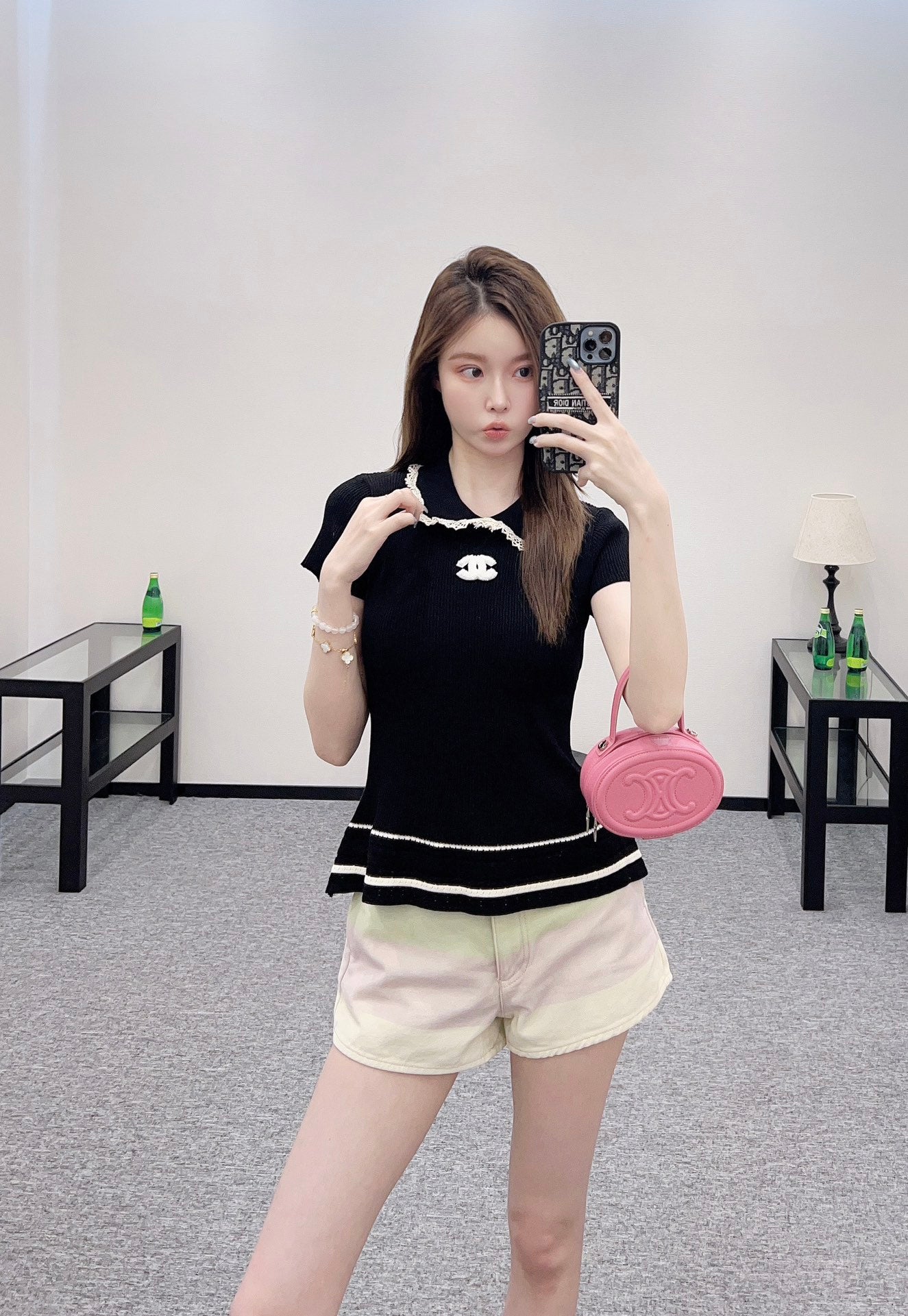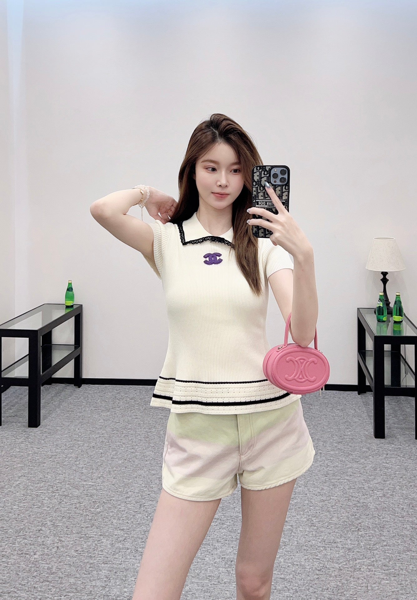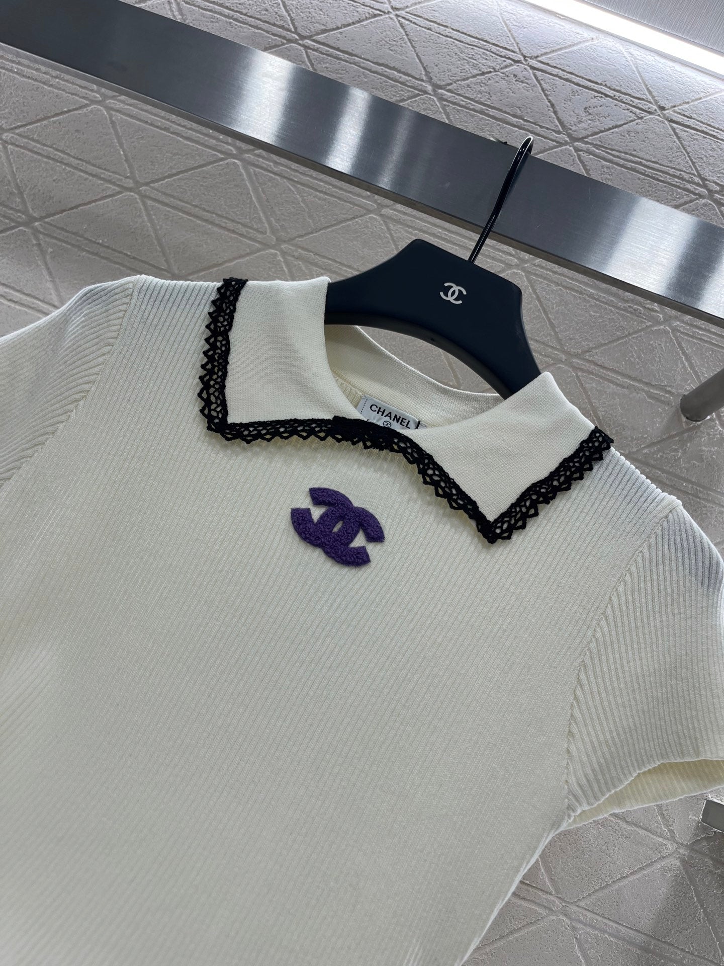 Customized YB imported yarn weaving, delicate and soft, full of elasticity, exquisite lapel short-sleeved polo collar style, contrasting lace design on the collar edge, fine vertical pit knitting pattern throughout, elastic thread slim fit details, overflowing with literary and youthful feeling, iconic three-dimensional double C logo on the chest, combined with the distribution of stripes on the hem, making the retro college style strong, reducing age and making you look whiter, easy to control for daily travel or parties