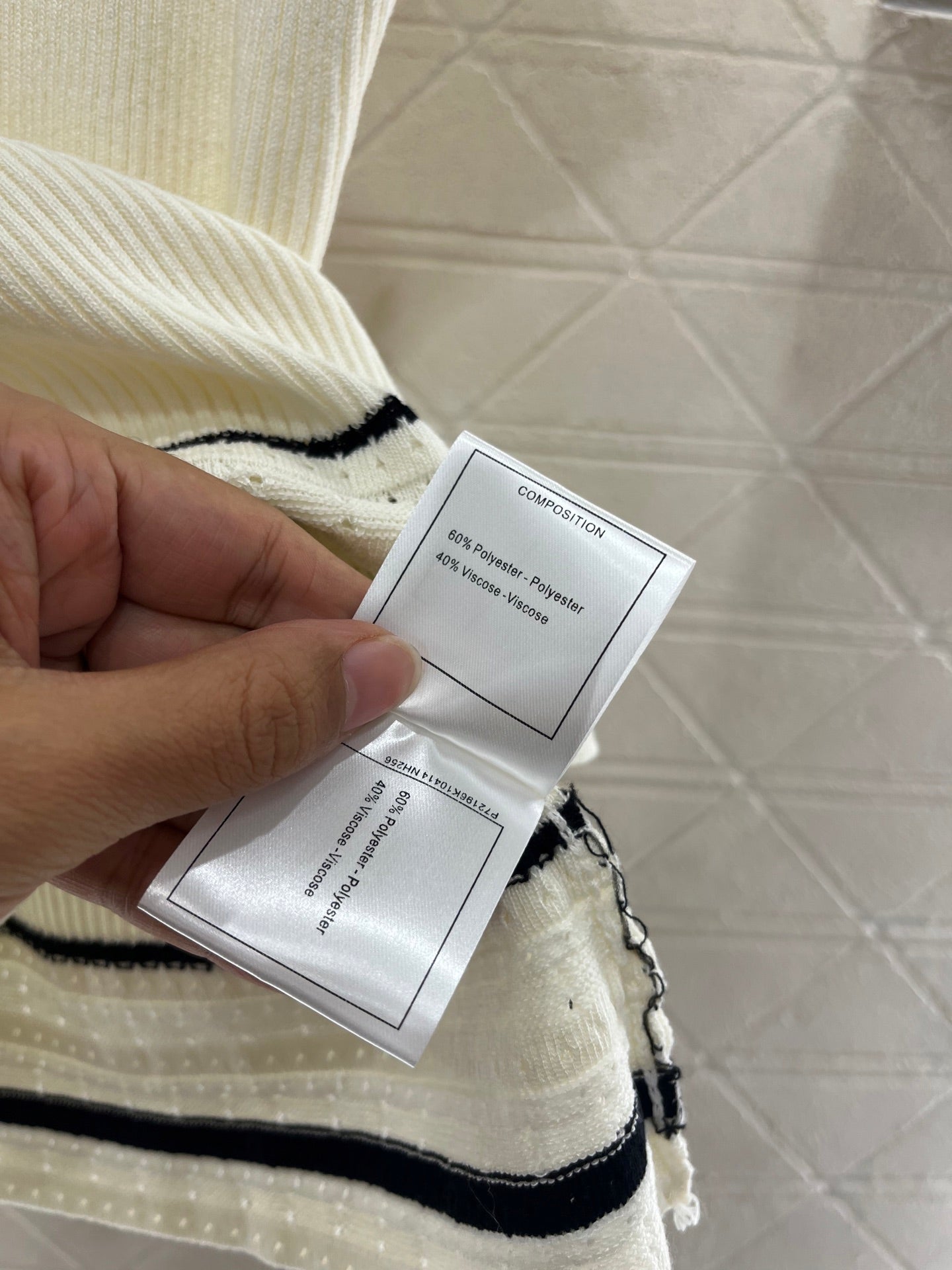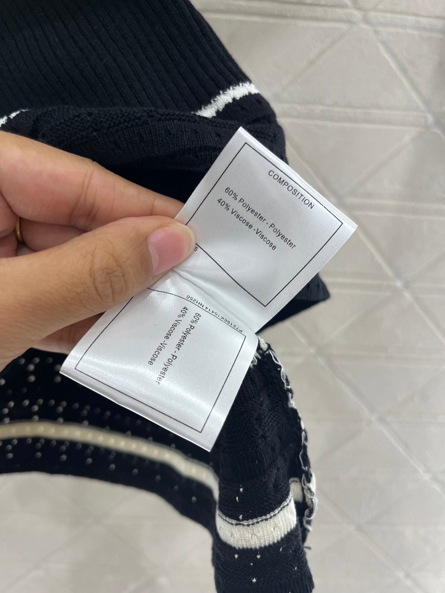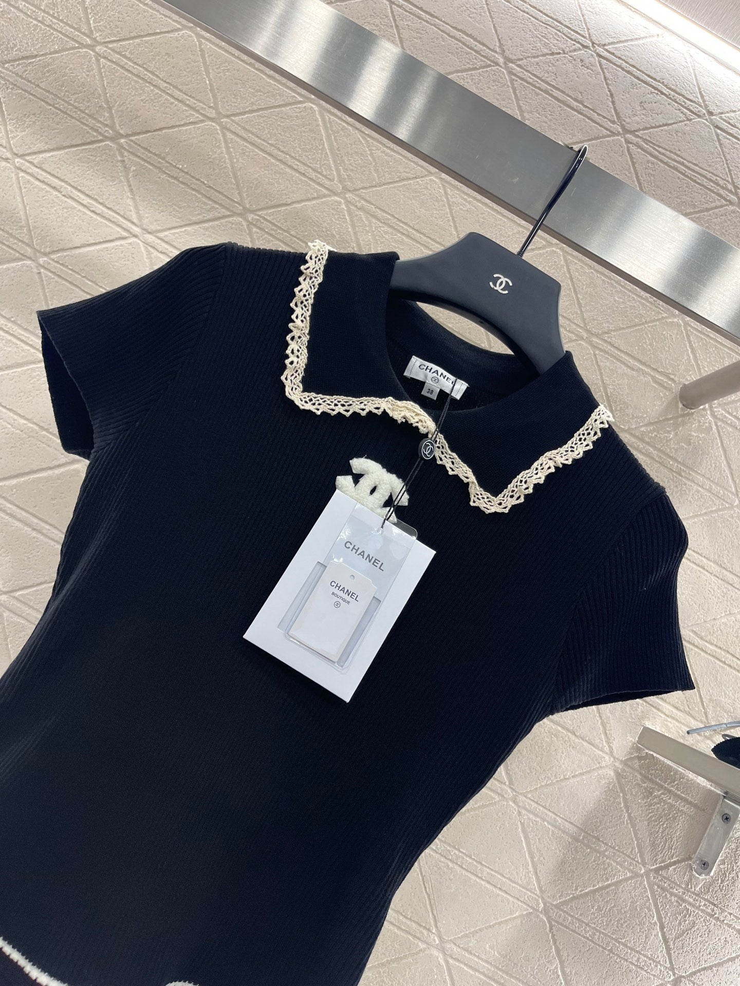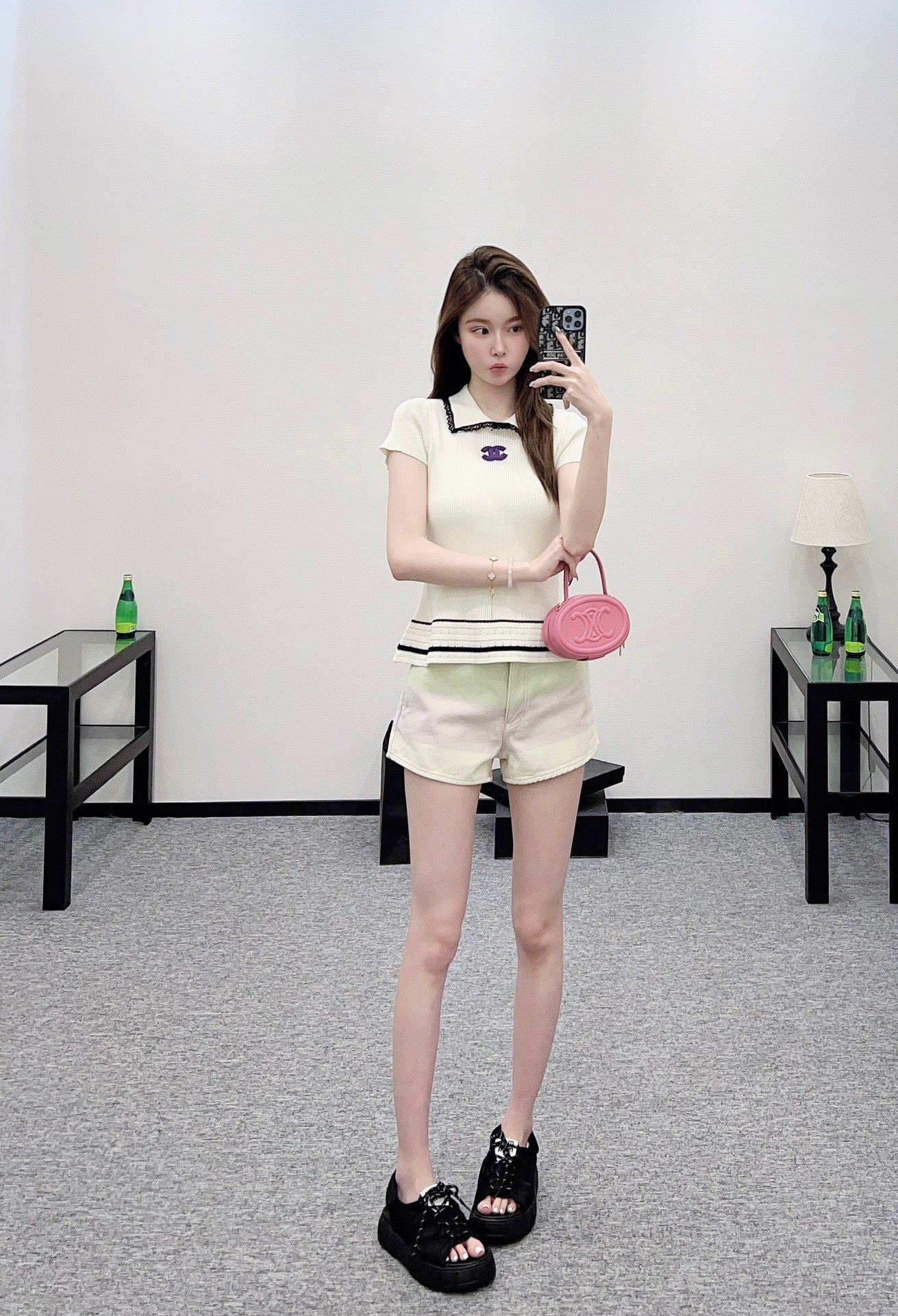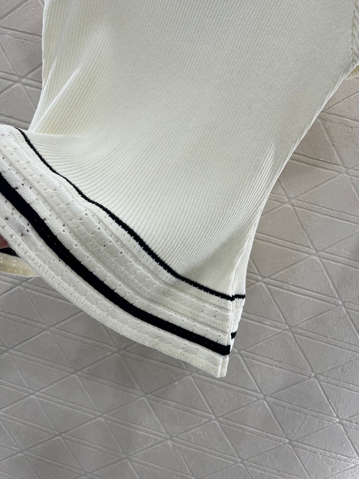 Customized YB imported yarn weaving, delicate and soft, full of elasticity, exquisite lapel short-sleeved polo collar style, contrasting lace design on the collar edge, fine vertical pit knitting pattern throughout, elastic thread slim fit details, overflowing with literary and youthful feeling, iconic three-dimensional double C logo on the chest, combined with the distribution of stripes on the hem, making the retro college style strong, reducing age and making you look whiter, easy to control for daily travel or parties