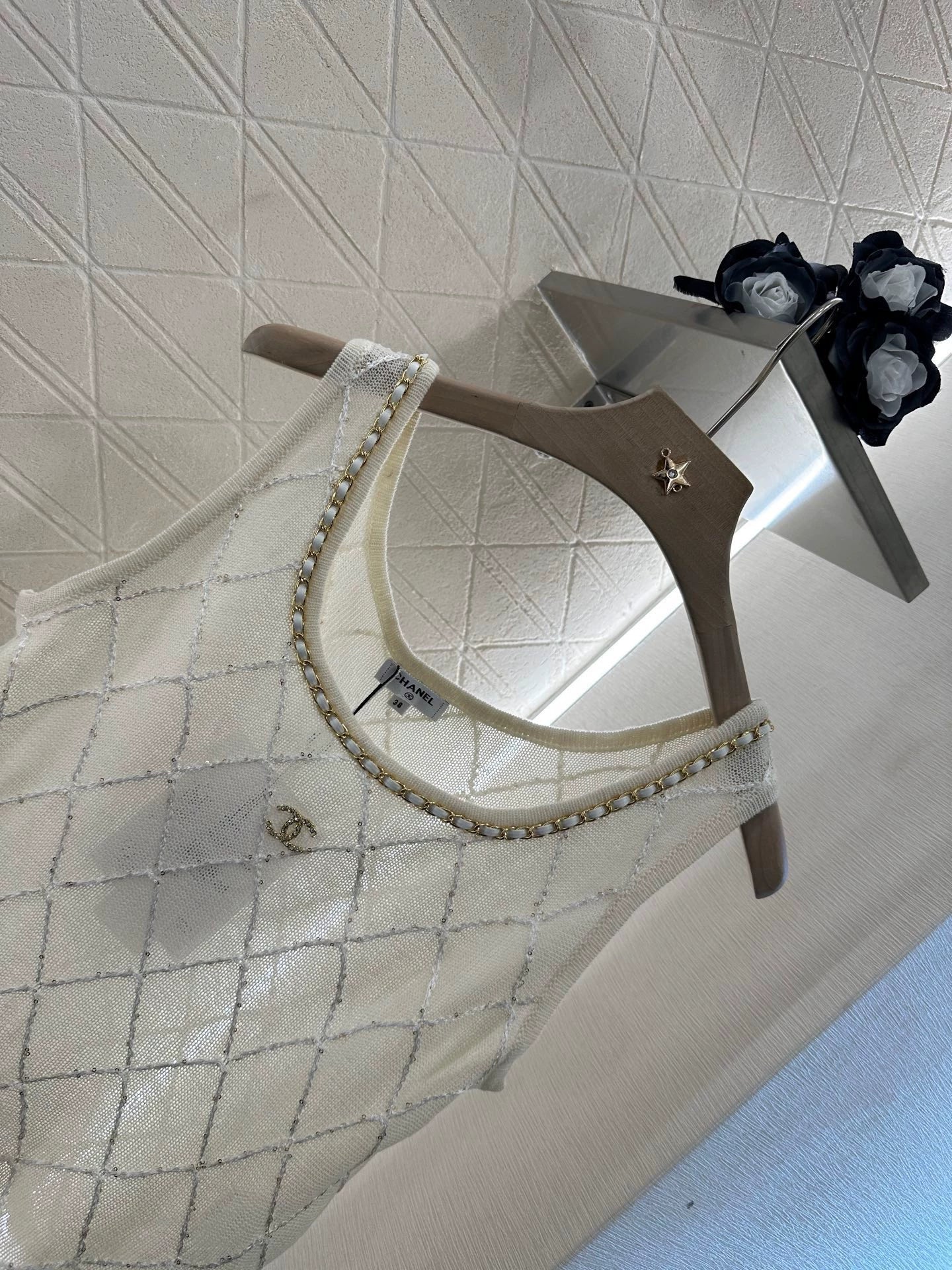 Customized YB imported yarn weaving Soft and skin-friendly Comfortable and stylish Round neck vest version Leather chain around the neckline Exquisite and fashionable Appropriate skin exposure Beautify the head-to-shoulder ratio and make you look thinner Large body in black and white optional Paired with diamond crochet Strong retro style Diamond double C logo on the chest Shows taste Elastic version highlights the figure Playful and age-reducing whitening Easy to control for daily travel or parties Customized surface and accessories