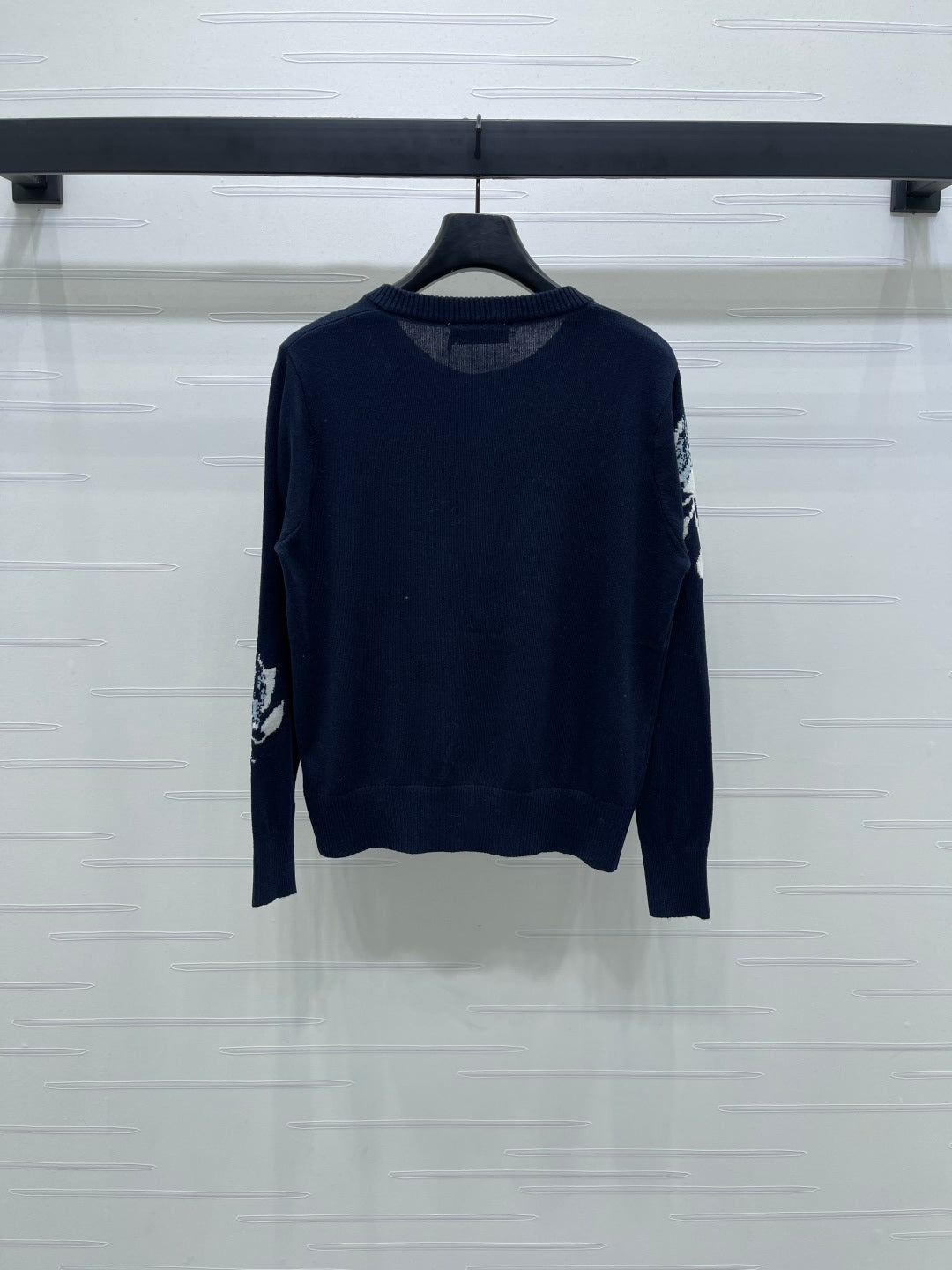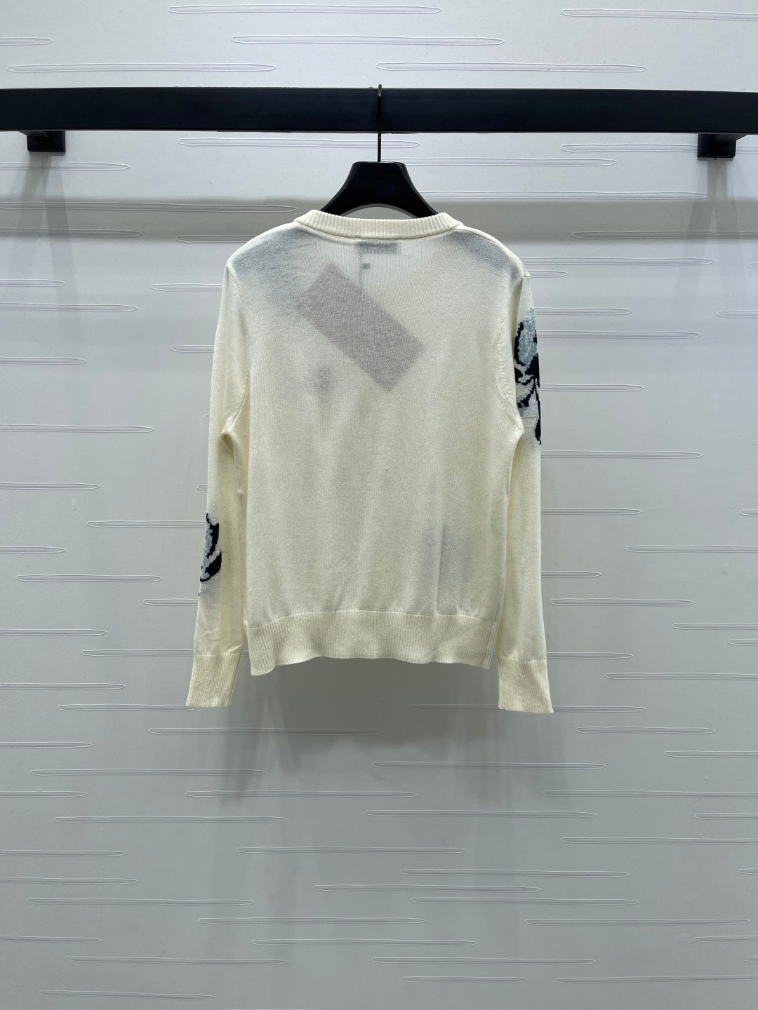 Custom wool yarn weaving, delicate texture, soft and comfortable, round neck long sleeve knitted cardigan cut, retro flowers all over, contrasting logo on the chest, highlighting the brand tone, literary color matching shows the British style, a must-have for commuting