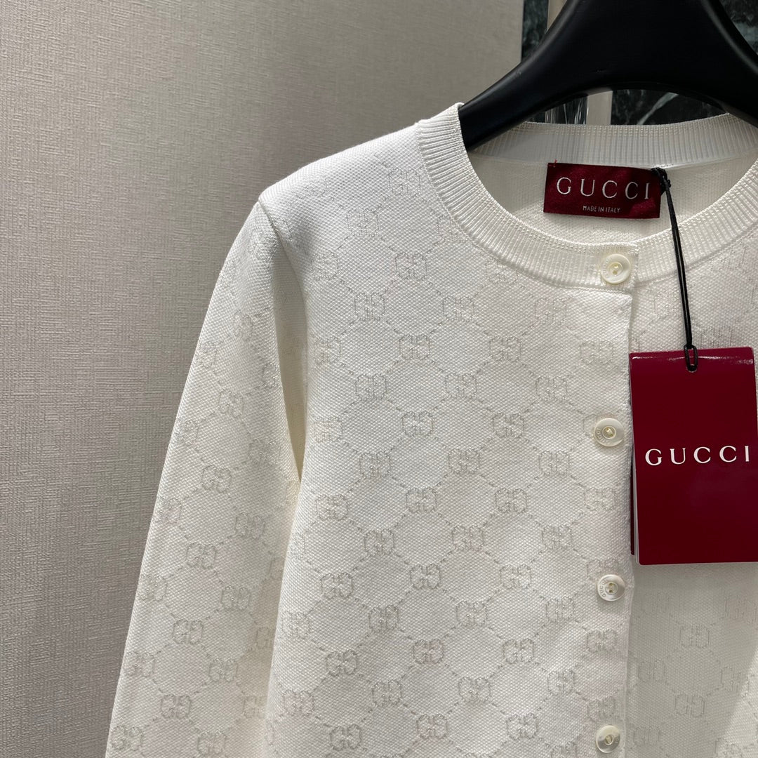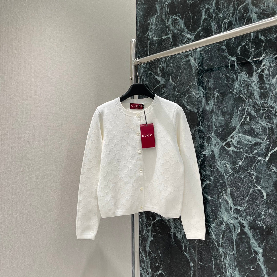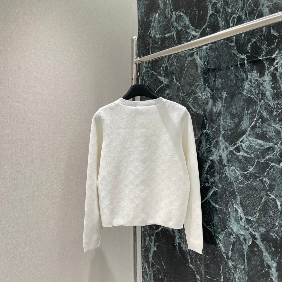 The all-over double G jacquard pattern and the threaded edging easily highlight the perfect details and texture. The short straight shoulder version combined with the versatile pure white makes the outfit elegant and literary, suitable for any pants or skirt. It is a fashionable and casual autumn and winter item.