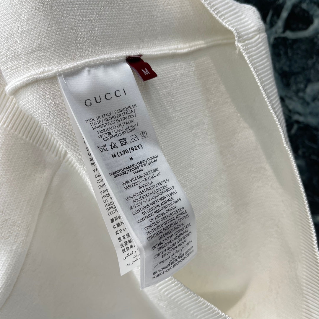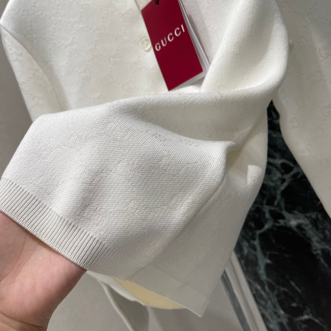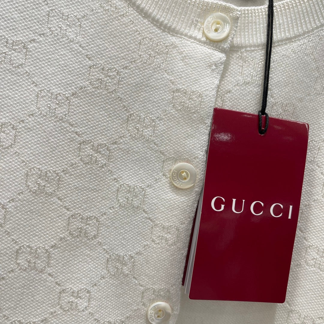 The all-over double G jacquard pattern and the threaded edging easily highlight the perfect details and texture. The short straight shoulder version combined with the versatile pure white makes the outfit elegant and literary, suitable for any pants or skirt. It is a fashionable and casual autumn and winter item.