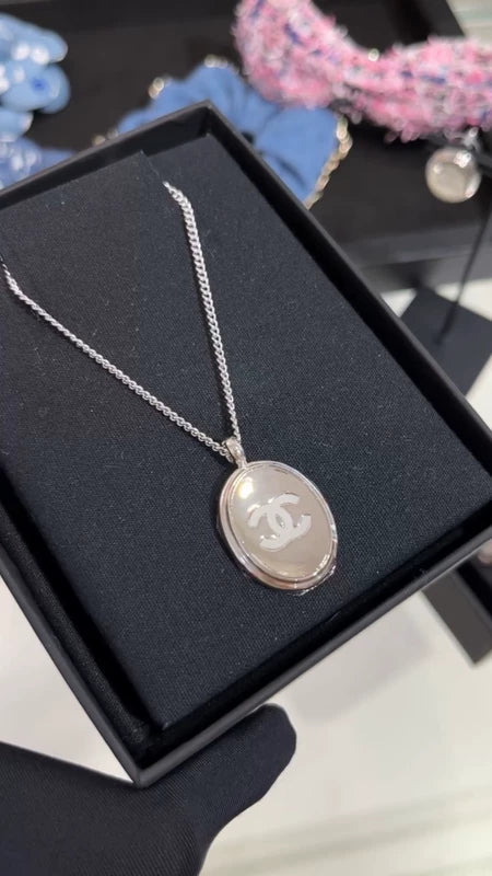 C 25 White Enamel Double C Mirrored Oval Button Necklace