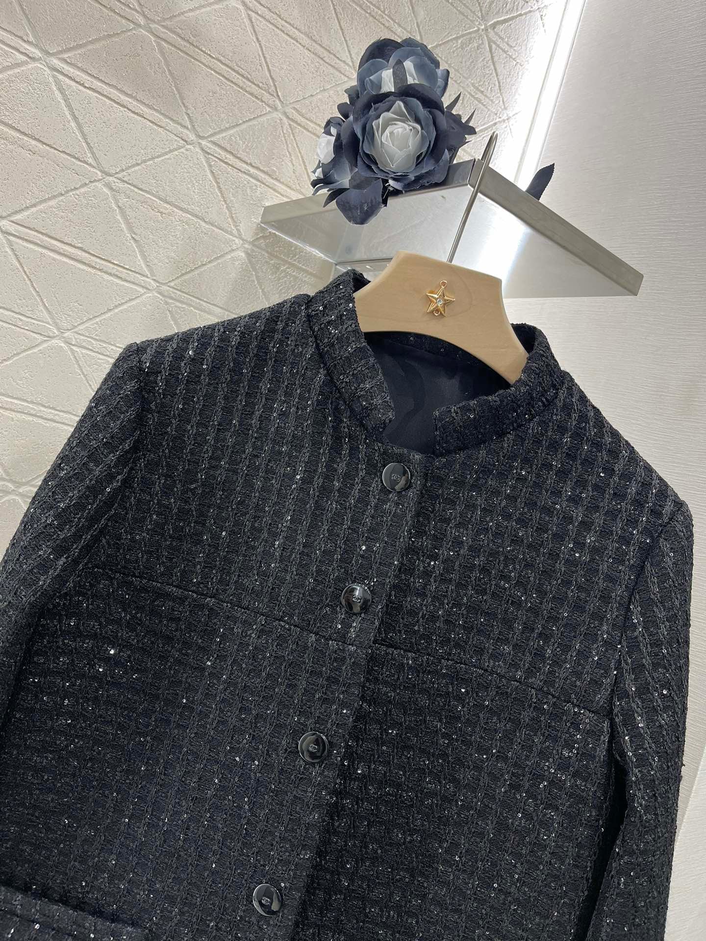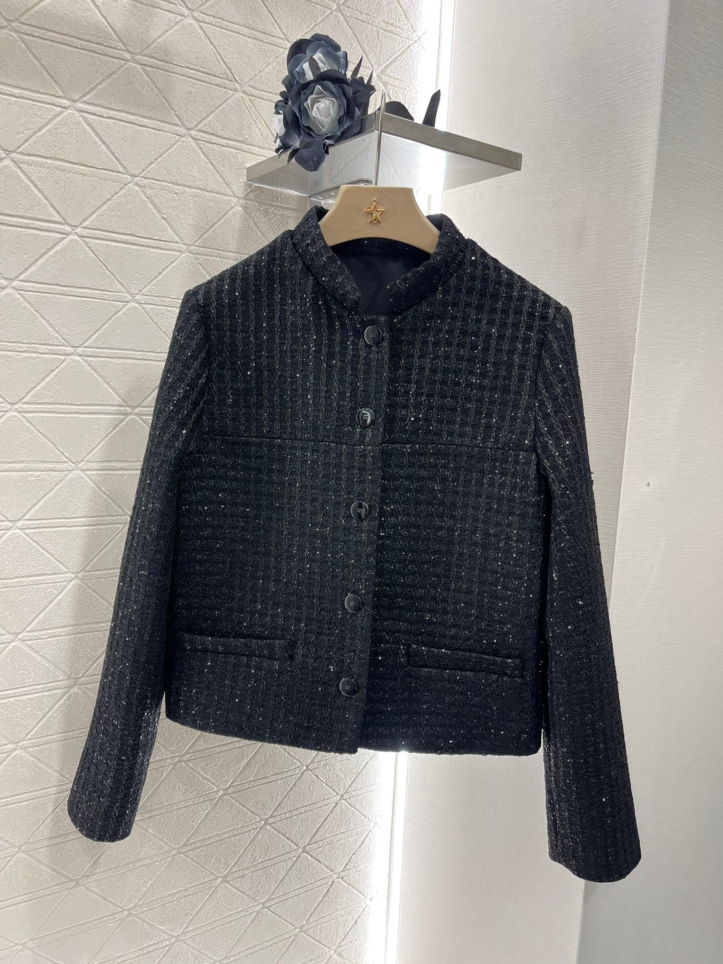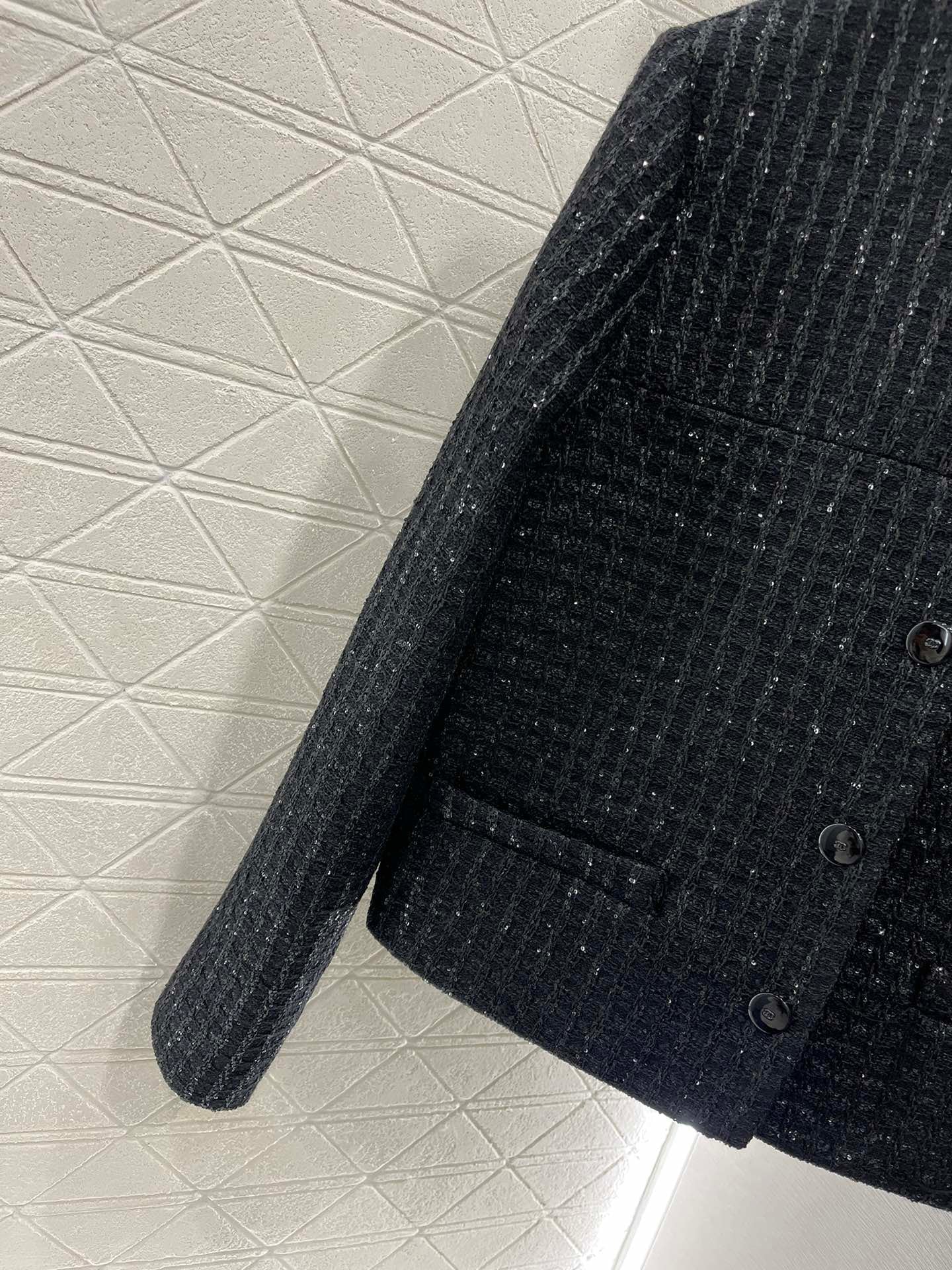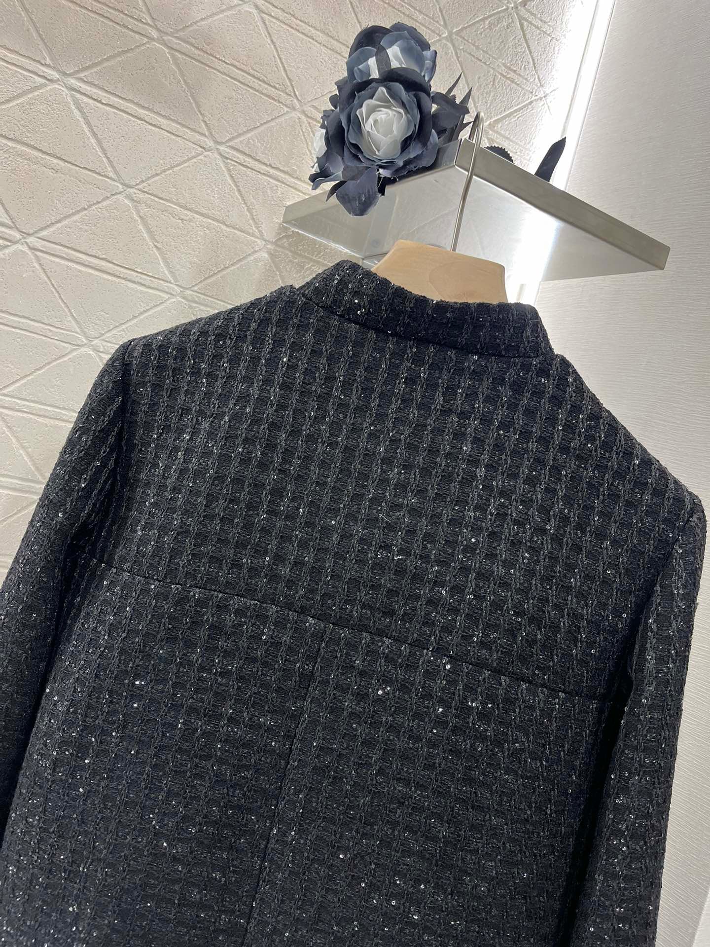 The texture of the woolen fabric is obvious and of superior quality. The coarse striped woolen fabric creates a model of style with double pockets ➕ The heavy buckle on the collar and sleeves exudes luxury while maintaining elegance. The silver woven plaid elements of the ready to wear garment are also present ➕ The details of the small stand collar are low-key and elegant, highlighting the taste of high-end socialites in all seasons. Fashionable and refined dressing is preferred, with white rich American standard and customized materials and accessories. Please identify the high version