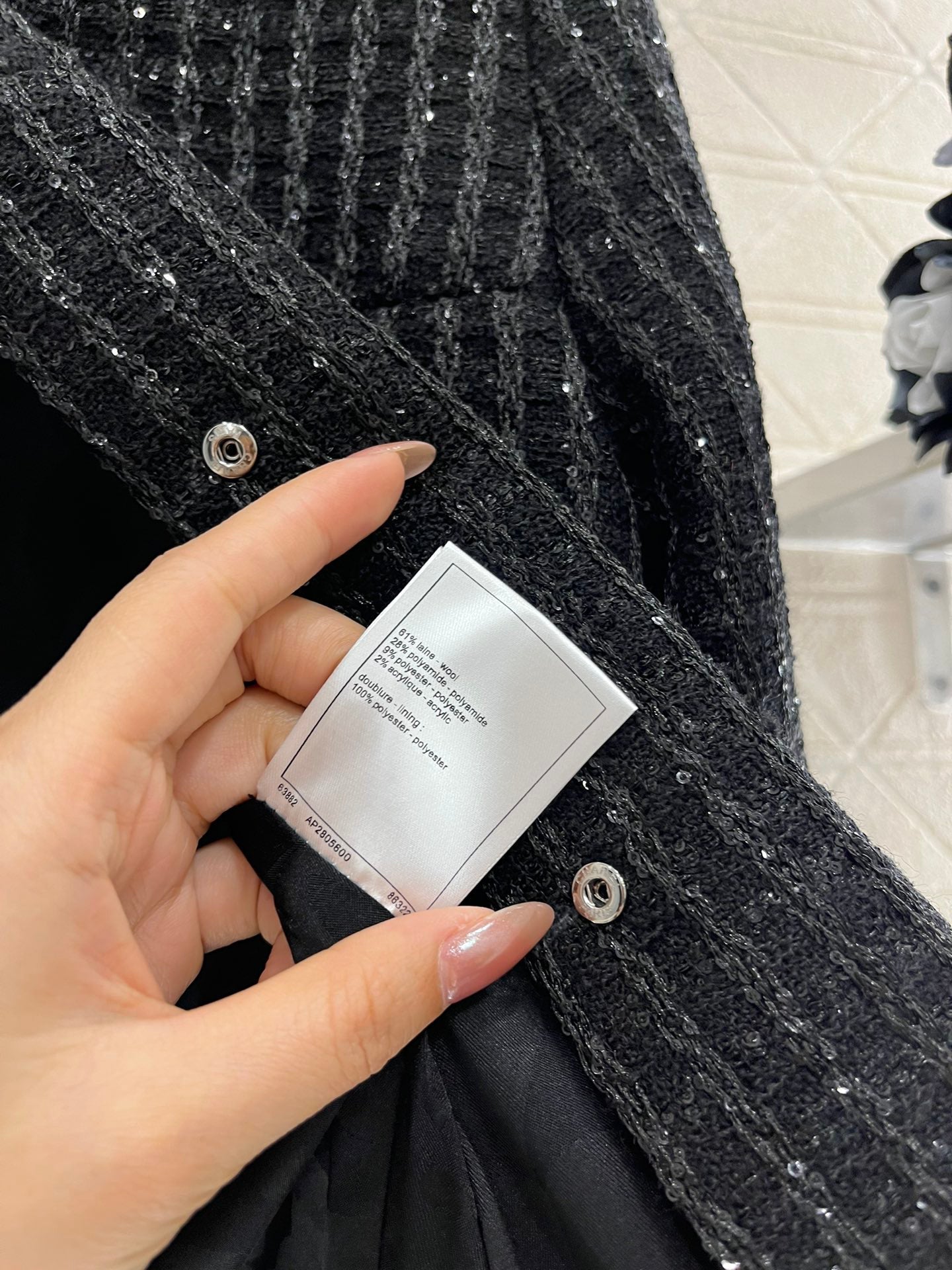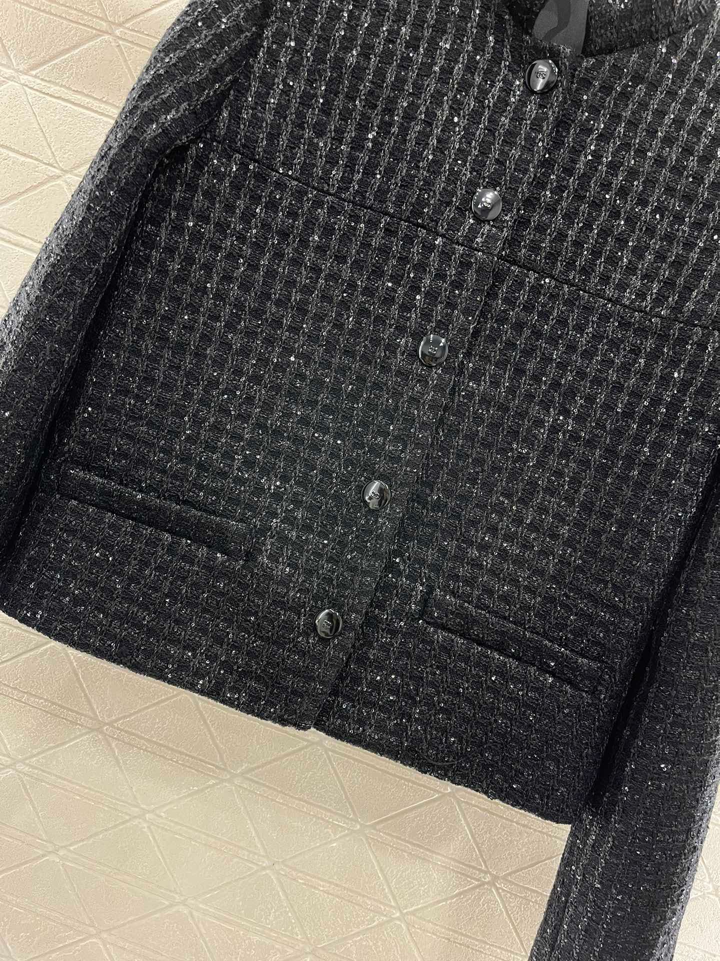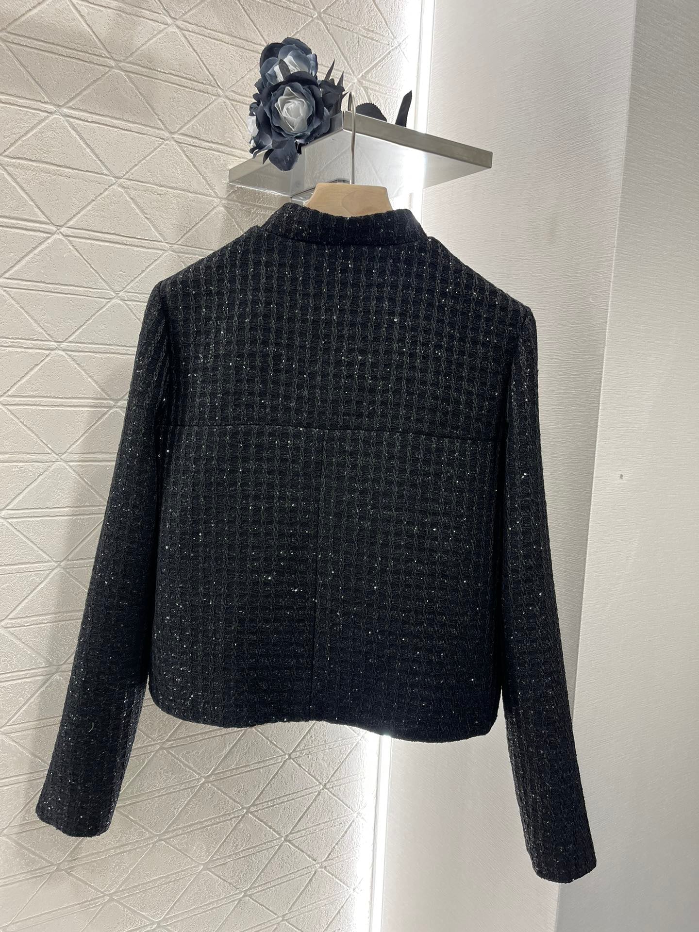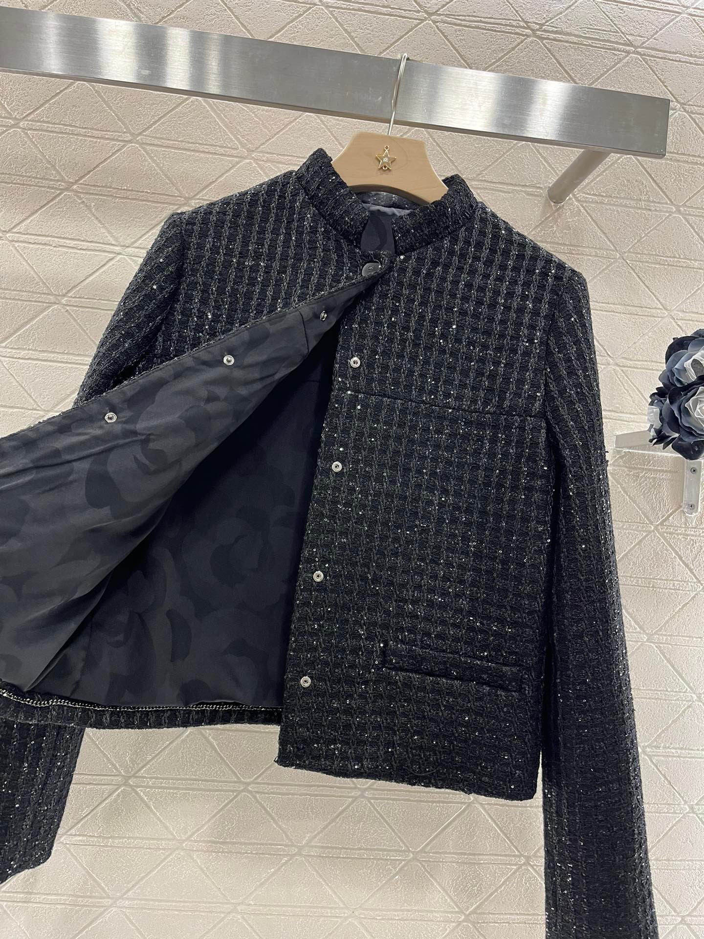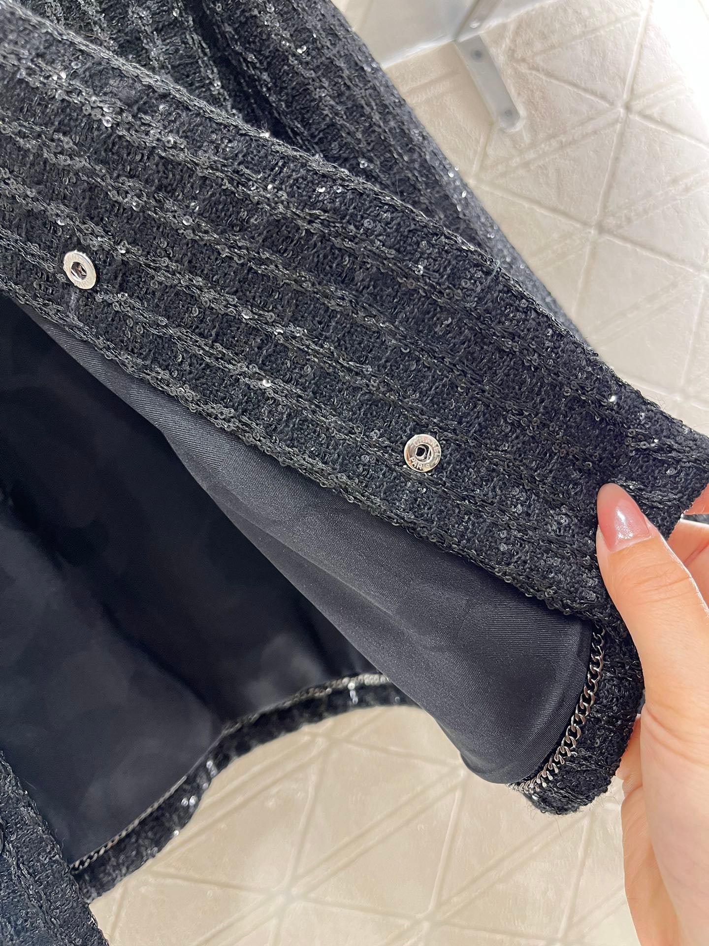 The texture of the woolen fabric is obvious and of superior quality. The coarse striped woolen fabric creates a model of style with double pockets ➕ The heavy buckle on the collar and sleeves exudes luxury while maintaining elegance. The silver woven plaid elements of the ready to wear garment are also present ➕ The details of the small stand collar are low-key and elegant, highlighting the taste of high-end socialites in all seasons. Fashionable and refined dressing is preferred, with white rich American standard and customized materials and accessories. Please identify the high version