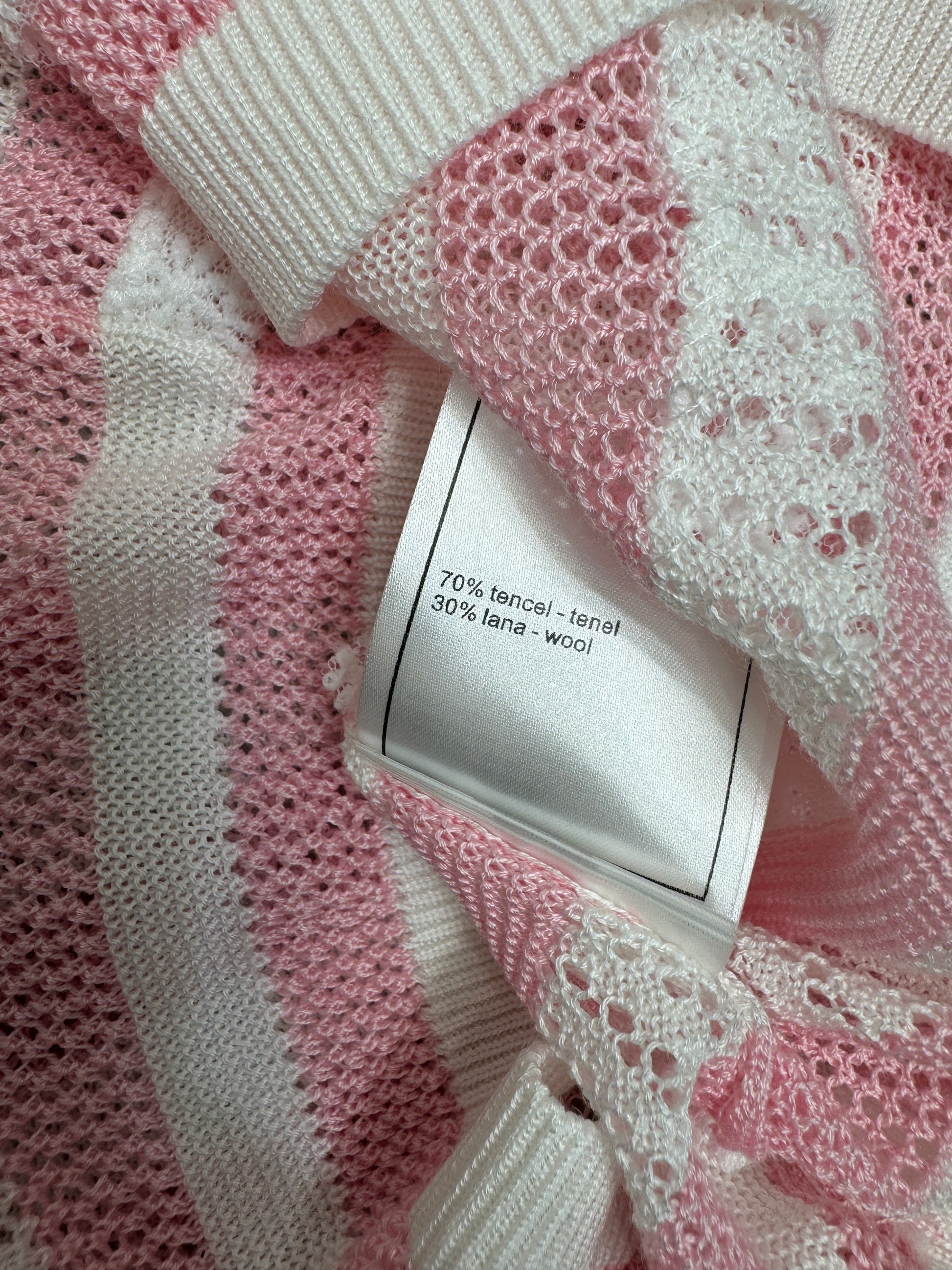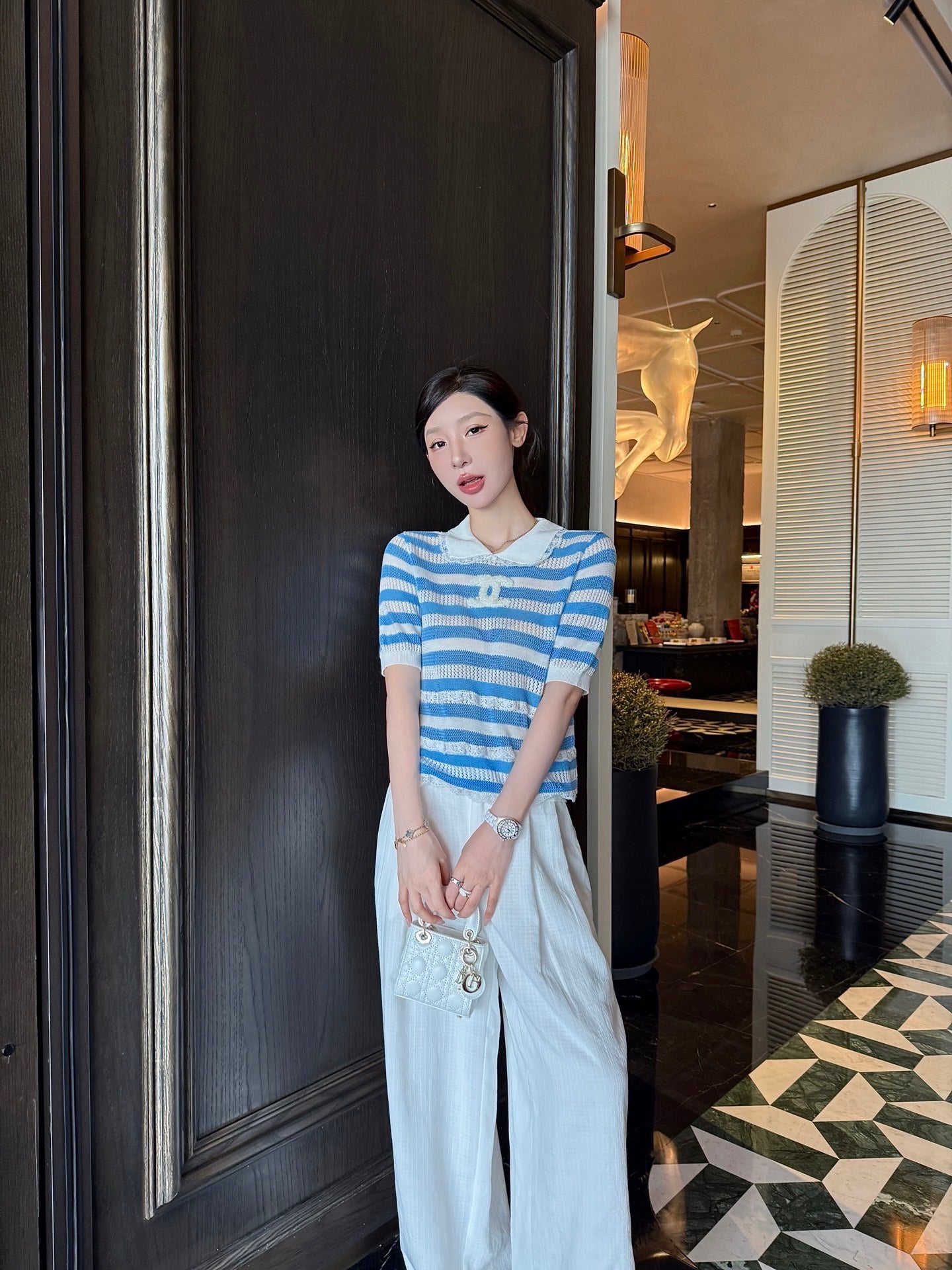 Custom YB imported blended yarn weaving Fabric comfortable and breathable Body color collision stripes hollow texture ➕ splicing lace crochet design Chest brand double C micro-label embellishment Exquisite elegance and no loss of temperament Summer refreshing must-have!