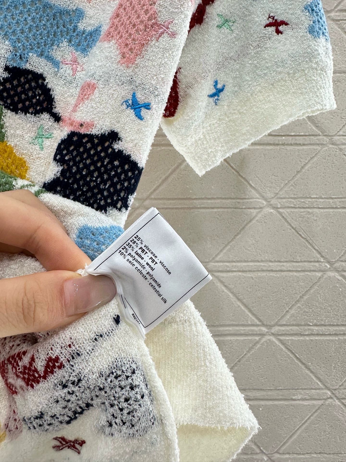 Crafted from cashmere yarn, it is comfortable, breathable and easy to wear, with a round neckline and short sleeves, the cardigan is cut from a fine knit with colorful yarns that combine to form a colorful cloud-like pattern. The artistic color texture adds a lively and fashionable tone, and the embroidered bird logo slims down the figure, making it a versatile style that is age-appropriate and suitable for ageing, chic and retro styles.