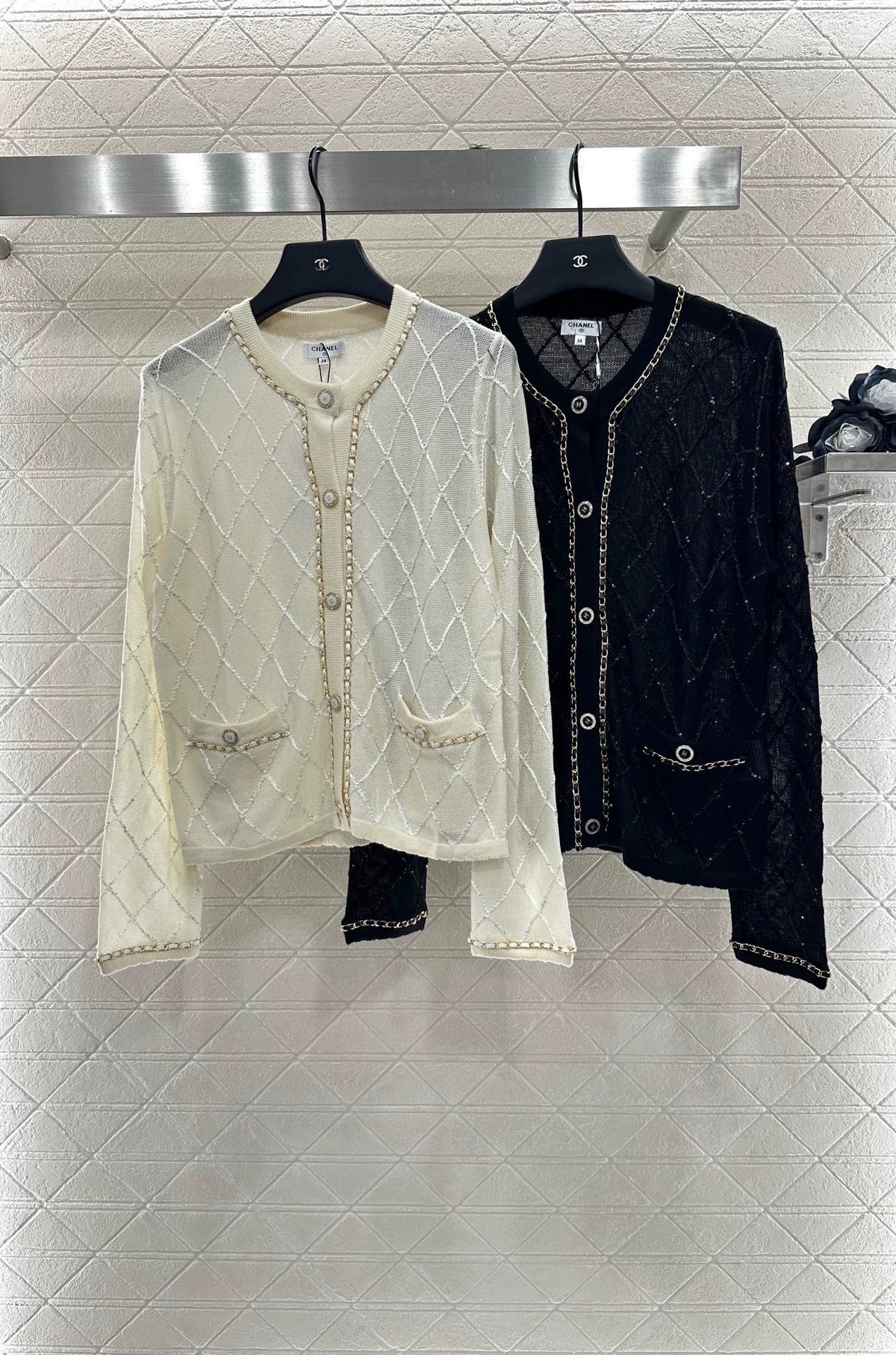 Crafted from custom YB imported yarn, this cardigan boasts a premium, refined look. Its straight-shoulder design enhances the figure's slenderness and height. The diamond-patterned pattern is accented with sequined silk thread throughout. The collar and cuffs extend to the front and hem, adorned with a three-dimensional leather chain binding. Embellished with a double-C-stamped placket, this cardigan highlights a sophisticated and elegant look, perfectly embodying the refined elegance of a wealthy woman. Custom-made fabrics and accessories are available. Look for the latest edition.