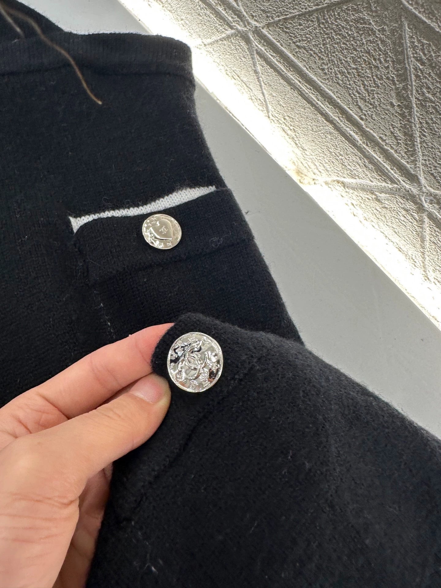 Crafted from custom YB cashmere yarn for a comfortable, wooly feel, this knitted slip dress features a simple yet elegant silhouette and a solid color. The flat neckline juxtaposes with the bodice. The embossed gold buckle echoes the rhinestone-embellished double C buckles on the shoulder straps, elevating the simple elegance to a touch of understated luxury. Elastic thread at the waist effortlessly defines the waist, creating a well-proportioned look and adding a touch of luxury. White binding accents the pocket edges for an elegant, stylish look. Includes a delicate lace-up dust bag. Custom fabrics and accessories. Look for the latest version.