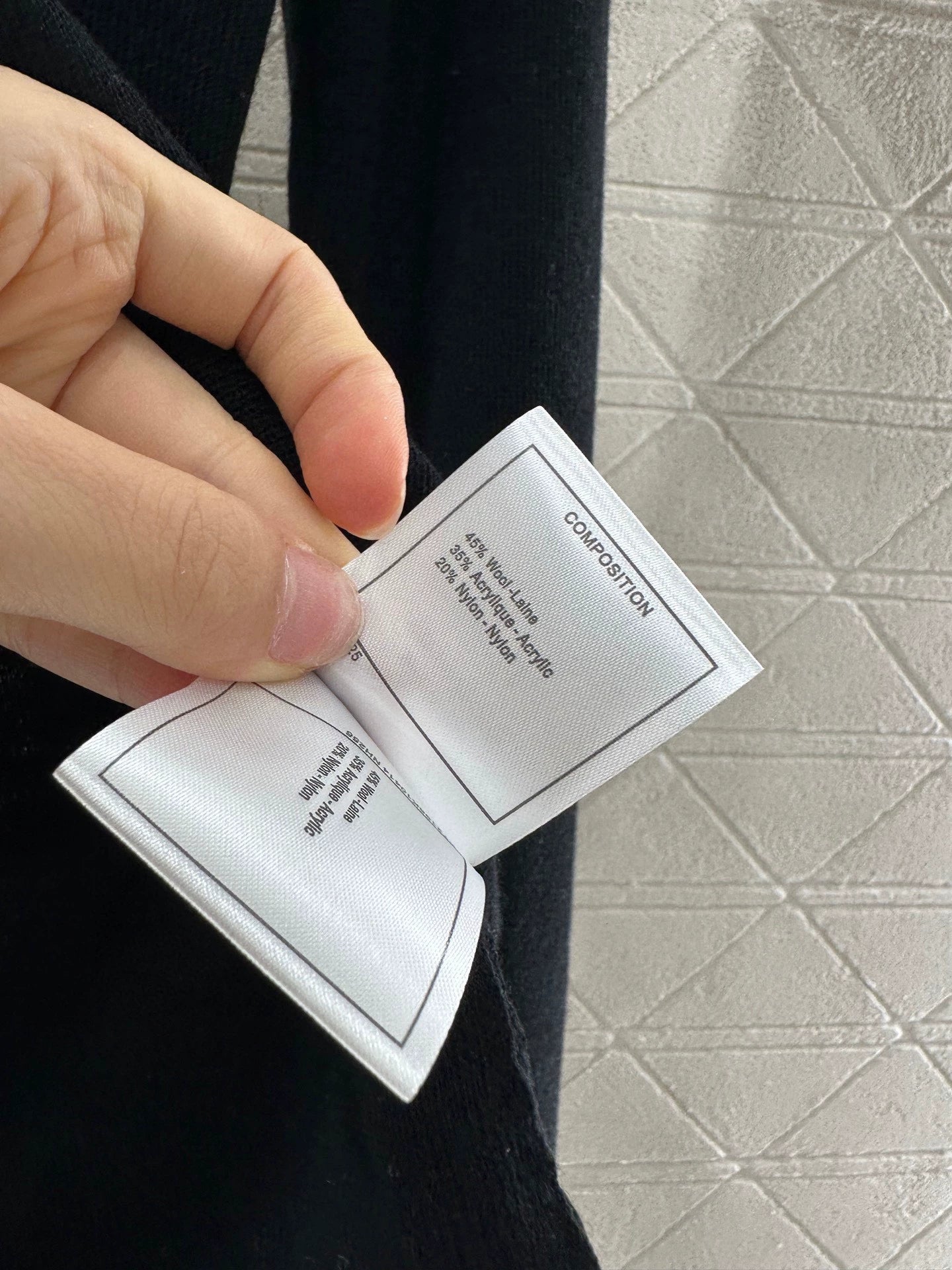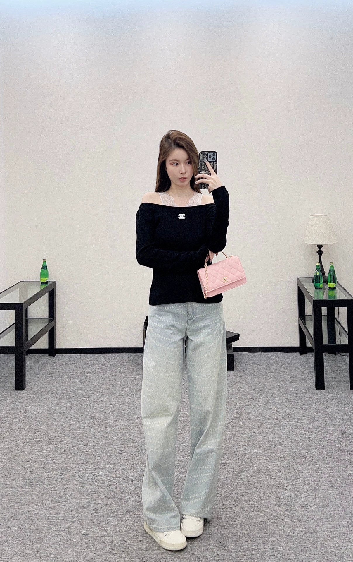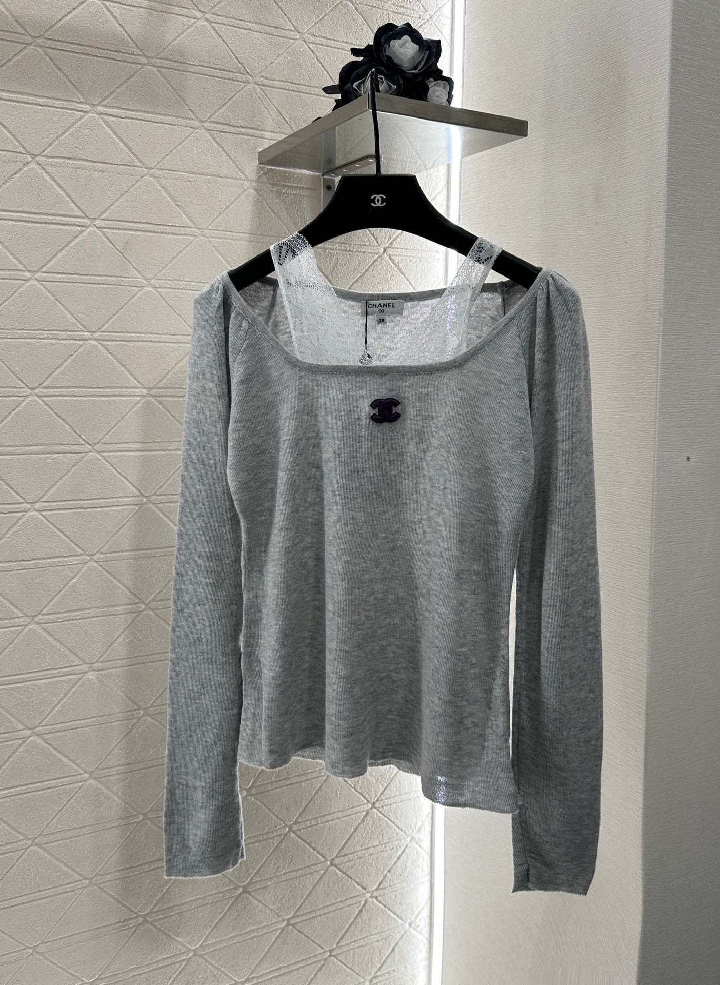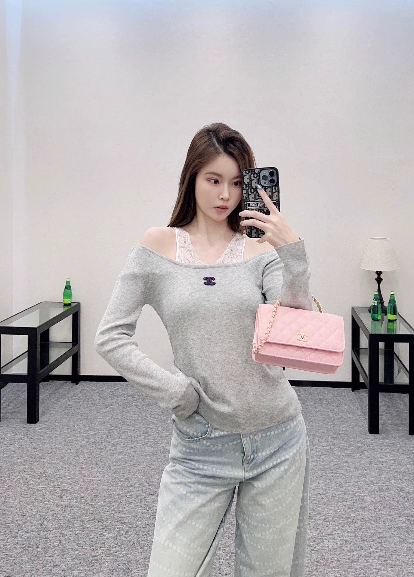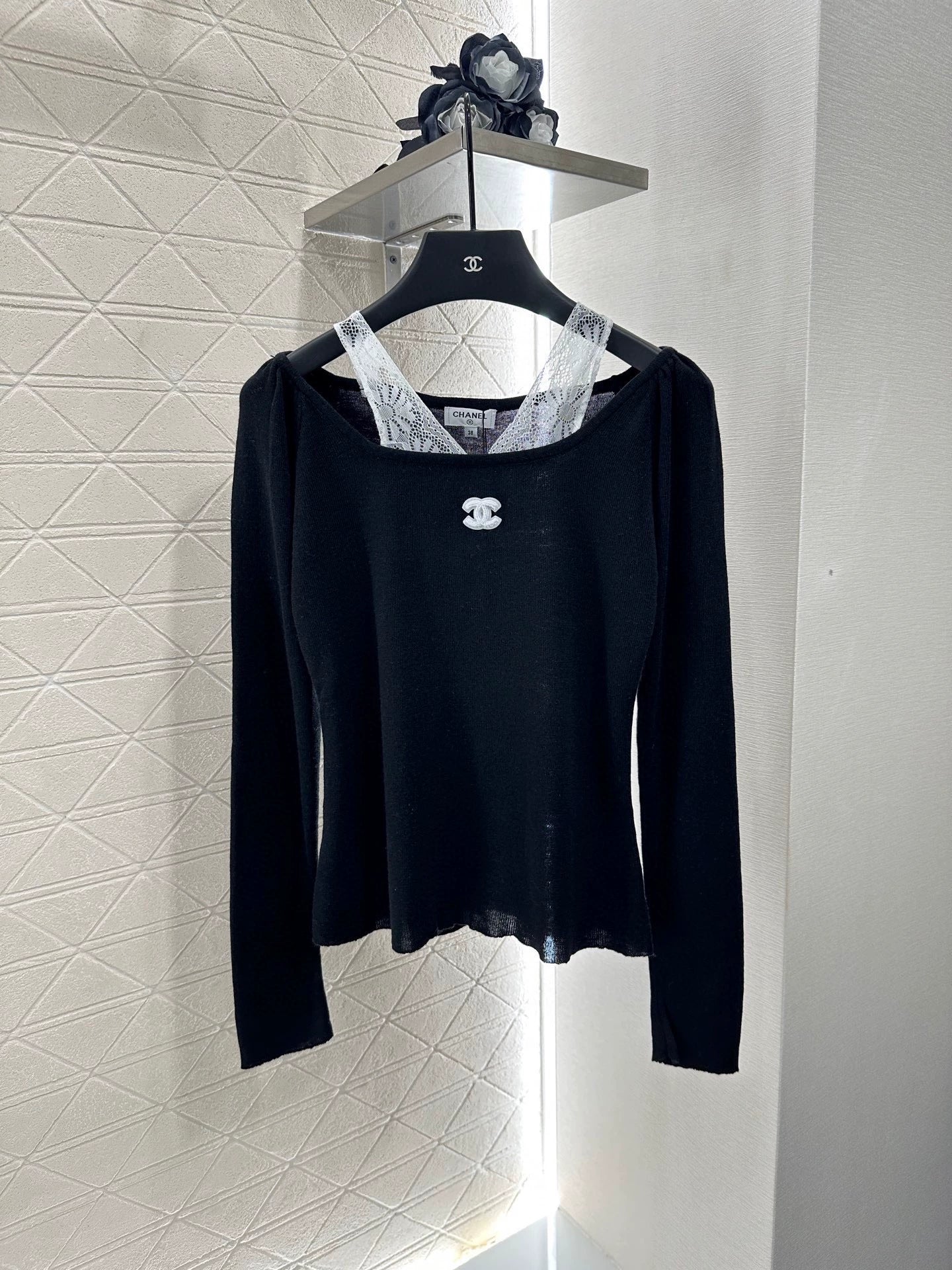 Customized YB wool yarn weaving, comfortable texture, elastic and easy to wear, long-sleeved elastic top cut, large flat collar lined with lace suspenders, creating a fake two-piece layered design, rich layers and elegant charm, iconic double C decoration on the chest, adding a light luxury texture, getting rid of boring monotony, light and slim fit, fits the body shape, looks slim and advanced, showing elegance, can be worn inside or outside in autumn and winter, customized surface and accessories, look for the version, high version