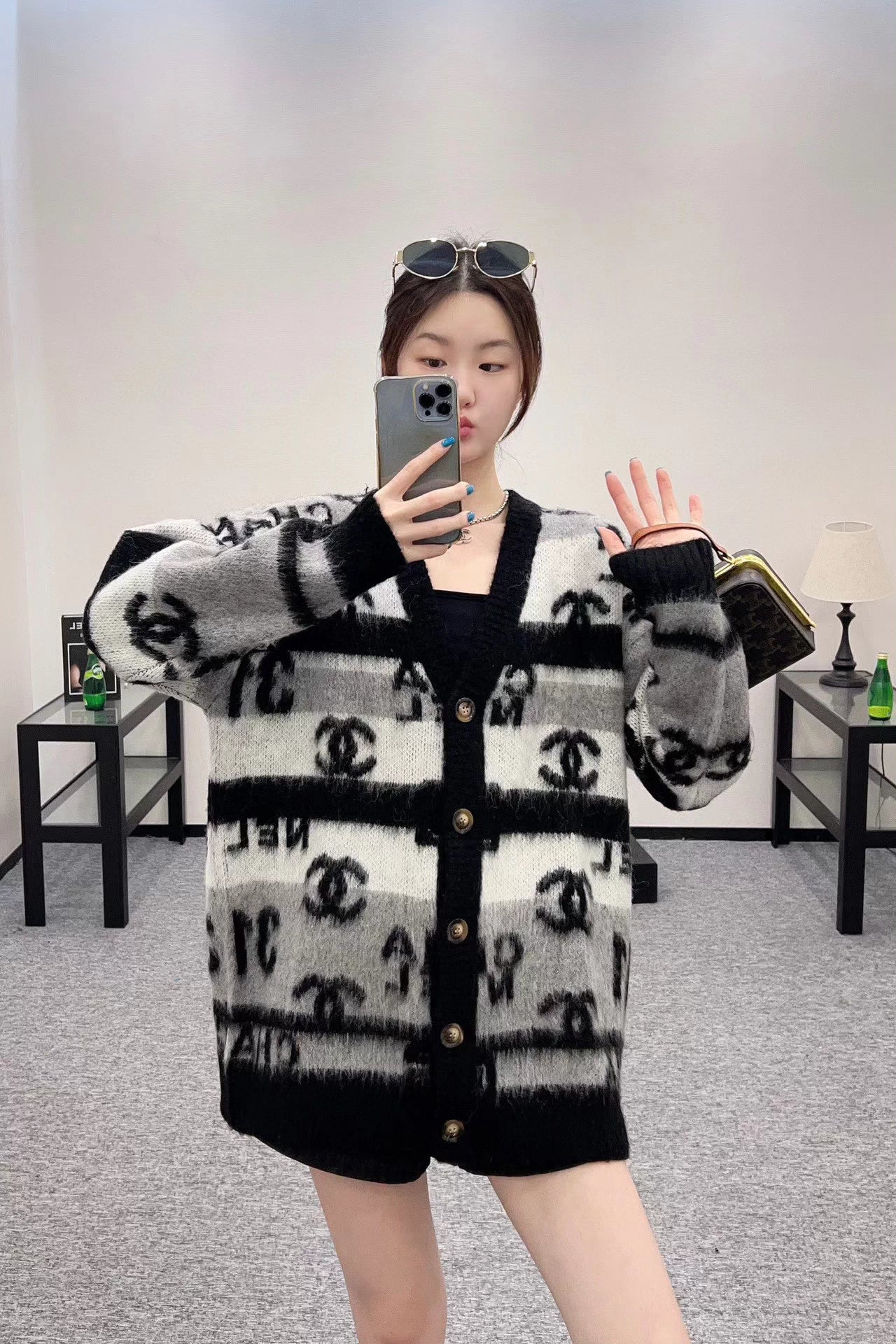 C 25 Letter jacquard V-neck knitted wool and cashmere cardigan