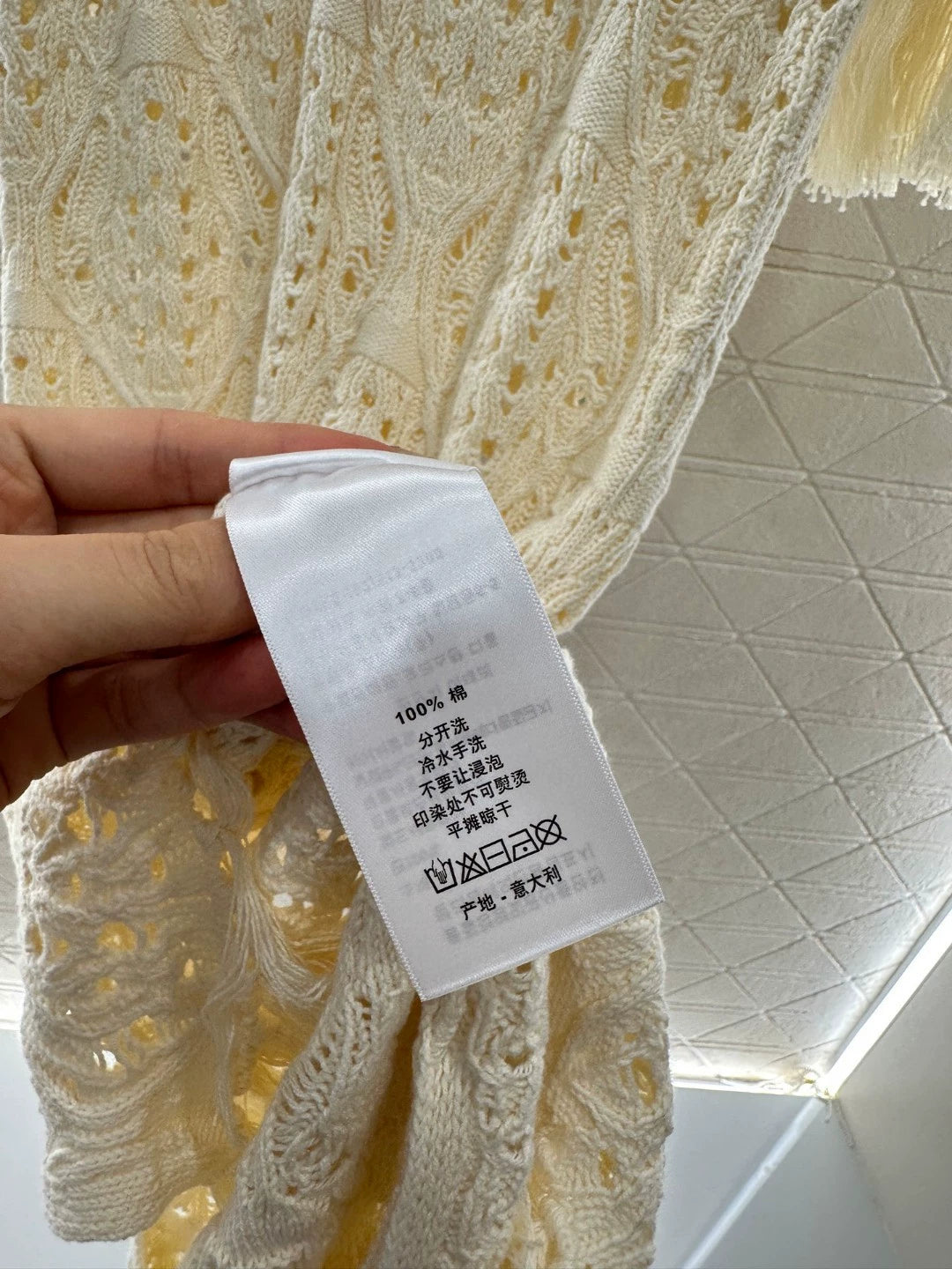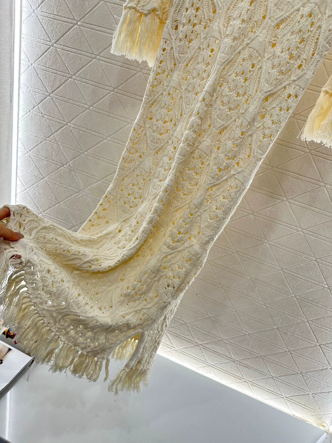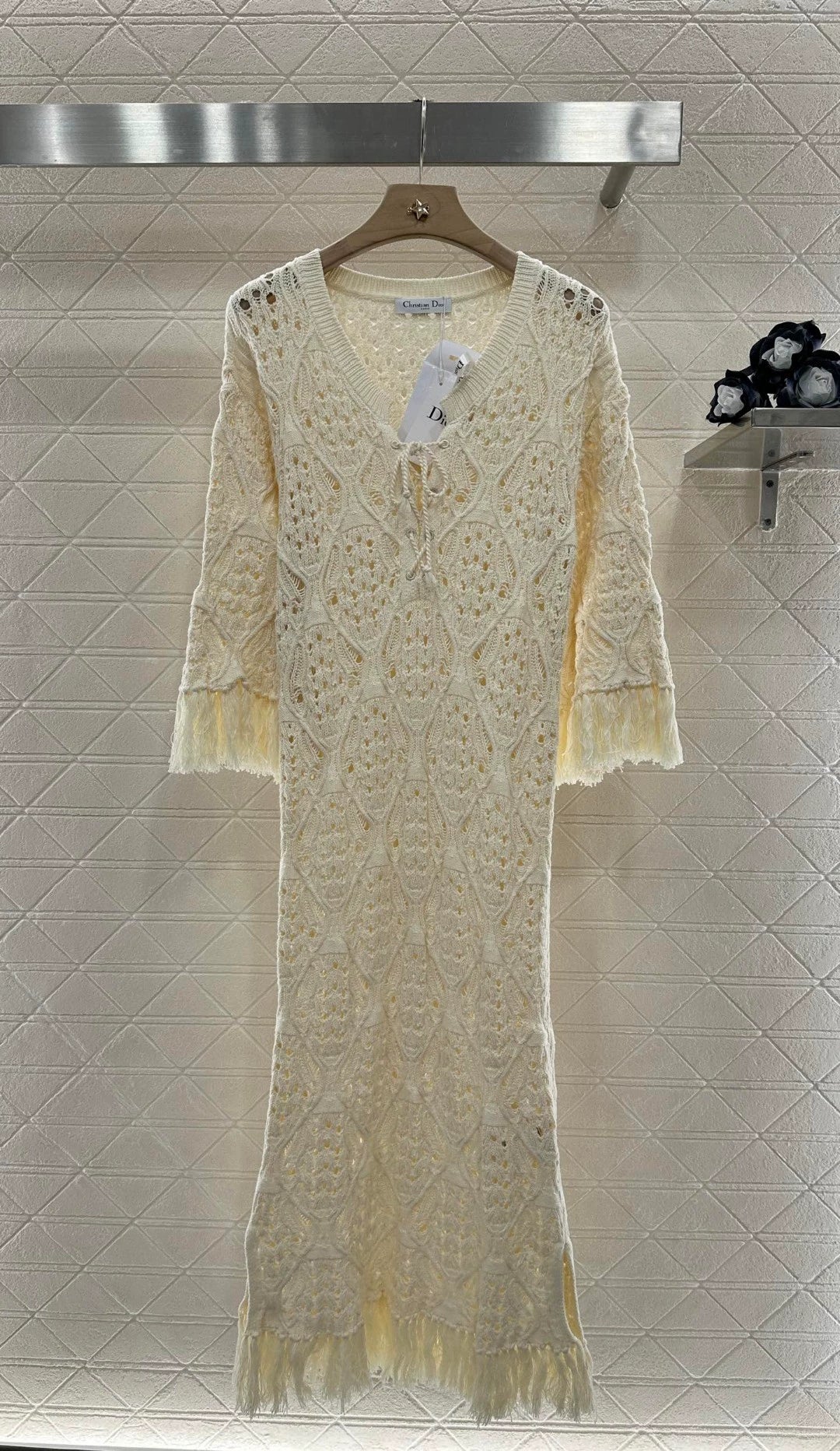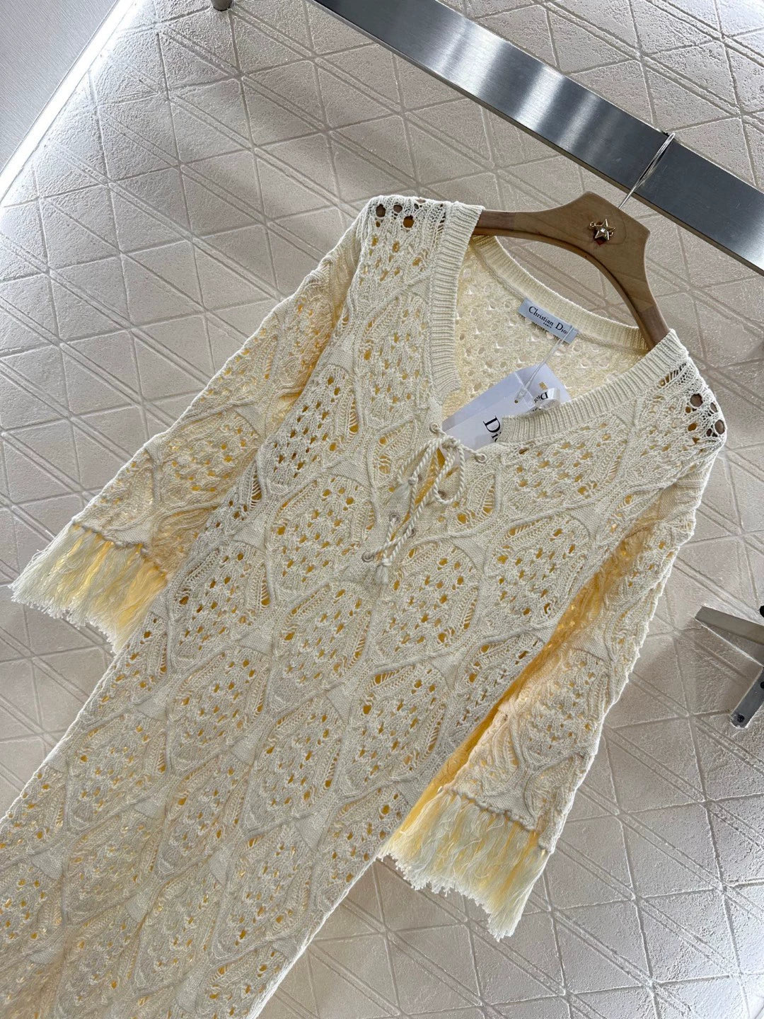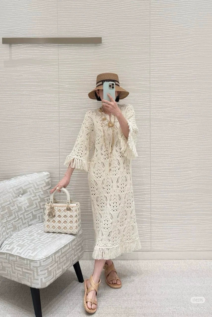 Cotton yarn weaving Soft and skin-friendly Comfortable and stylish Peach heart collar knitted dress cut Neckline with tie to adjust the elasticity Proper skin exposure Beautify the proportion of the head and shoulders more thin Wrapped edge and the large body diamond crochet pattern to form a sense of layering Cuffs and hemline long fringe interweaving with the mid-length skirt Retro literary style strong Regular fit body-con playful aging whitening Easy to handle daily trips or parties