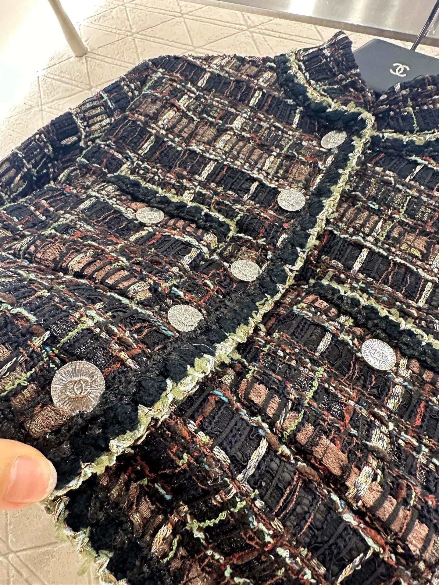 Customized YB imported wool tweed with a distinct texture and premium quality. This tweed fabric embodies a style. A small stand-up collar, double pockets, and a single row of heavy-duty metal buttons. Gold wavy edging throughout exudes luxury and elegance. The black background is woven with silver and white silk thread, creating an elegant and captivating plaid pattern that highlights a sophisticated lady's style. Paired with the matching skirt, the details complement the design. The slightly A-line silhouette flatters the waist and improves leg proportions. A perfect choice for autumn and winter fashionistas. Elegant and refined. Custom fabrics and accessories. Look for the high-end version.