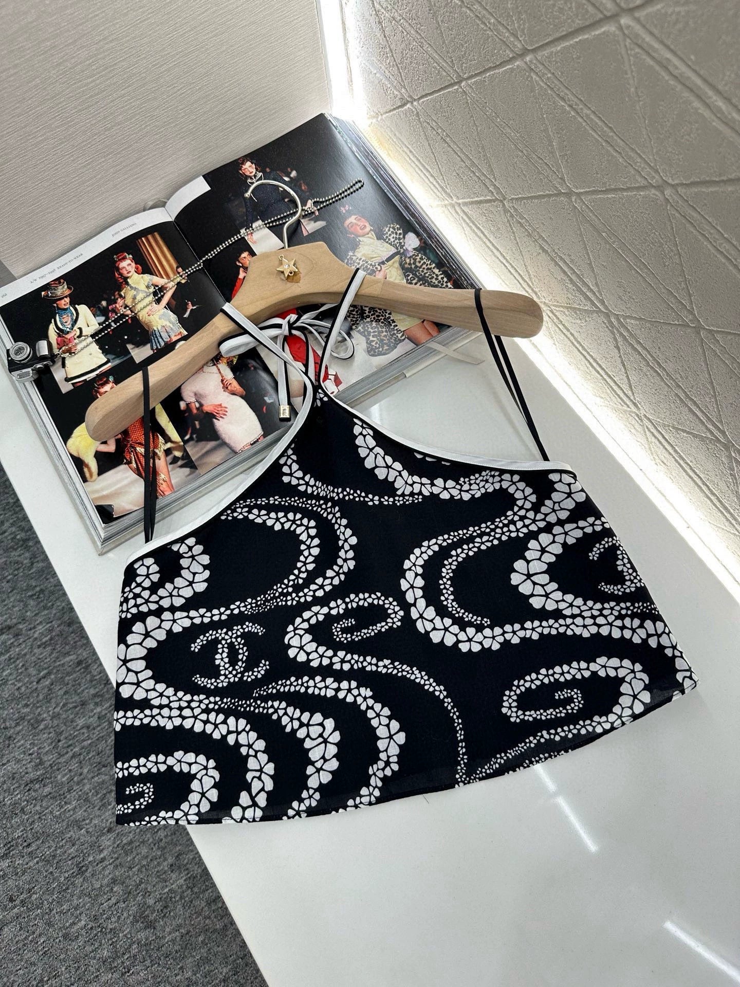 Imported twill consistency material, fresh and breathable, soft and skin-friendly, presenting a light and slightly transparent texture Hanging neck undershirt with waist side tie straight mid-length skirt set All printed with irregular and staggered camellia pattern, complicated visual effect, creating a romantic and aesthetic style, full of personality and creativity, short on the top and long on the bottom, trimming the body to beautify the ratio, and dewiness to make the vacation feeling full.