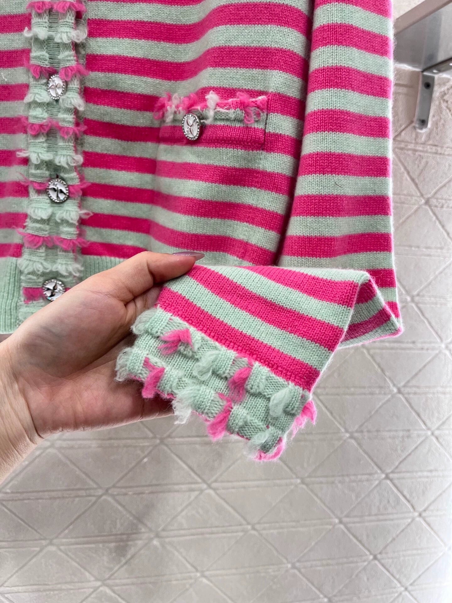 Custom YB cashmere yarn weaving texture senior comfortable round neck knitted cardigan body two-color striped pattern interweaving ➕ leader mouth hem lace outline youthful feeling full of candy color scheme more show style lively flying fish round buckle decoration highlight the brand personality highlighting wear senior sense of elasticity elastic more show delicate wear thin show loose tone luxury fashion temperament single wear layering can be four seasons fashion wear preferred custom fabrics and accessories recognized version