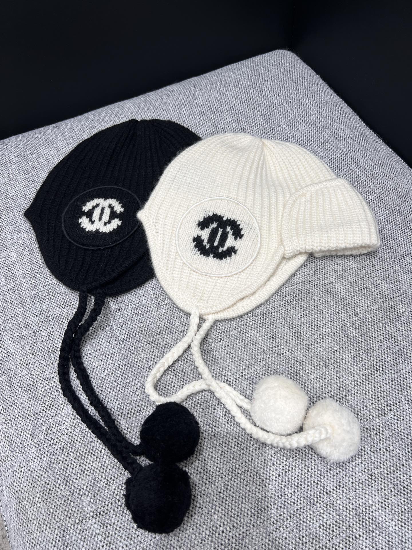 ⚠Exclusively developed by YB! High-quality product! Made of cashmere yarn, this knitted hat is contoured to your head and soft to the touch. Available in classic and versatile black and white. The earrings have a draped feel, and the long pom pom strap adds a cute touch. Layered design details highlight the brand's style. Extended sides provide protection from the ears, effectively blocking wind and adding style. The casual and versatile style complements any top. A stylish and fashionable accessory for fall and winter. Includes a delicate lace-up dust bag. Available now. One size fits all.