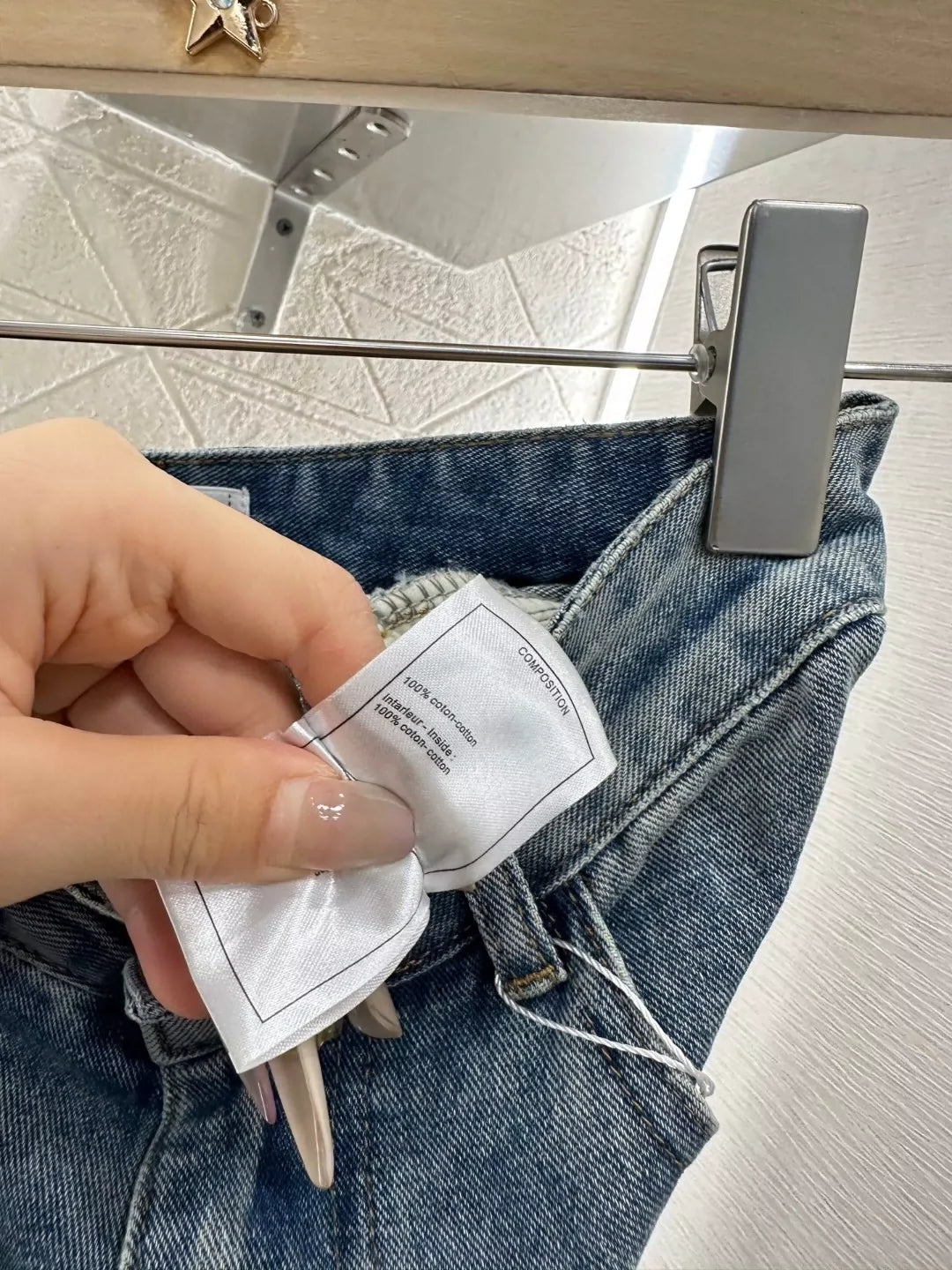 Twill cotton denim material, multiple washes, presenting a firm texture, all vintage light blue color, the thighs of the knee to restore the natural whitening effect of a full sense of retro, lace outlined to create a complex visual effect, highlighting the romantic and aesthetic style, full of personality and creativity.