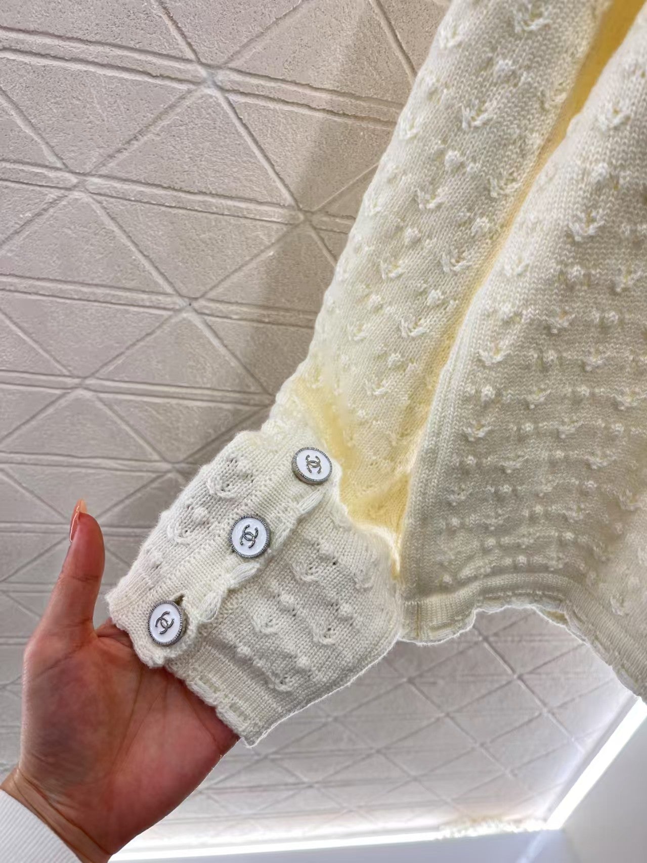 High-quality texture, comfortable and soft. Round neck knitted cardigan cut. Cable knitted heavy crocheted texture all over the body + buttons and multiple pockets. Rich and gorgeous layers. Eye-catching. Easily highlights the brand details and texture. More fashionable and versatile. Short version modifies the proportion. Fashionable and casual.