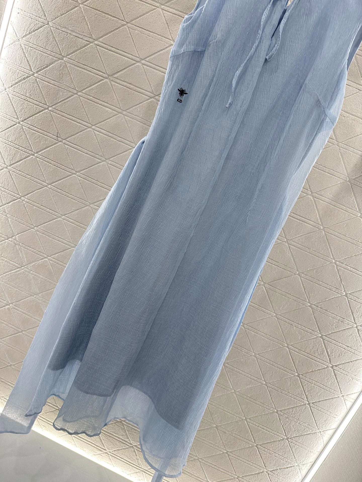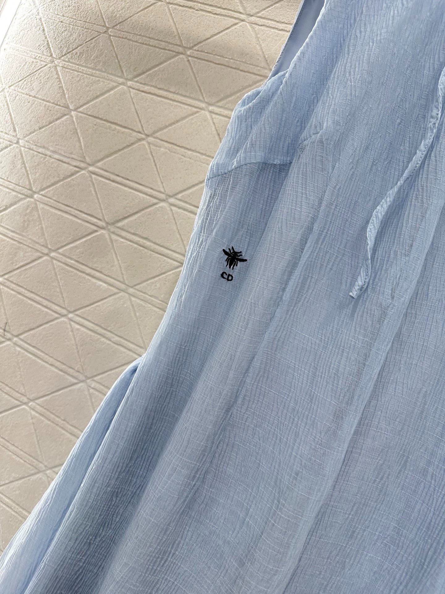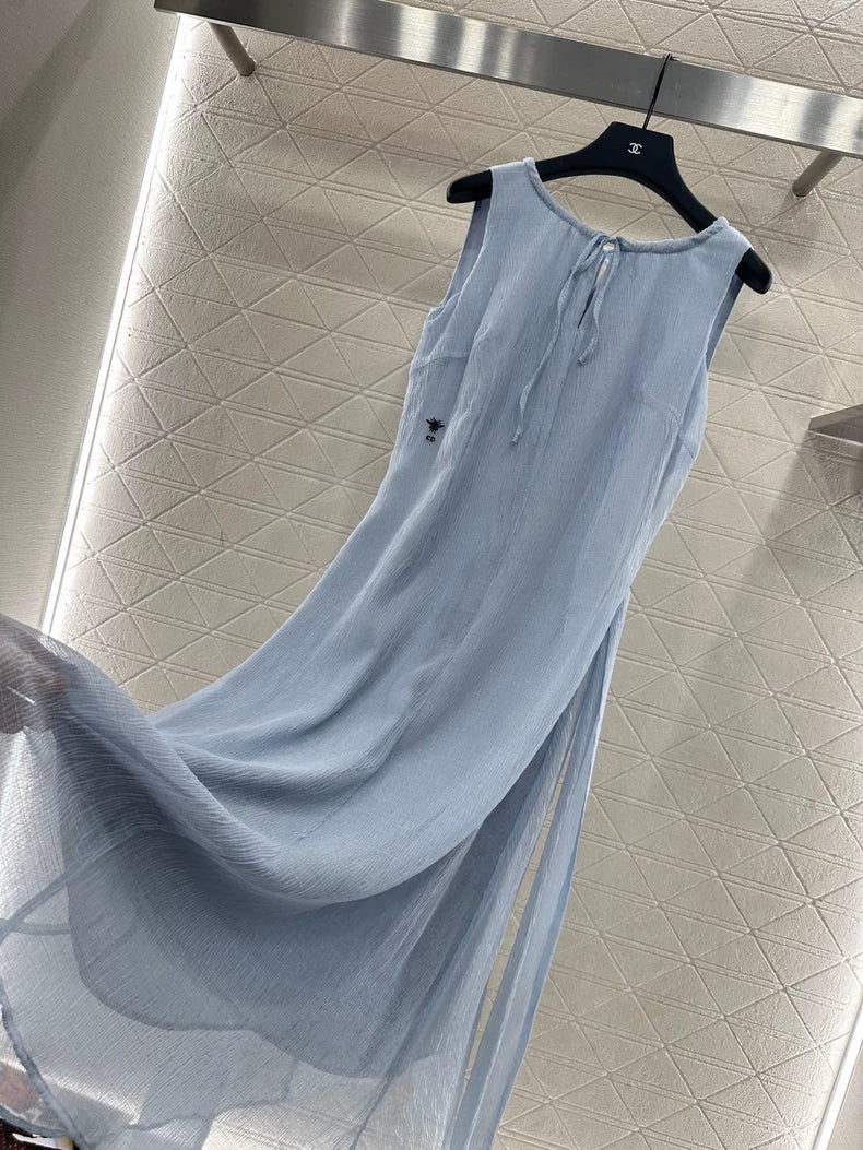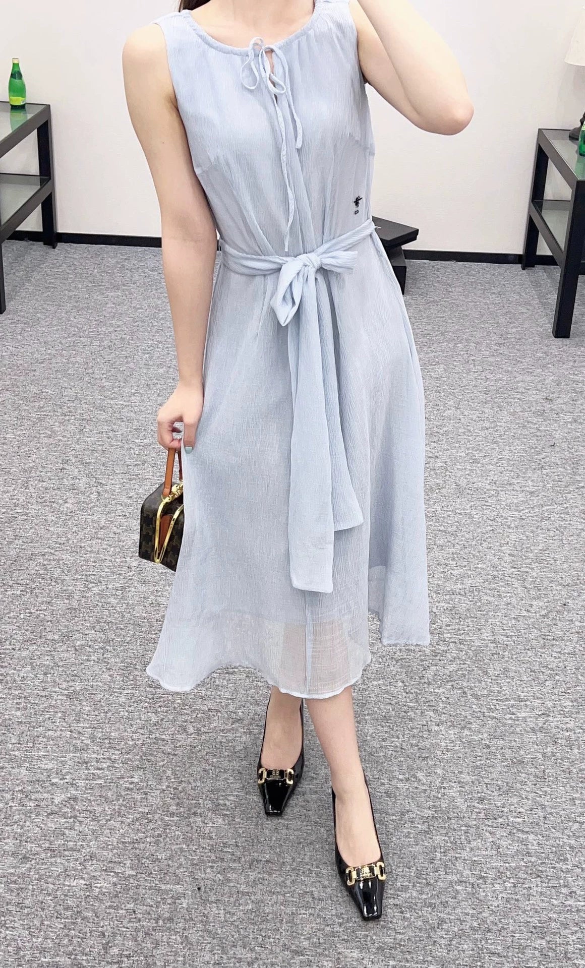 Custom YB imported chiffon fabric, textured and lustrous, with a sheer, flowing silhouette. The vest dress cut is primarily solid, but the tailoring and details enhance refinement. The straight, loose hem is wrapped with a belt made of natural fabric, flattering the figure and embracing the waist. The details highlight the elegance and add a touch of refinement, framing the graceful figure. The bee logo embellishment creates a simple, intellectual look, creating a youthful, pure look. Custom fabrics and accessories are available. Look for the latest version.
