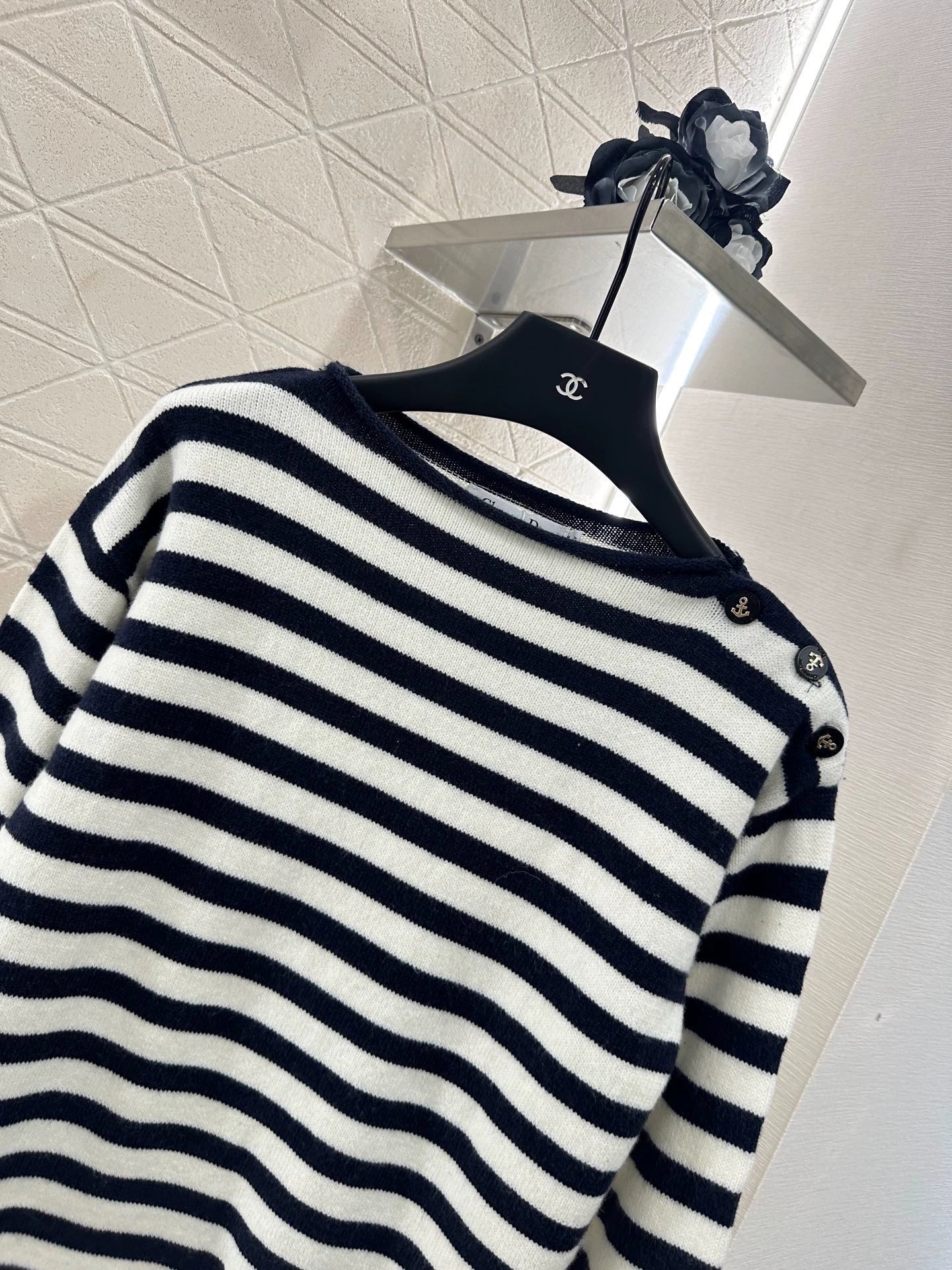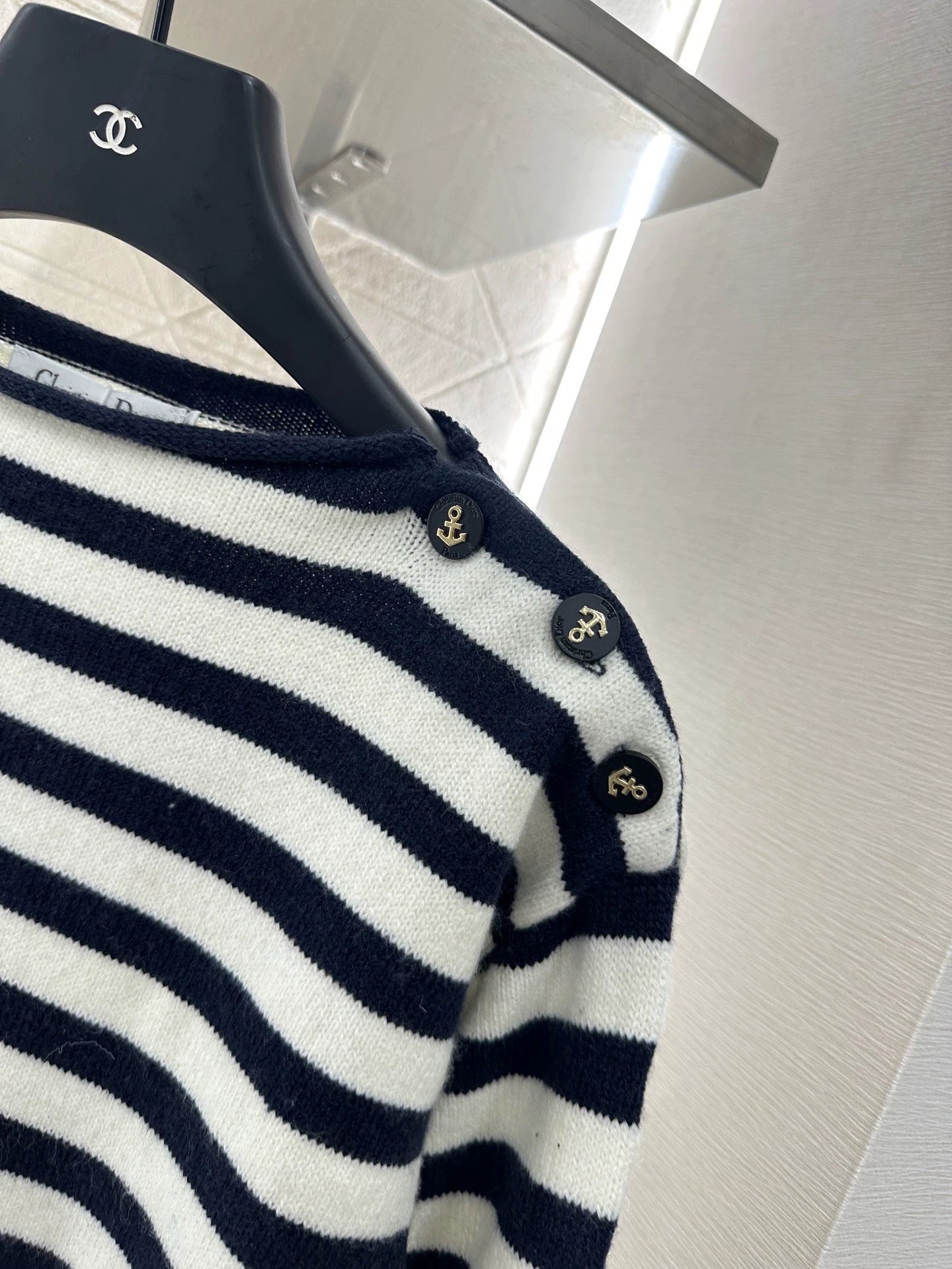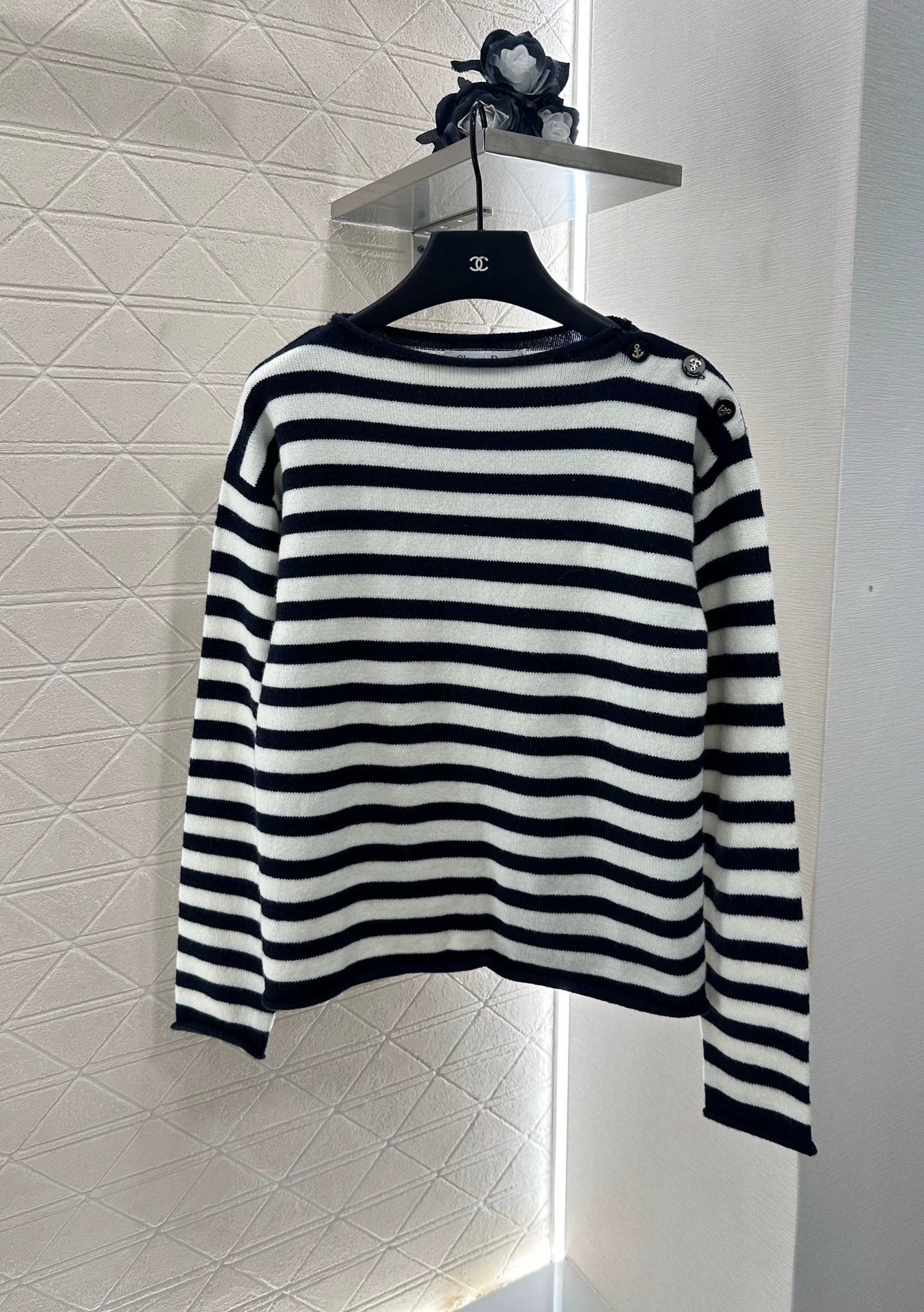 Crafted from custom YB wool yarn for a refined texture and comfort, this pullover top features a relaxed, dropped-shoulder silhouette. Ribbed hems and adjustable shoulder buckles accentuate the design. The anchor design enhances the free-flowing, naval style and flatters the head-to-shoulder ratio for a slimmer look. Two-tone stripes throughout. Embroidered back monogram logo adds a touch of class and visual flair. Perfect for everyday wear or events. Custom fabrics and trims. Look for the latest version.