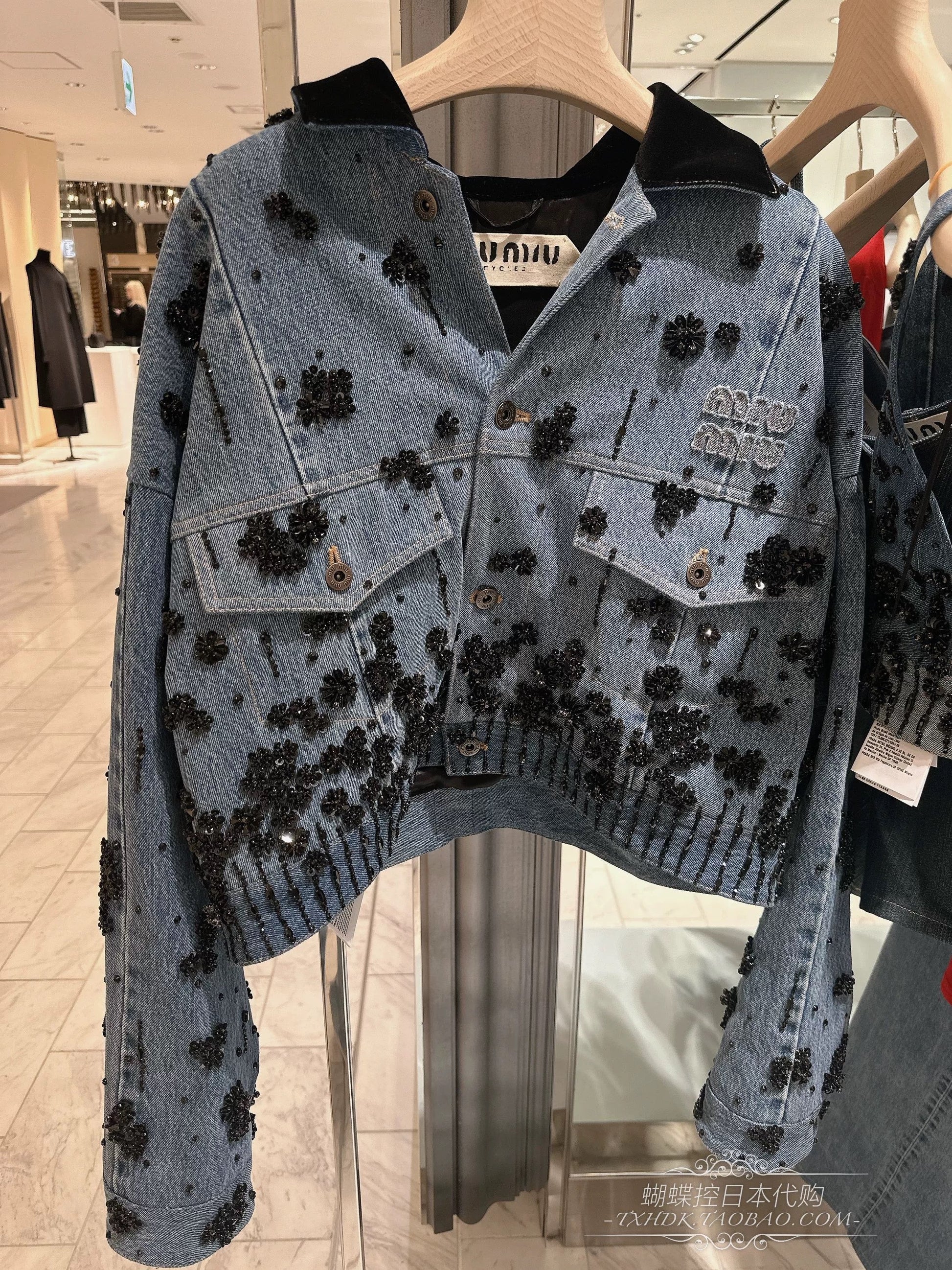Crafted from washed blue denim, this cropped jacket embraces a laid-back vintage feel while elevating it with hand-applied black beaded floral embroidery throughout. The embellishments create a dimensional sparkle, catching the light with subtle movement. Designed in a drop-shoulder silhouette with a gathered hem, it strikes the perfect balance between structure and ease. The contrast black velvet collar adds a sophisticated twist, while the classic flap chest pockets infuse utilitarian charm.
