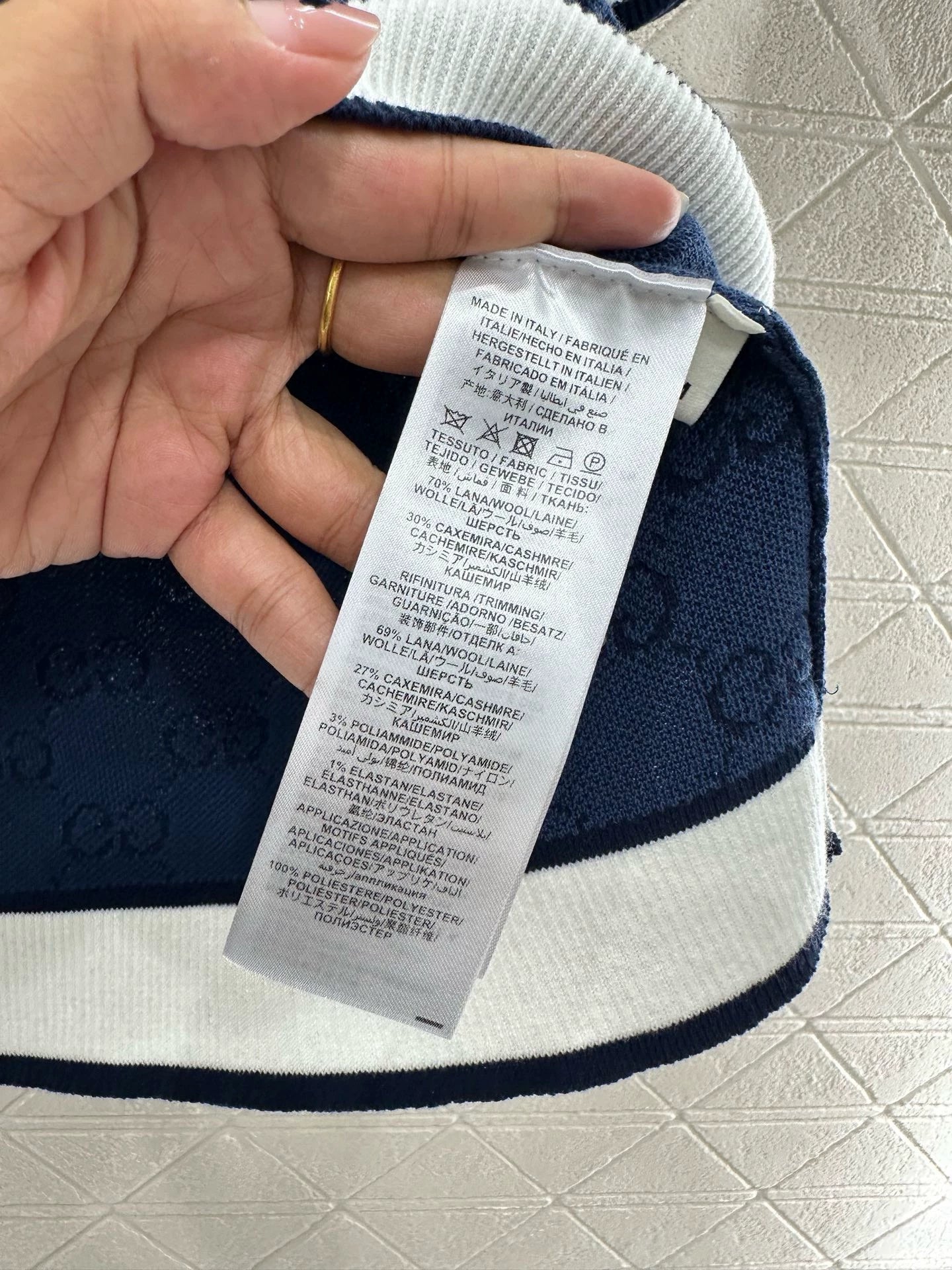 Crafted from cashmere yarns for comfort and breathability, the short-sleeved knit top is cut in a two-color interweave with an all-over print in a lattice pattern and fixed-color dyeing, with a rounded neckline that's appropriately revealing and flattering to the head-and-shoulders ratio. The cuffs, hemline, and neckline are accented in white for contrast, and the fit is regular, slimming, and playful, for everyday outings or relaxed gatherings.