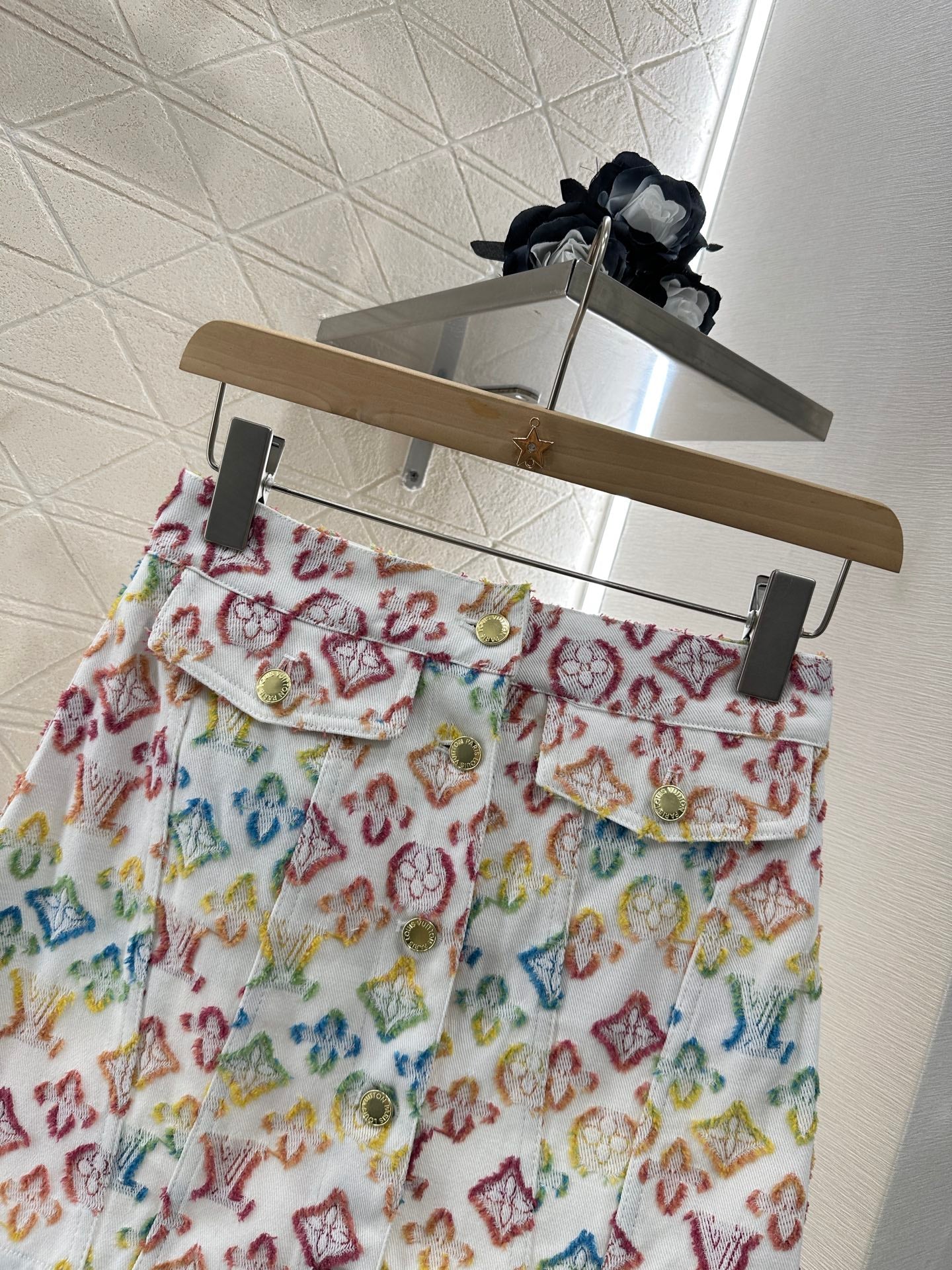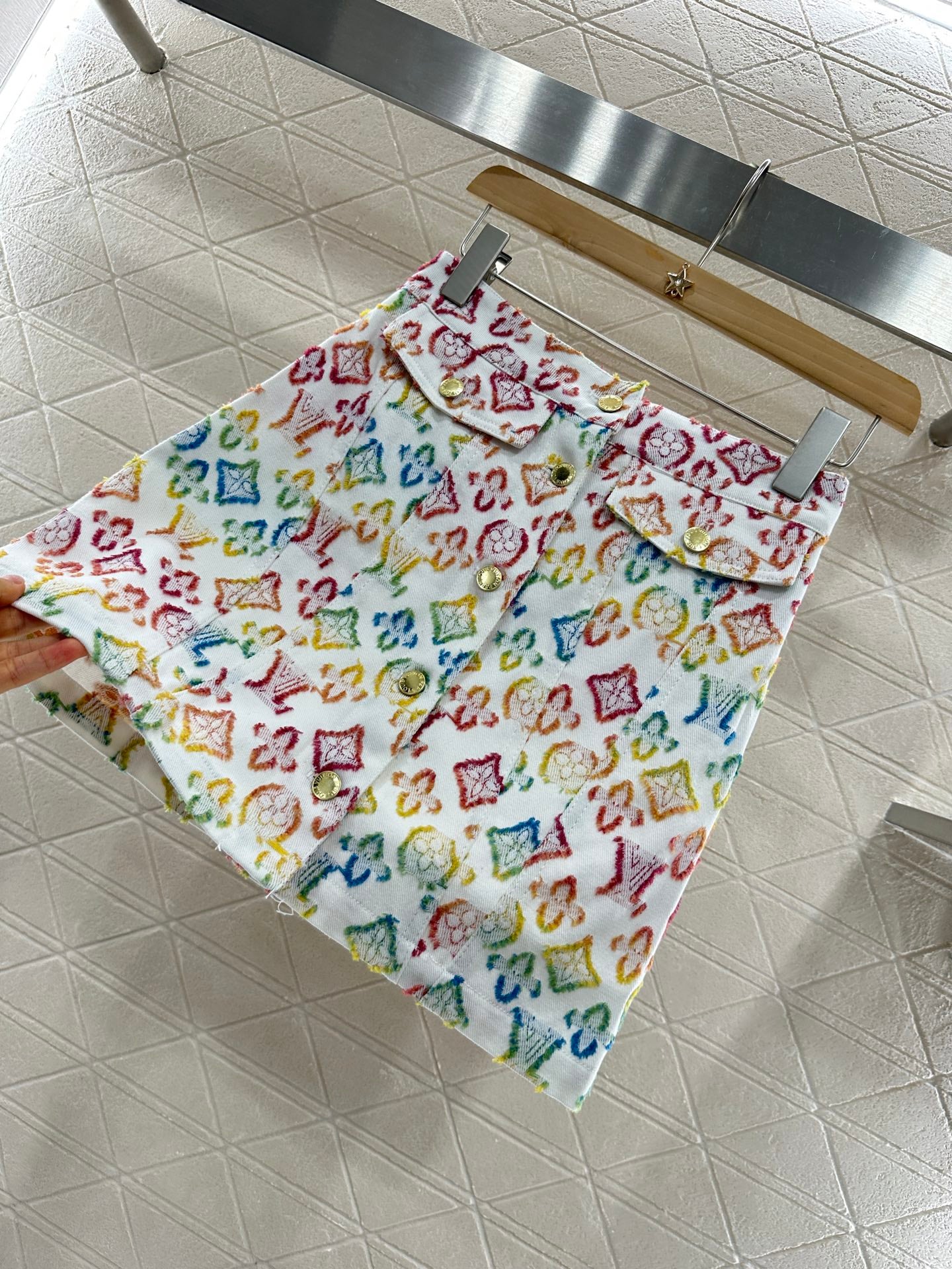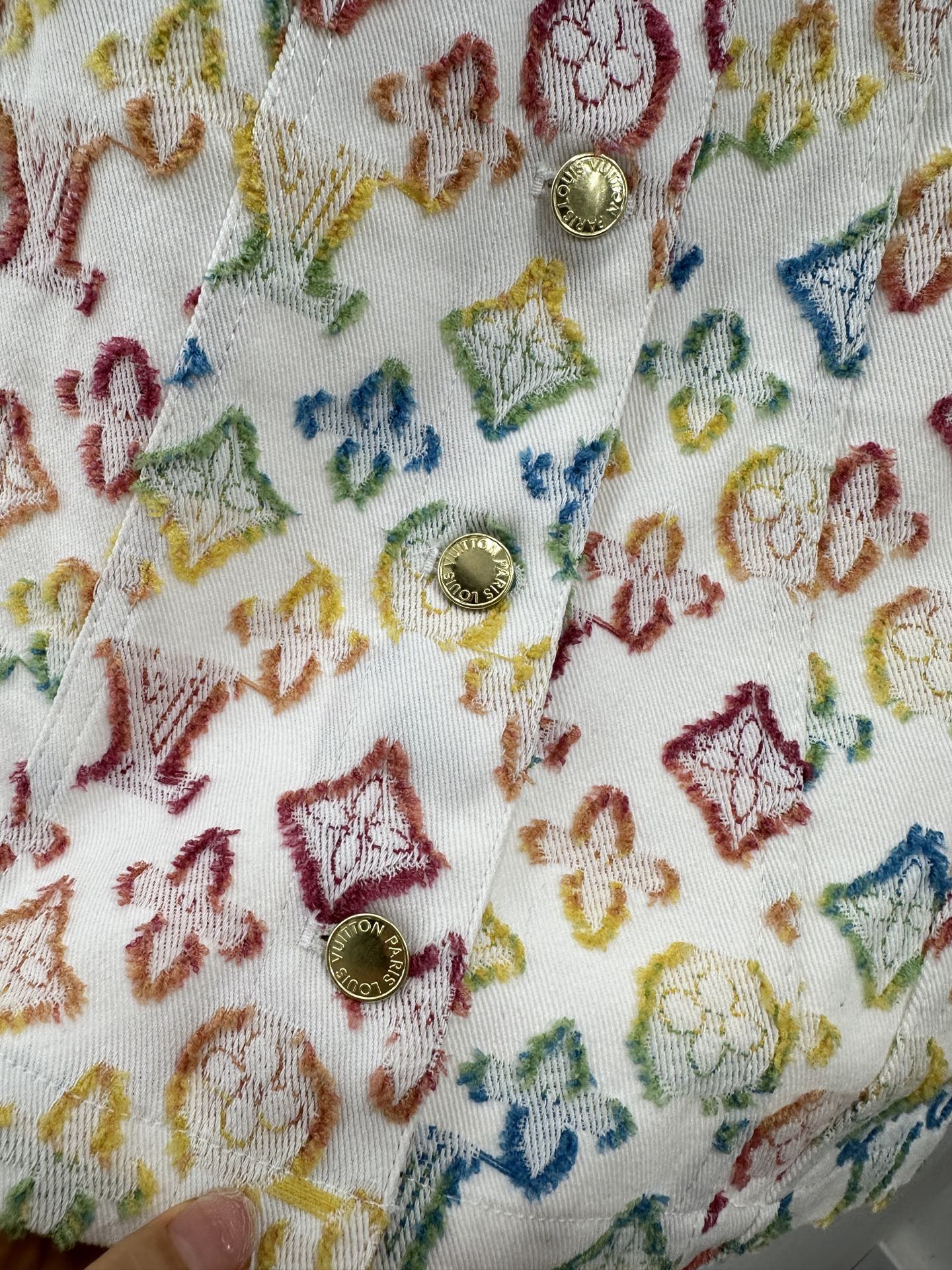 Customized YB twill cotton denim fabric Good breathability Soft and skin-friendly Lapel jacket jacket cut Chest flap pocket decorated with shiny gold buttons Luxurious and eye-catching Matching with the same series of micro A skirts All-over flower cutting craftsmanship Rainbow gradient contrast Lively and full of highlights Showing casual temperament Design details echo up and down Highlight the texture style Travel as a set Make the outfit more coordinated and advanced Fashionable and stylish Customized surface and accessories Look for the version High version