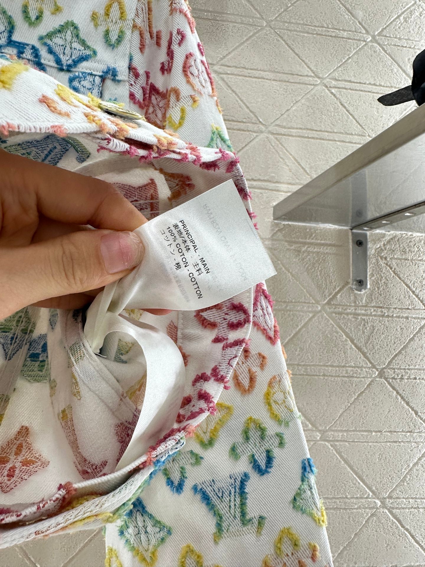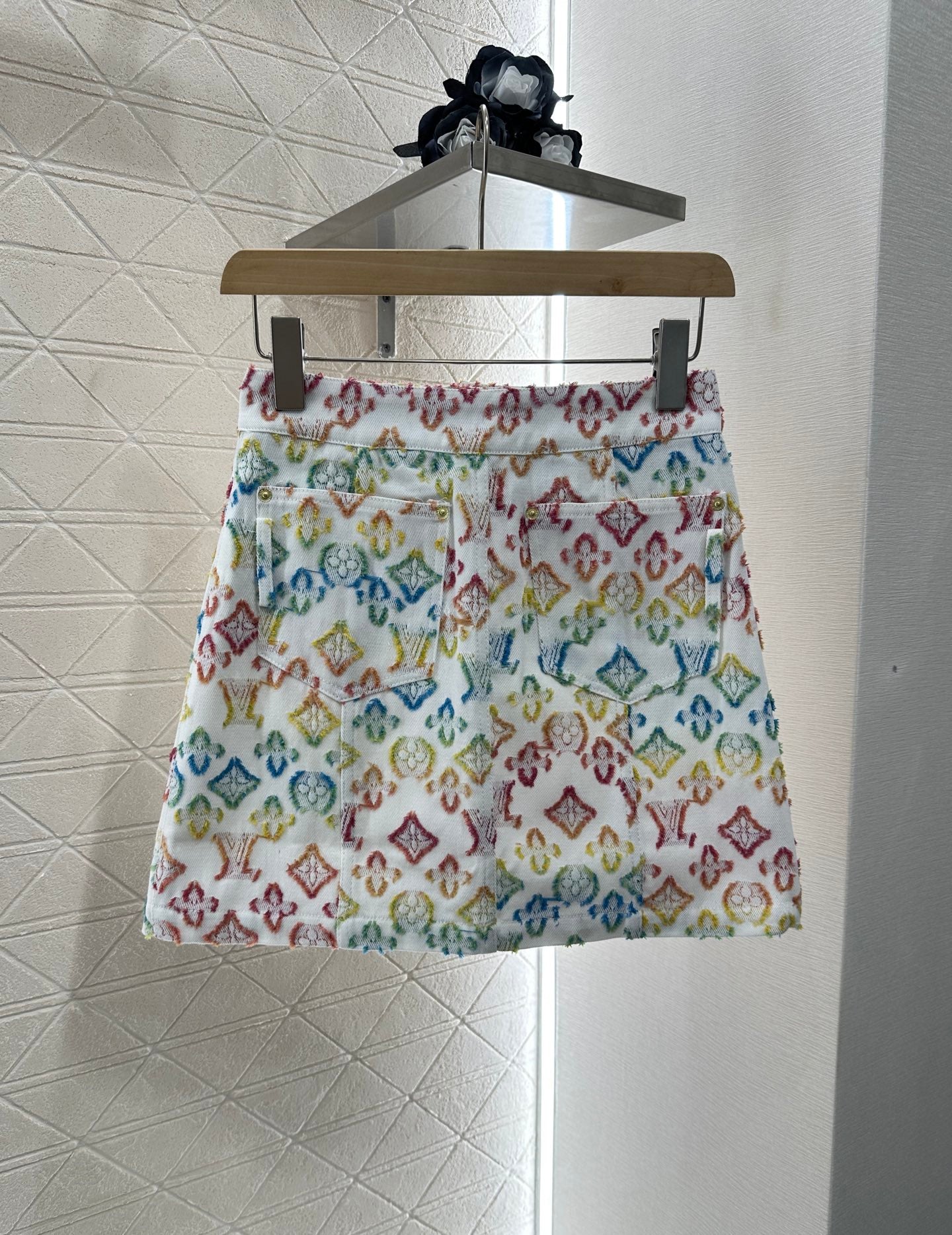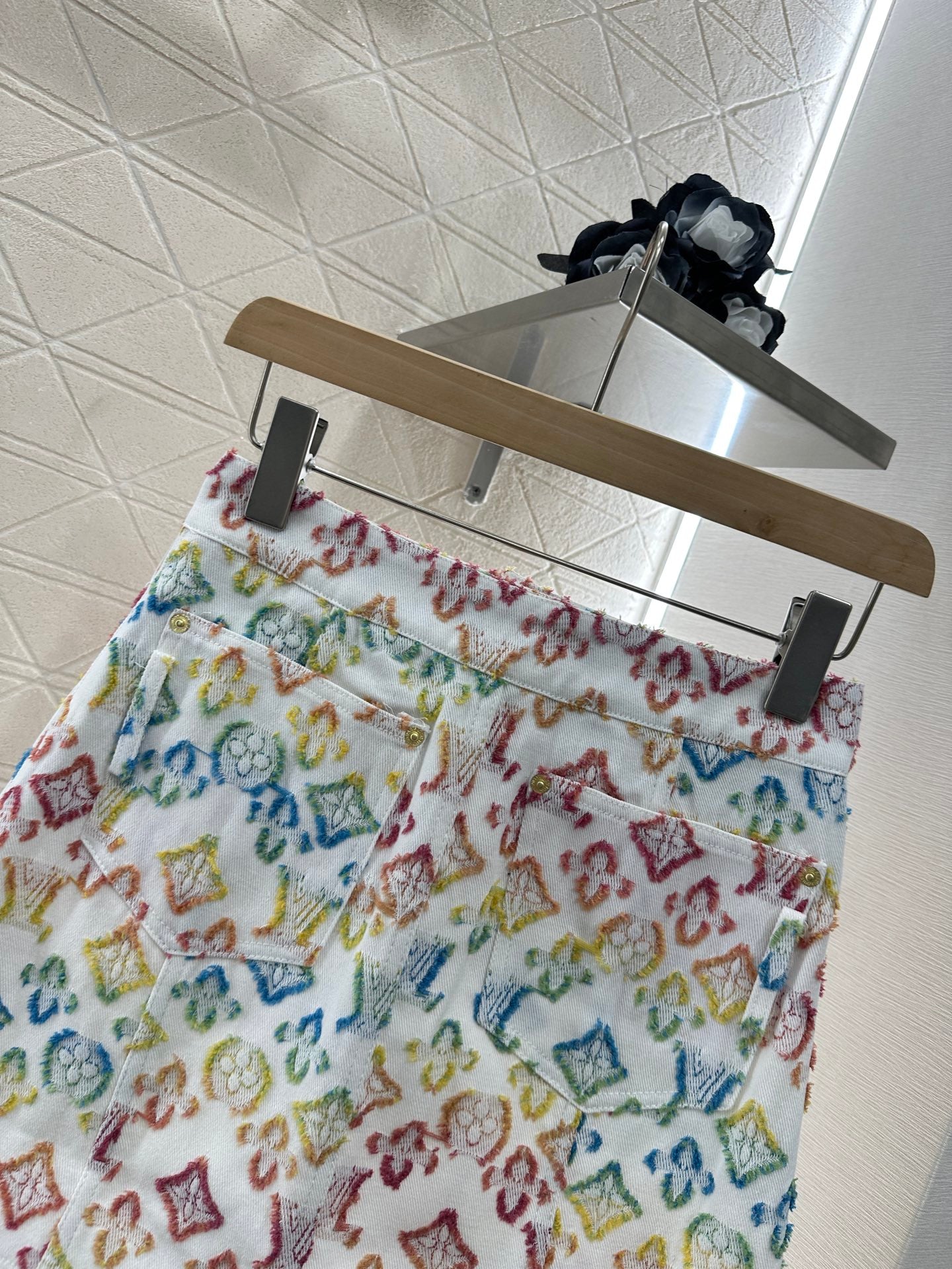 Customized YB twill cotton denim fabric Good breathability Soft and skin-friendly Lapel jacket jacket cut Chest flap pocket decorated with shiny gold buttons Luxurious and eye-catching Matching with the same series of micro A skirts All-over flower cutting craftsmanship Rainbow gradient contrast Lively and full of highlights Showing casual temperament Design details echo up and down Highlight the texture style Travel as a set Make the outfit more coordinated and advanced Fashionable and stylish Customized surface and accessories Look for the version High version