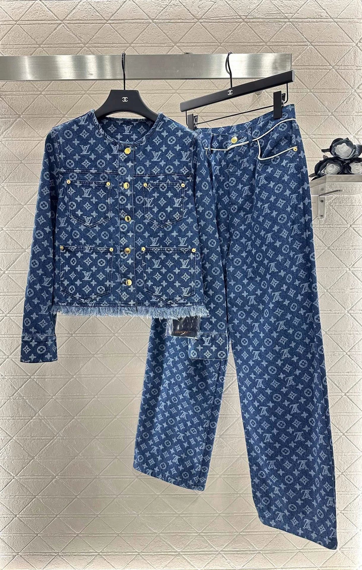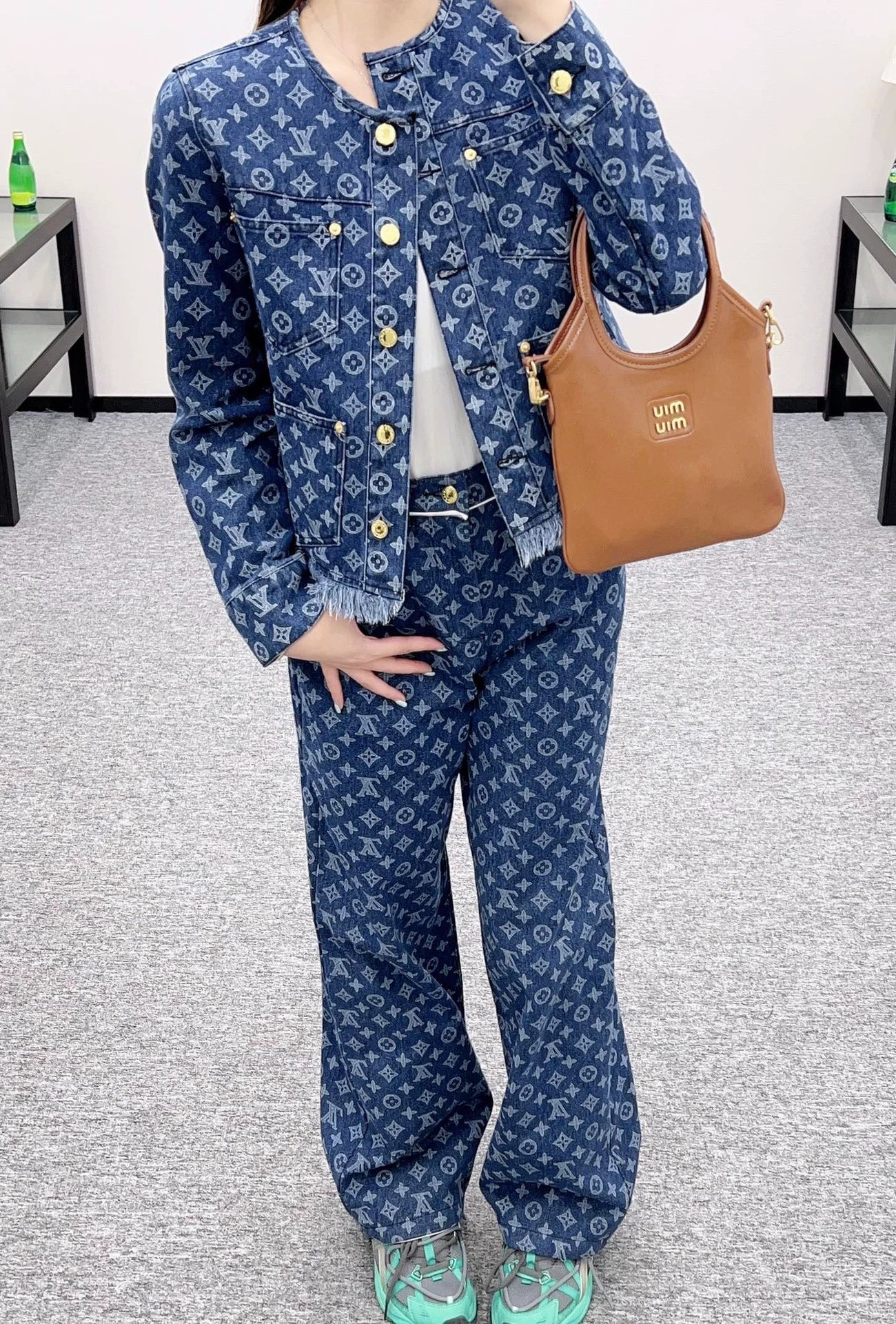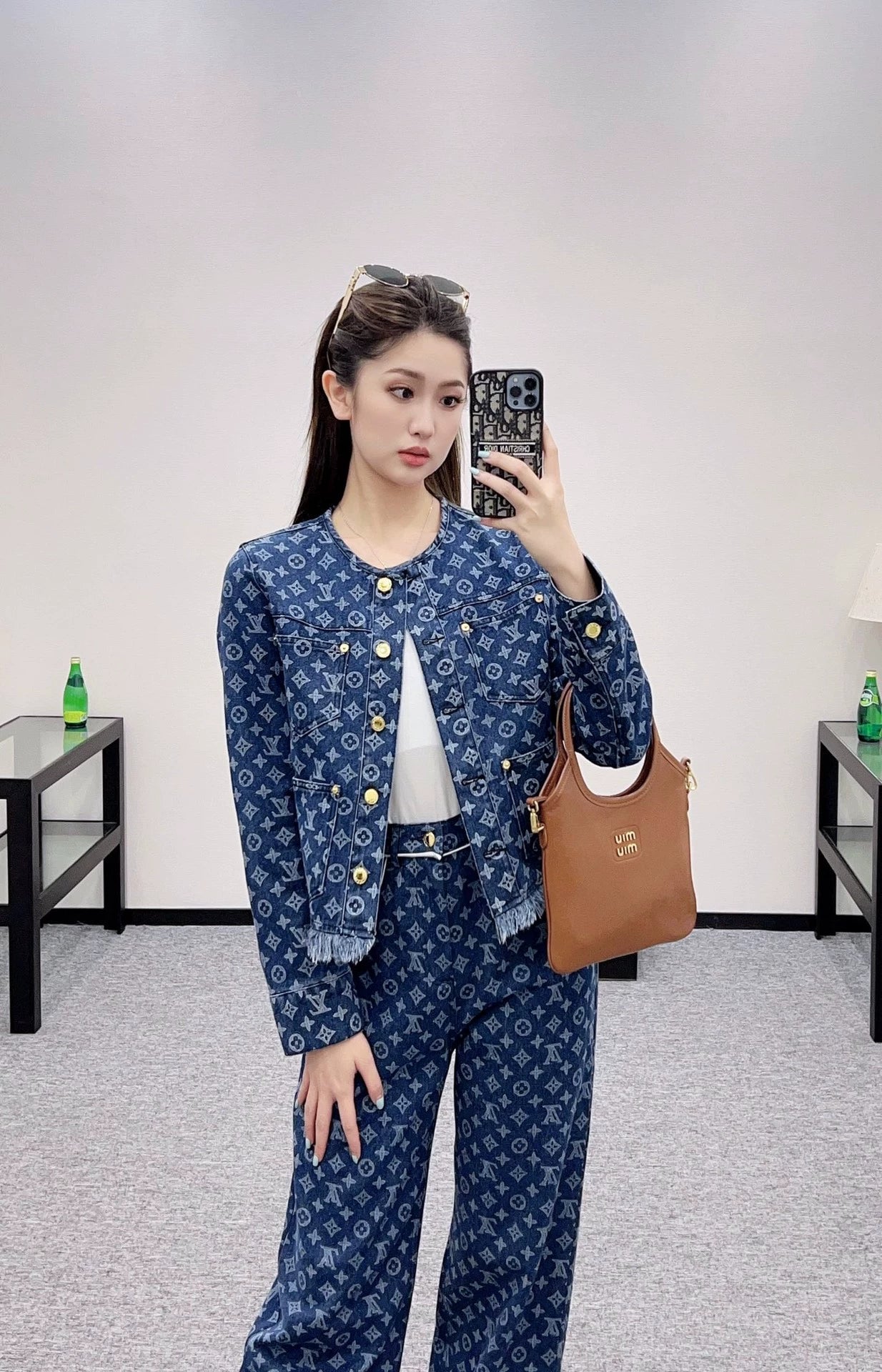 Custom YB twill cotton denim, multiple washes for a crisp, textured look. Round neck, straight shoulders, and symmetrical pockets complement the essential silhouette for a sophisticated look. The all-over jacquard pattern features four-leaf clover and monogram elements. Interspersed with logo plackets and a leather patch at the back collar, the jacket features a branded design. Fringed tassels accent the hem. Paired with matching wide-leg straight-leg trousers, the details complement this look. Stylish and stylish, this jacket is perfect as a set or worn alone. Suitable for all seasons. Custom fabrics and trims. Look for the exact version. High-quality.
