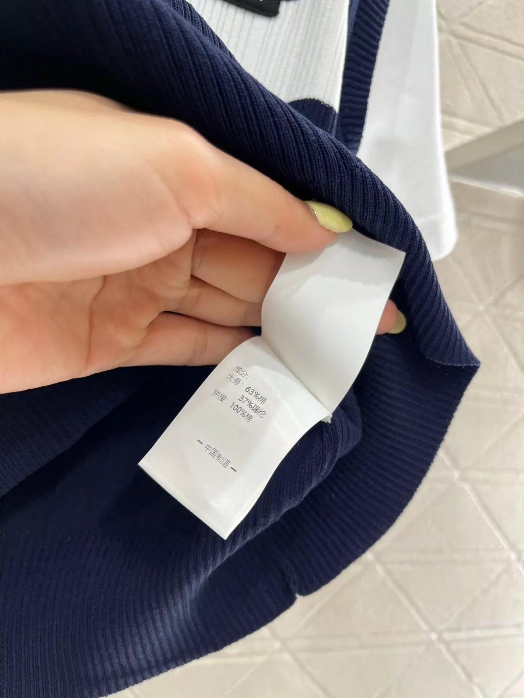 Cotton material, comfortable and soft, full of stretch, round neck, short sleeves, lined with a ➕V-neck knitted tank top, creating a false two-piece version, the inner lining is exposed at the neckline and cuffs, and the outer layer creates a clash of colors, two colors of stripes, the overall design is rich in layers, and the chest embellished with an embroidered logo, the garment is comfortable and elastic, adding a lively atmosphere to the outfit, without the need for any intentional embellishment.