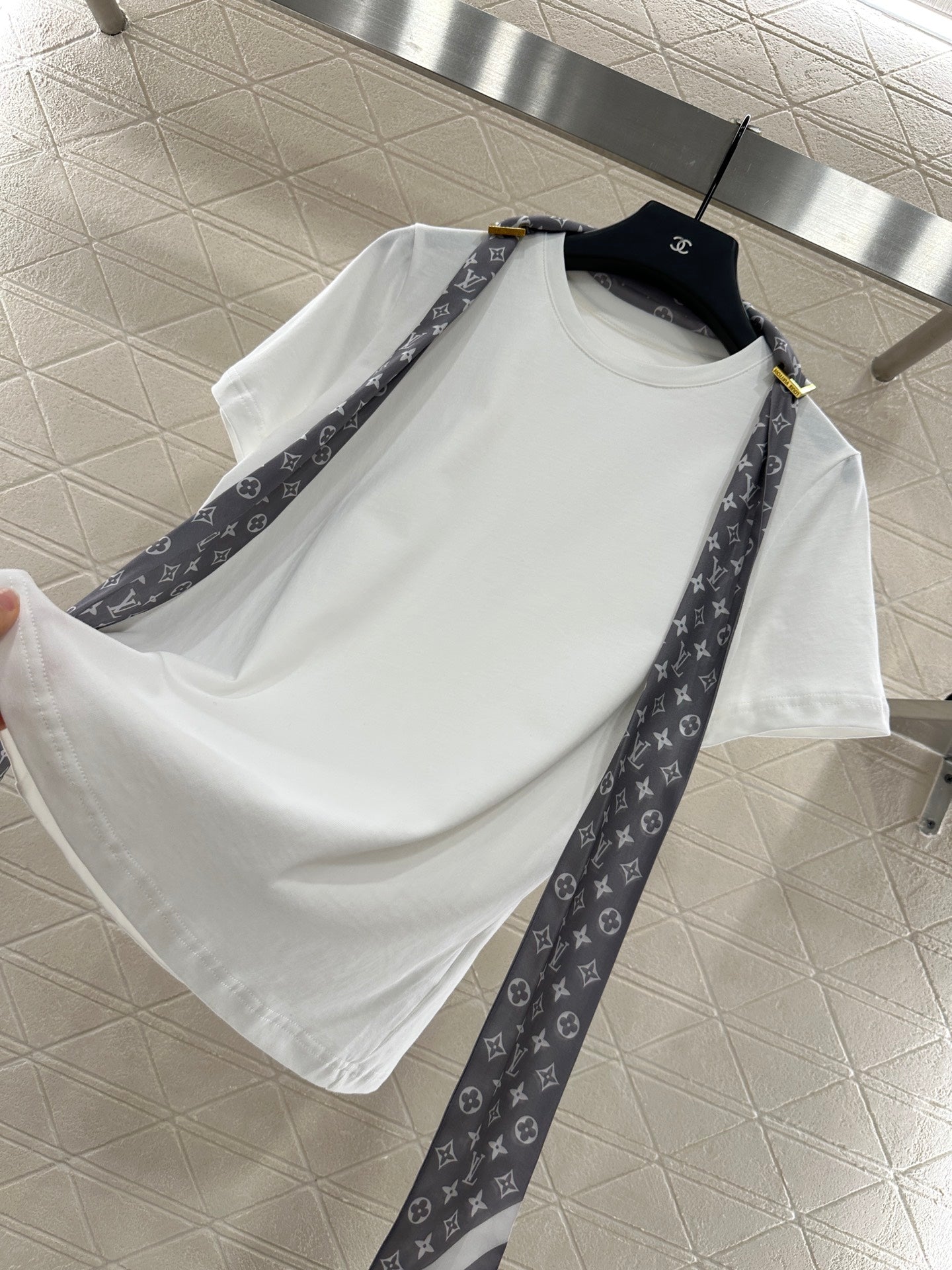 Customized YB twill cotton material, breathable and comfortable, full of texture, regular short-sleeved T-shirt cut, highlighting the brand style, made of heavy cotton, slightly elastic, showing a slimming visual effect, the front of the collar is decorated with metal letter chains as a design highlight, the scarf is fixed with buttons on both sides of the neckline, it can be loosened or tied to match your style, with the exposed letter logo decoration, it highlights the high-end style, it is fashionable to wear alone or with an inner layer, customized surface and accessories, look for the version, high version
