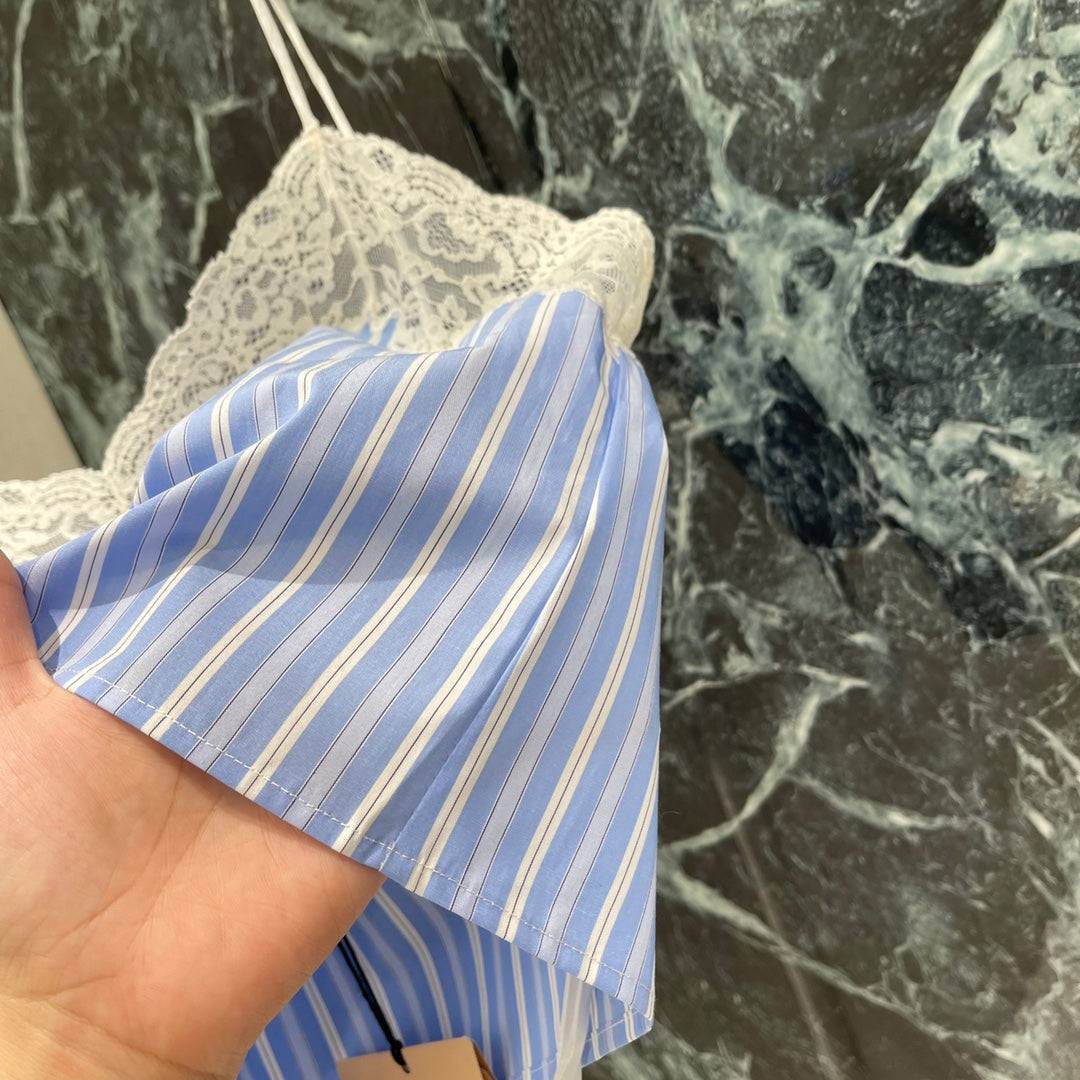 The whole body is interwoven with vertical blue and white stripes, which is loose and fashionable with a sense of literary youth and old money. The chest is decorated with clear water-soluble lace, which is sexy and charming. The upper body is elegant and lazy, full of holiday feeling. It can be worn at home or outside👌.